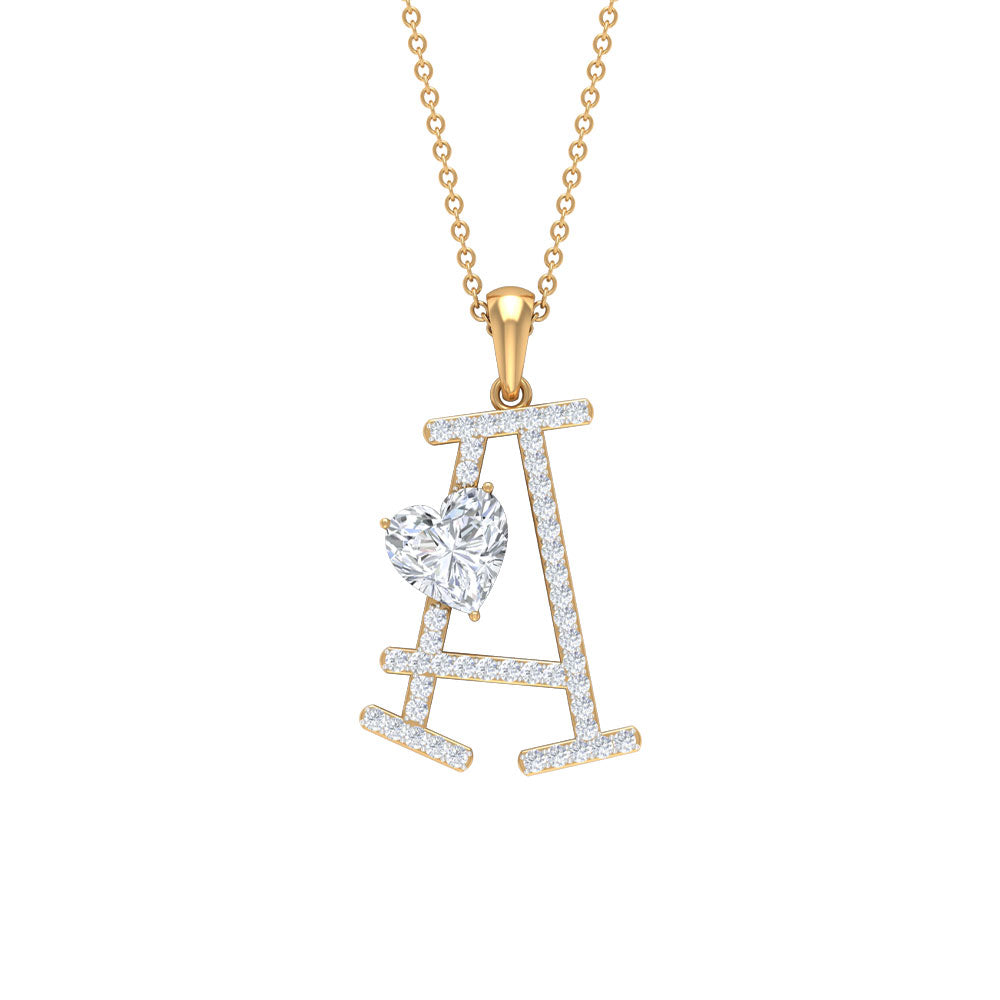 Personalize your style with our Letter A Pendant Necklace. A 7 MM Heart Shape Zircon gemstone is slantly placed over the A Alphabet, encased with petite Zircon gemstones. Capturing your individuality and sophistication, this sparkling Cubic Zirconia Pendant adds a touch of brilliance to your look. Whether worn for yourself or as a thoughtful gift, this Pendant Necklace is a chic expression of your identity and style.