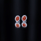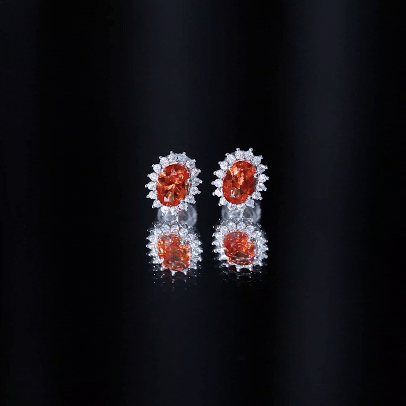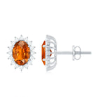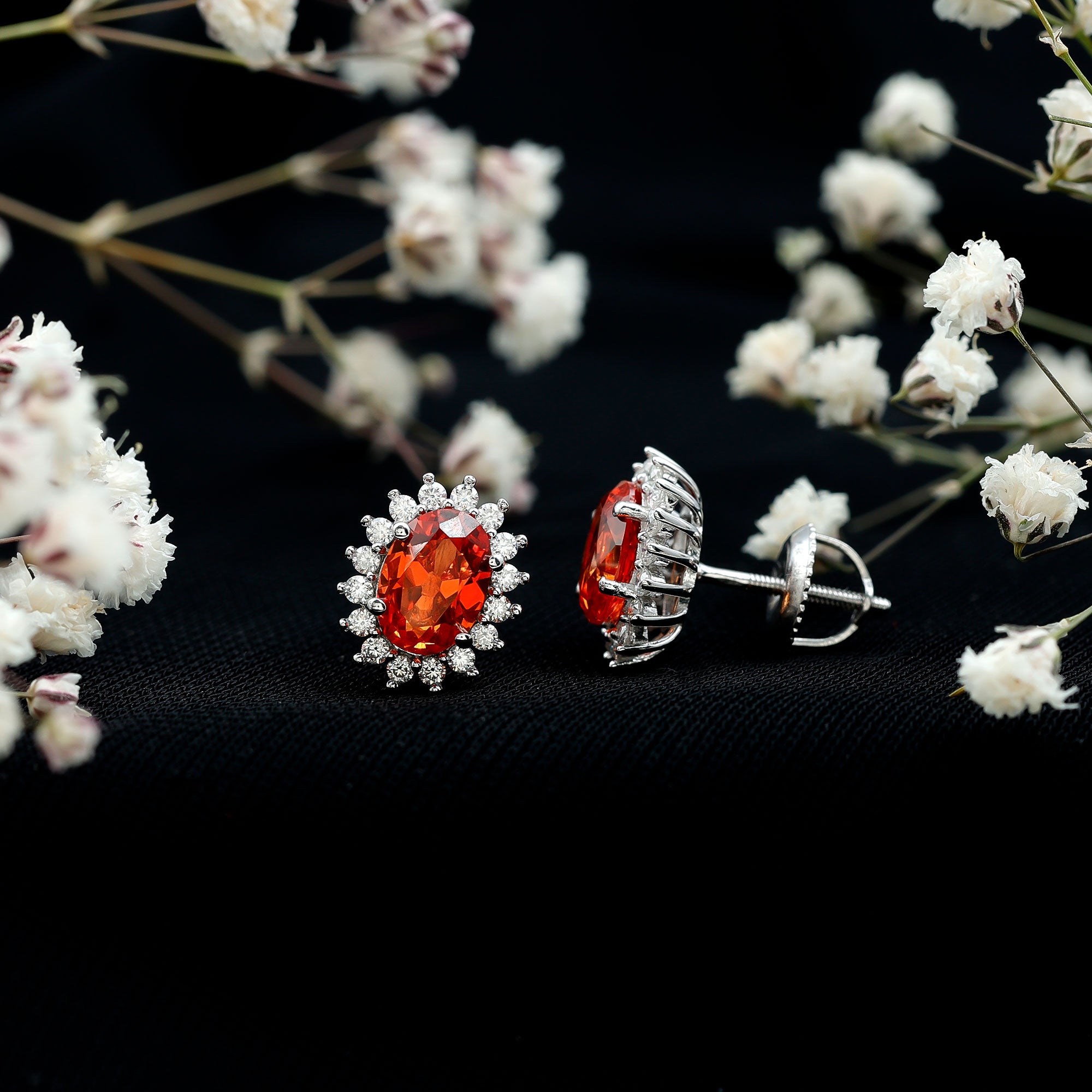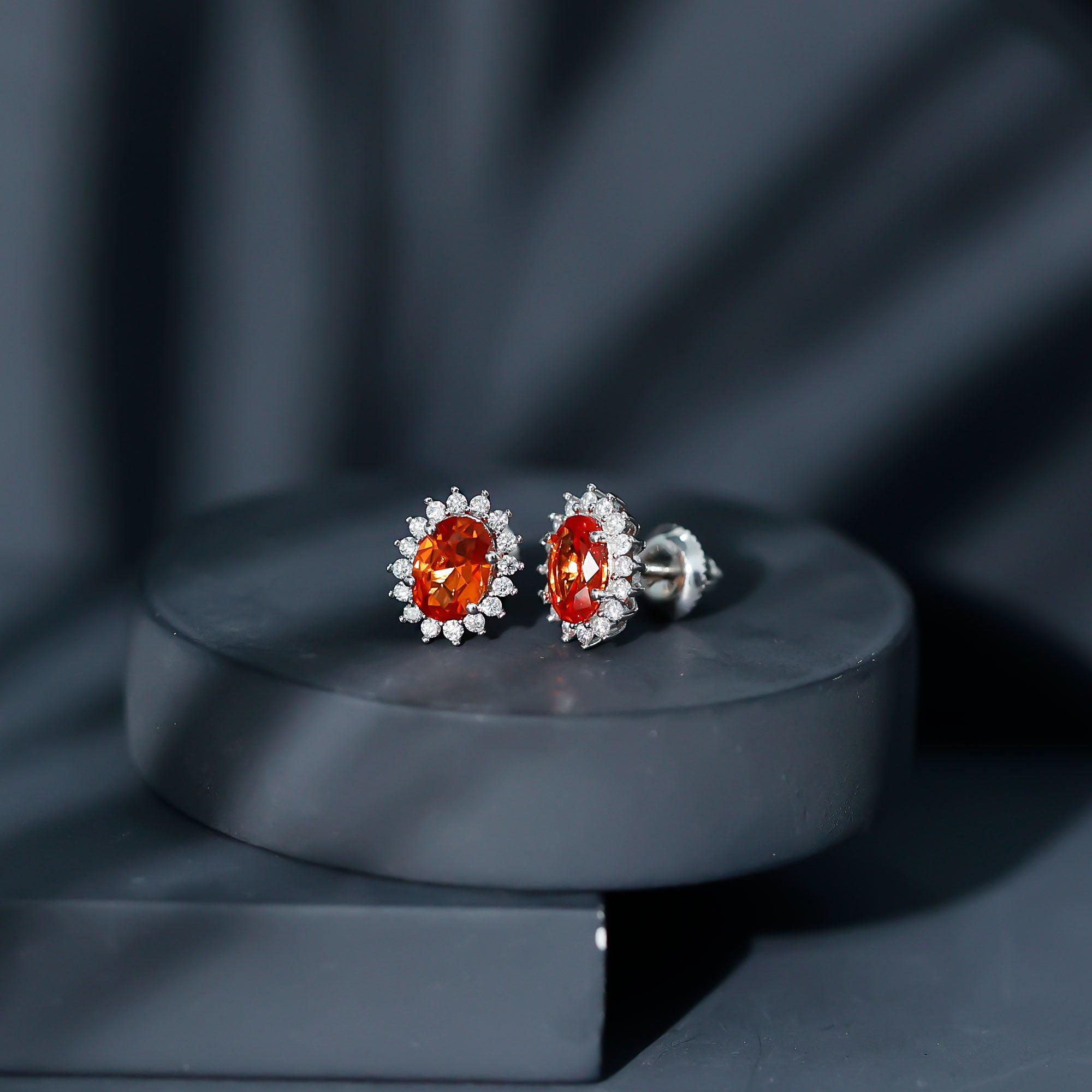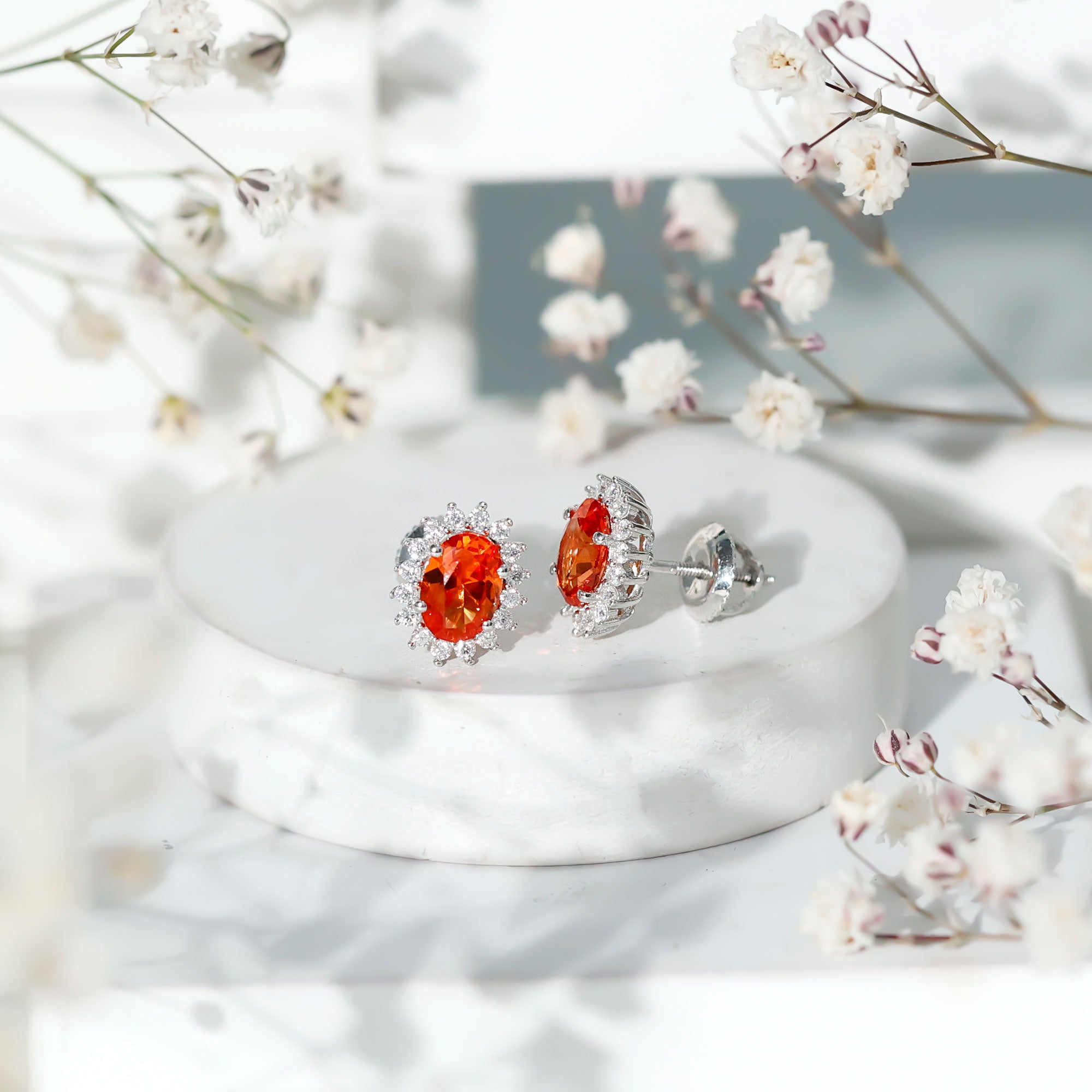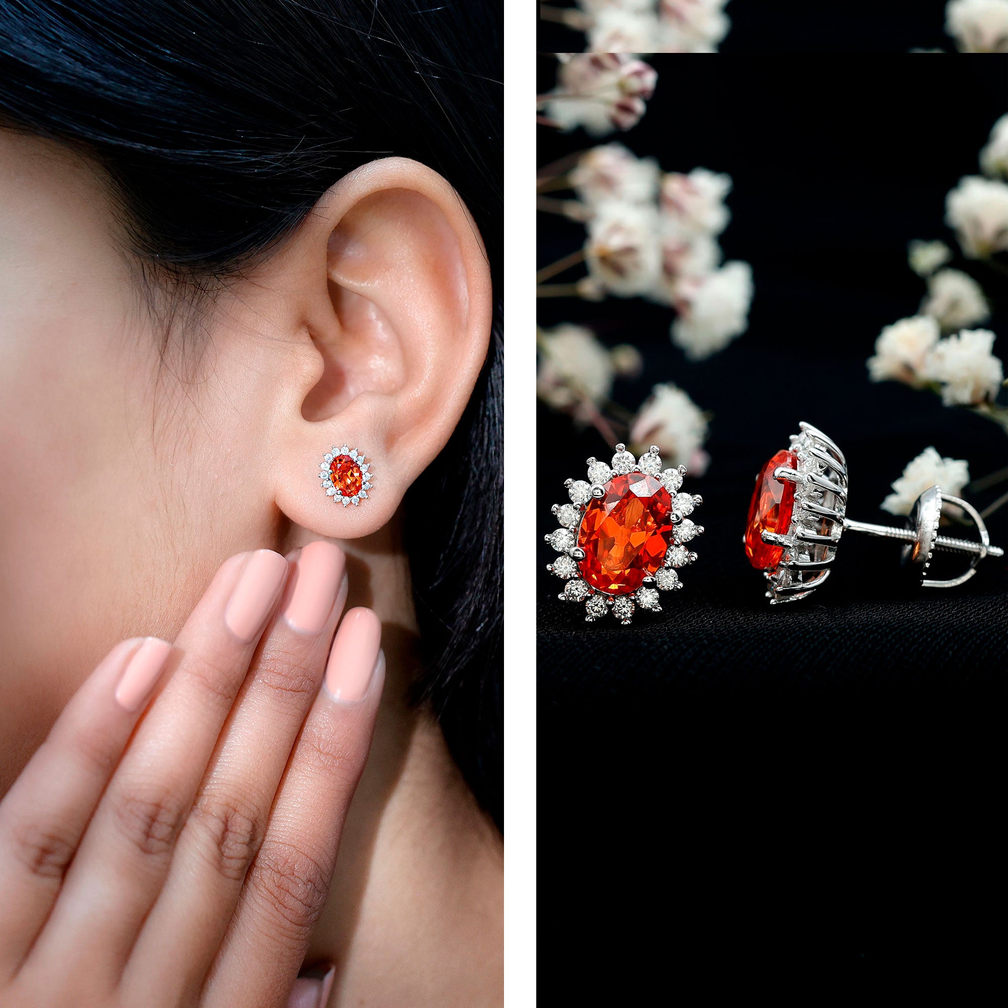 Add a vibrant hue to your outfit with these Lab Grown Orange Sapphire Stud Earrings, precisely crafted with white gold-plated silver for your special days. The earrings feature 5X7 MM Oval Shape Lab Created Orange Sapphire securely placed in Prong Setting encircled with smaller Round Moissanites that will enhance the beauty of these earrings. These Oval Stud Earrings will adorn your ears and complete your look for the special days. These Large Stud Earrings will be delivered to you in a premium quality packaging with a certificate of authenticity to ensure the quality of the gemstones embedded in the earrings.