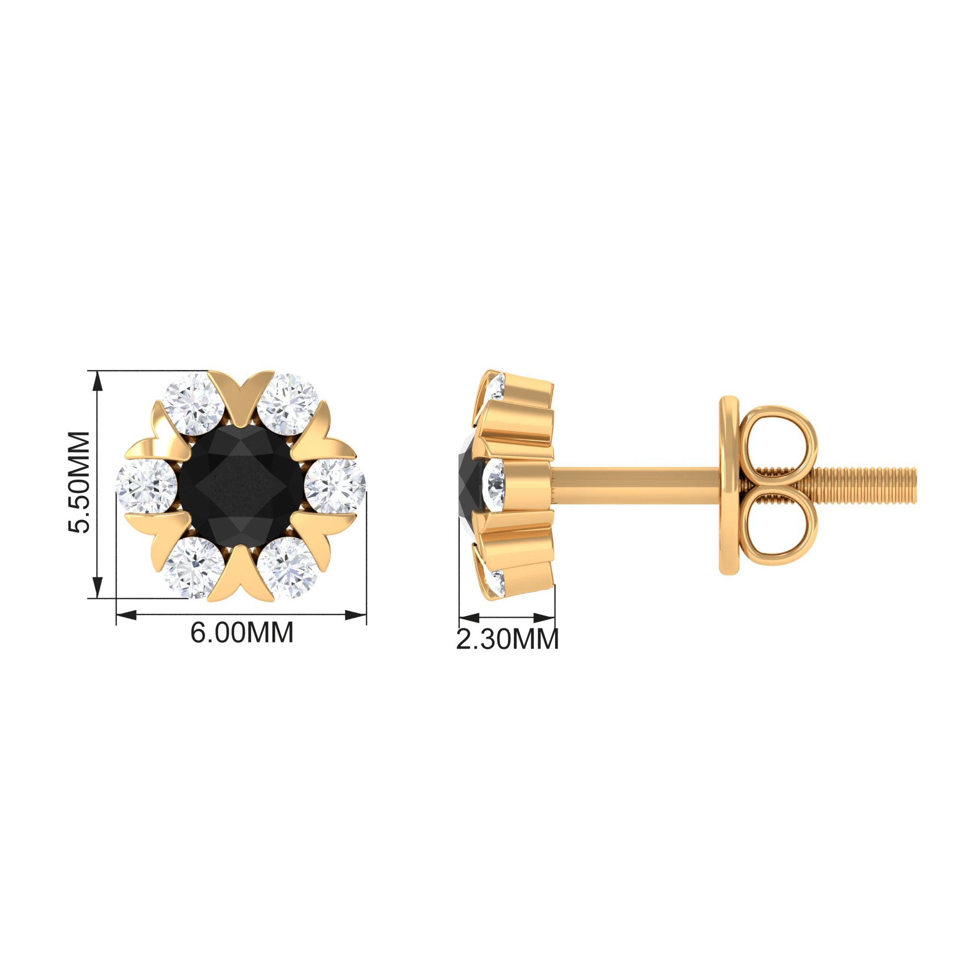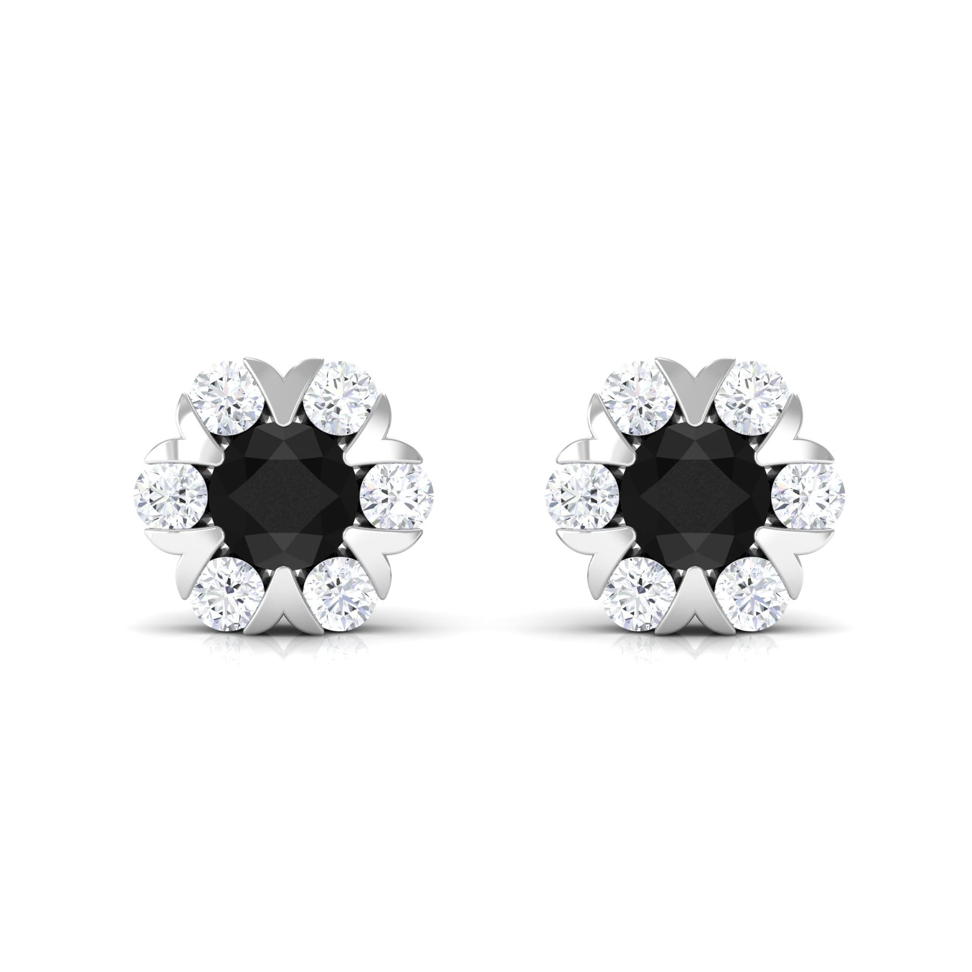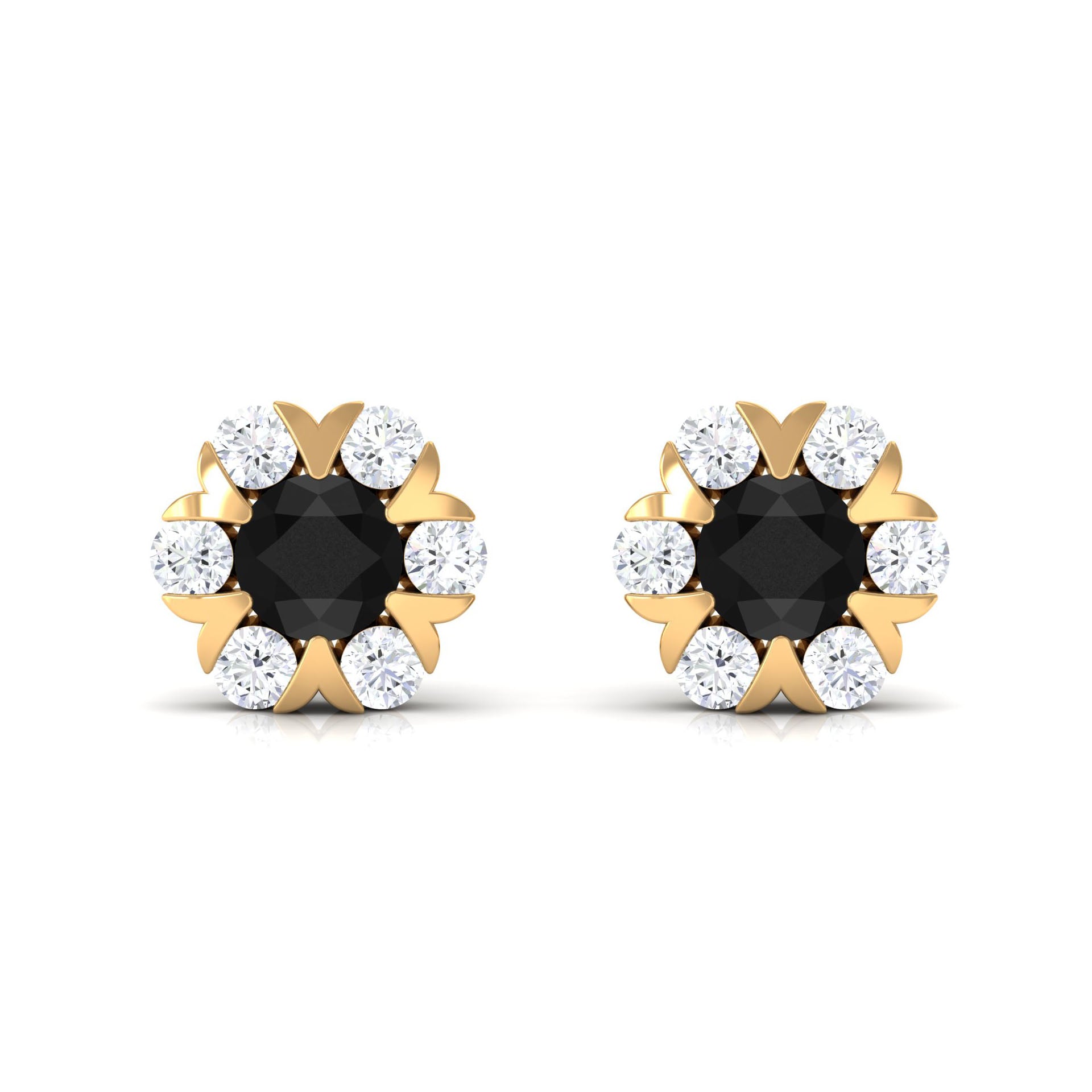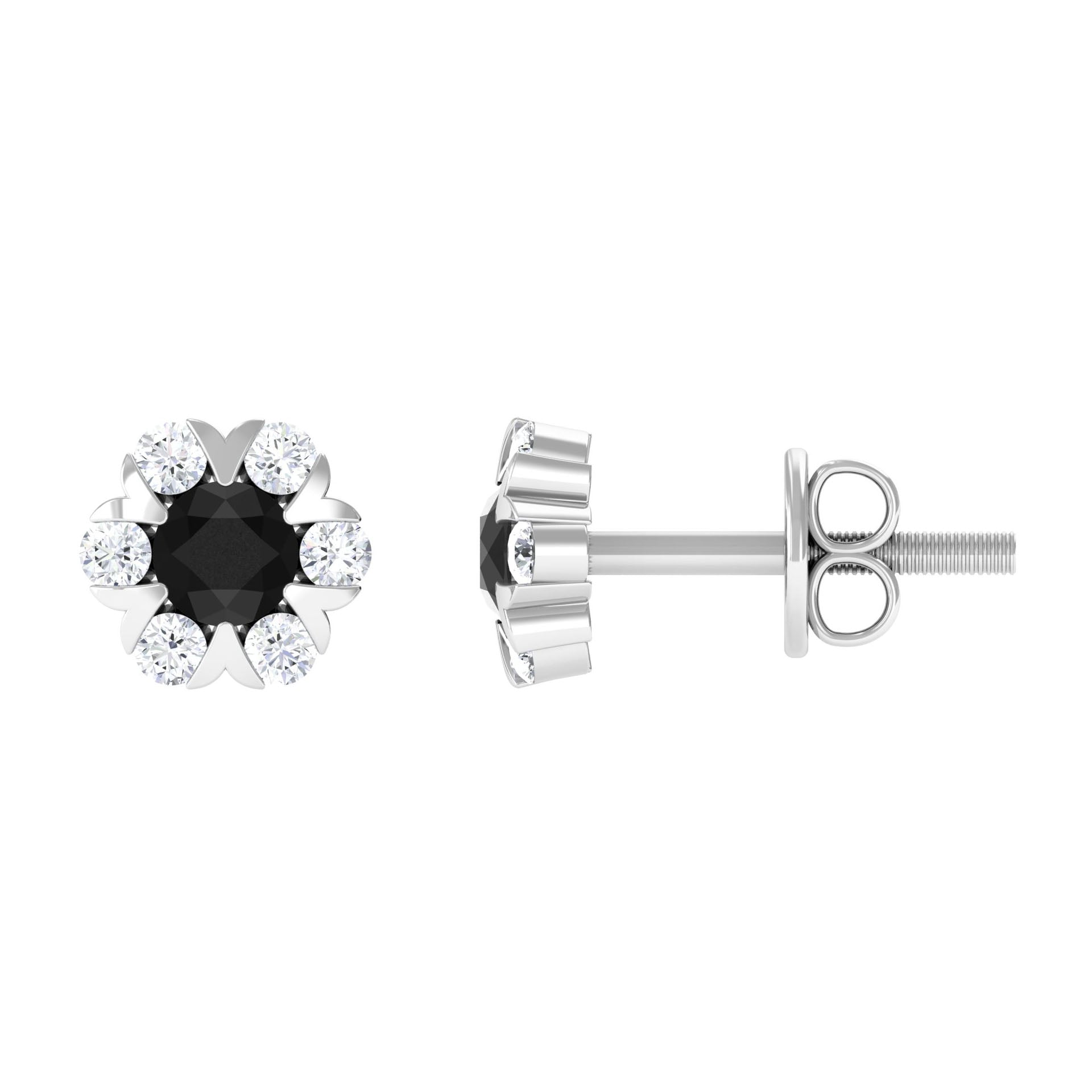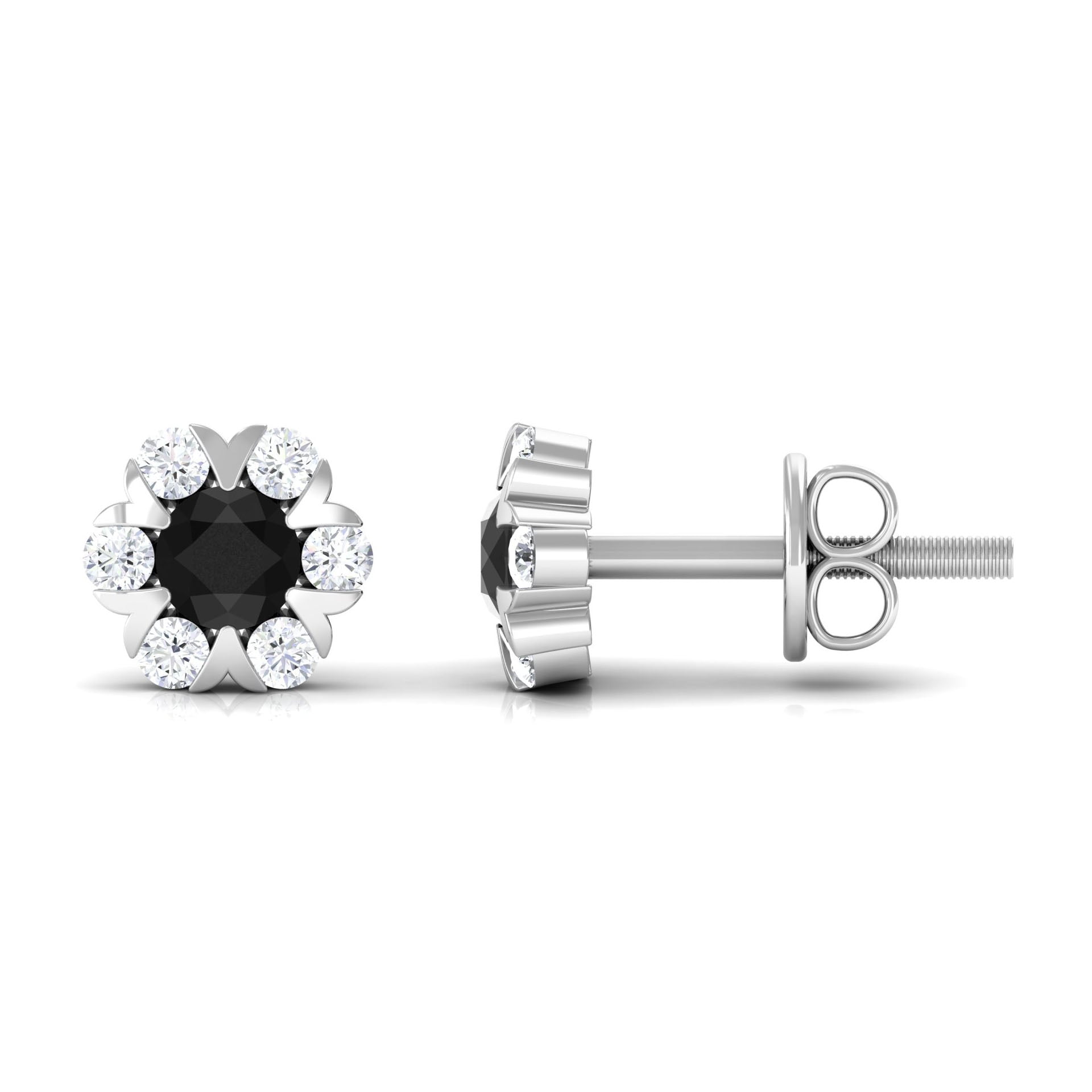Introducing a pair of timeless Vintage Floral Earrings, meticulously crafted with care. These earrings feature Round Shape Lab Created Black Diamond and Diamond stones, delicately placed in a mesmerizing Designer Setting. Specifically designed as Stud Earrings for Women, they exude elegance and grace.