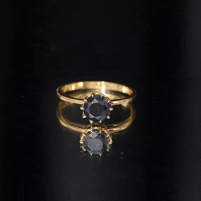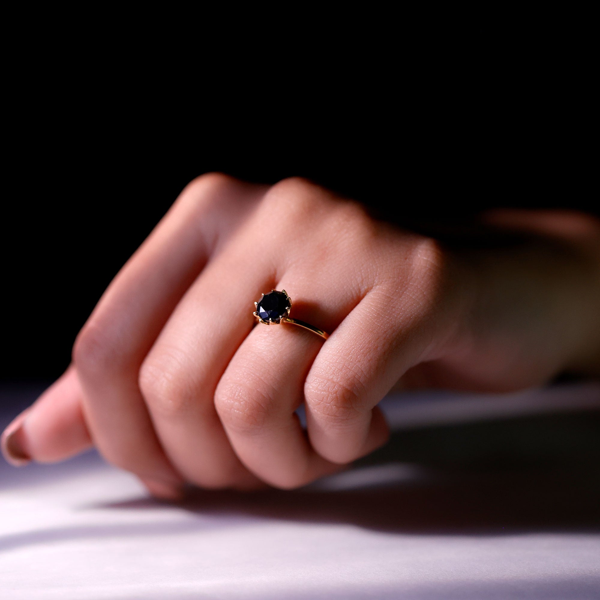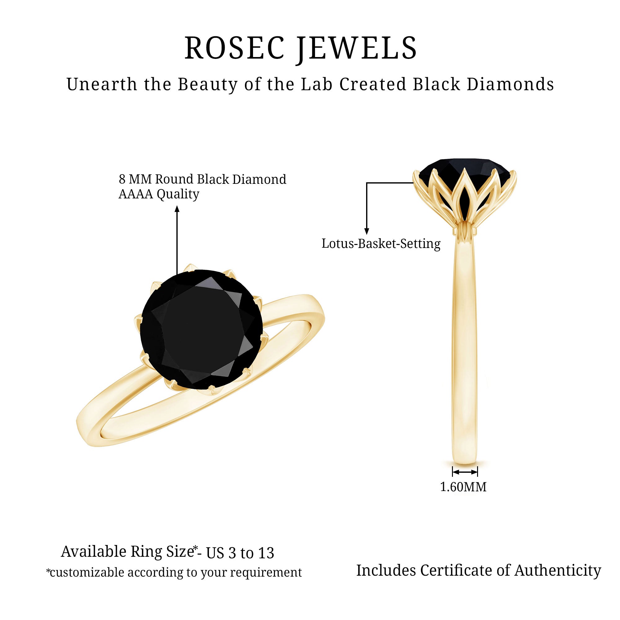 If youre looking for a simple yet beautiful engagement ring, consider this lovely option adorned with a round-cut created black diamond gemstone. The solitaire design of this ring is set in a lotus basket setting, showcasing the gemstones beauty. Crafted from solid gold, this created black diamond ring is sure to make a lasting impression when you propose to your special someone.