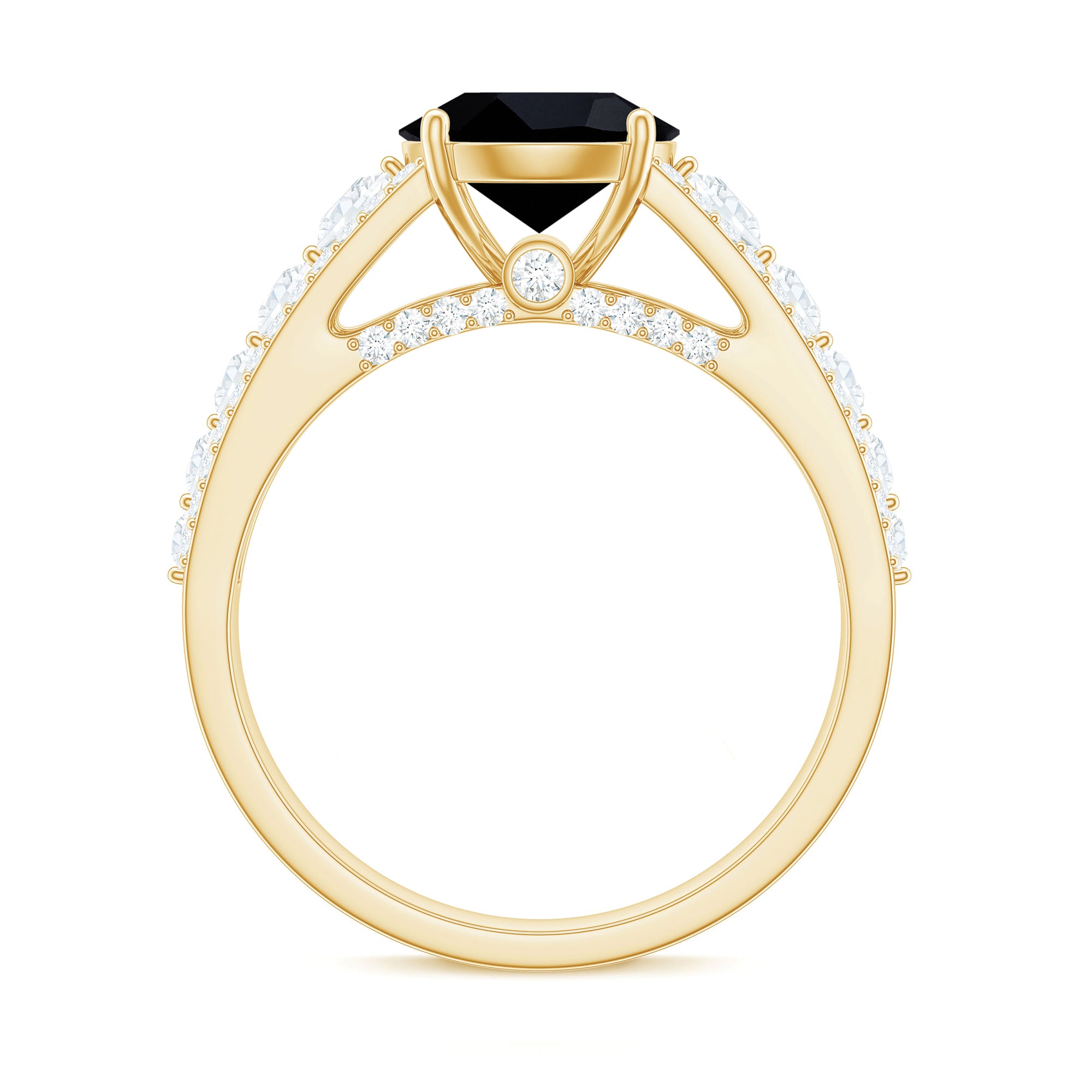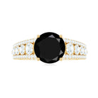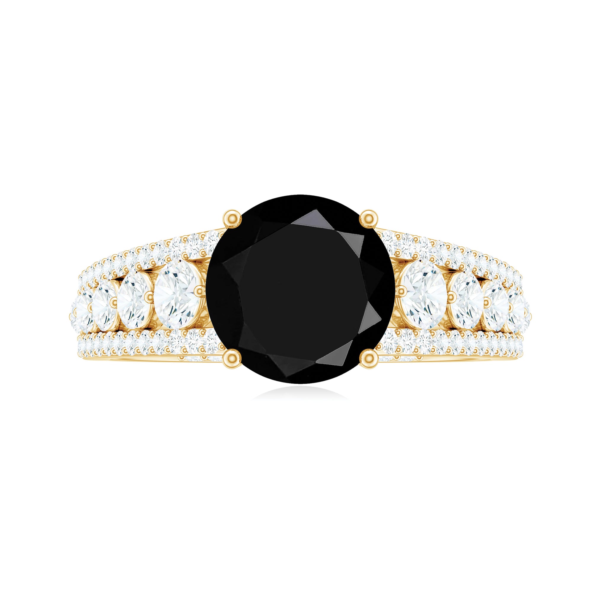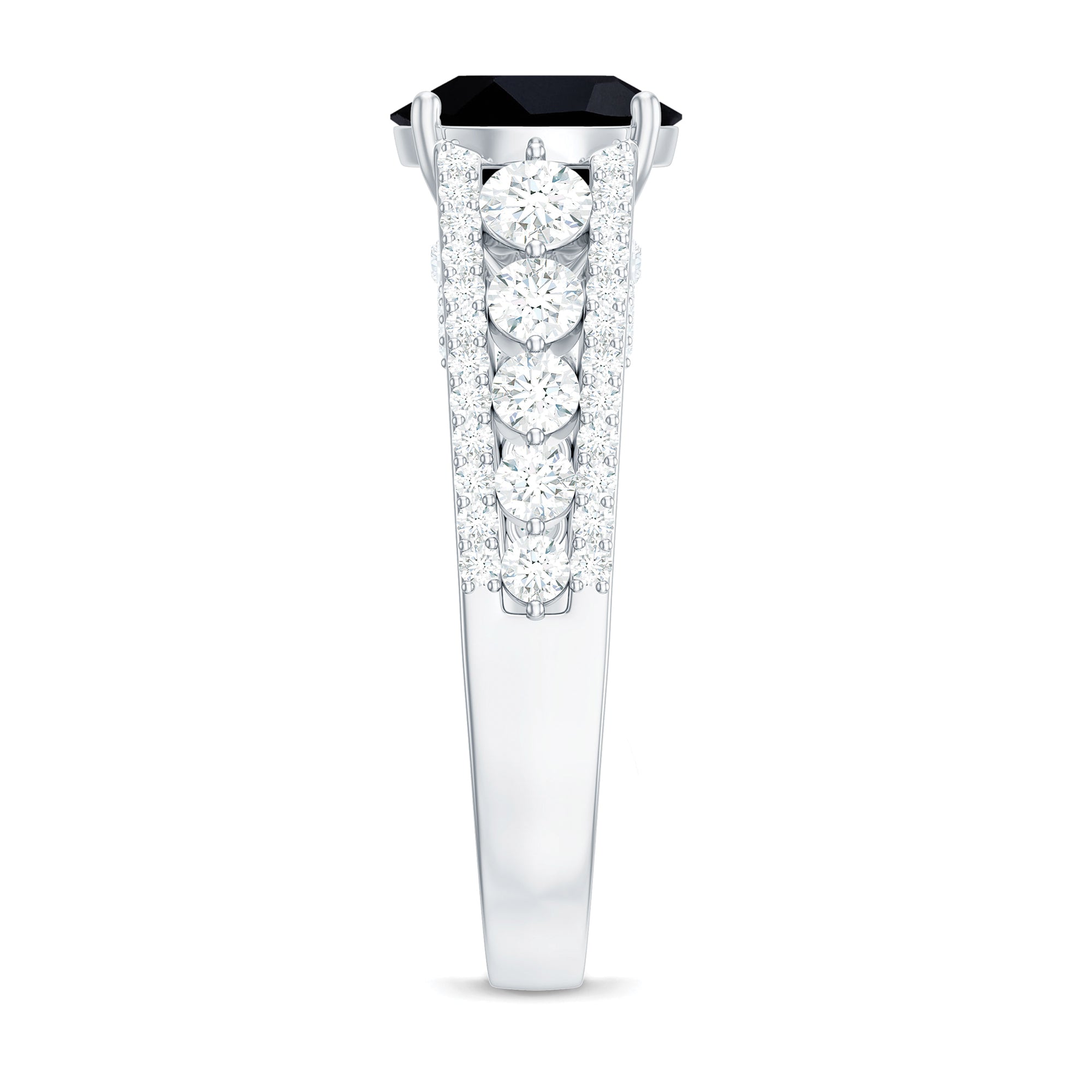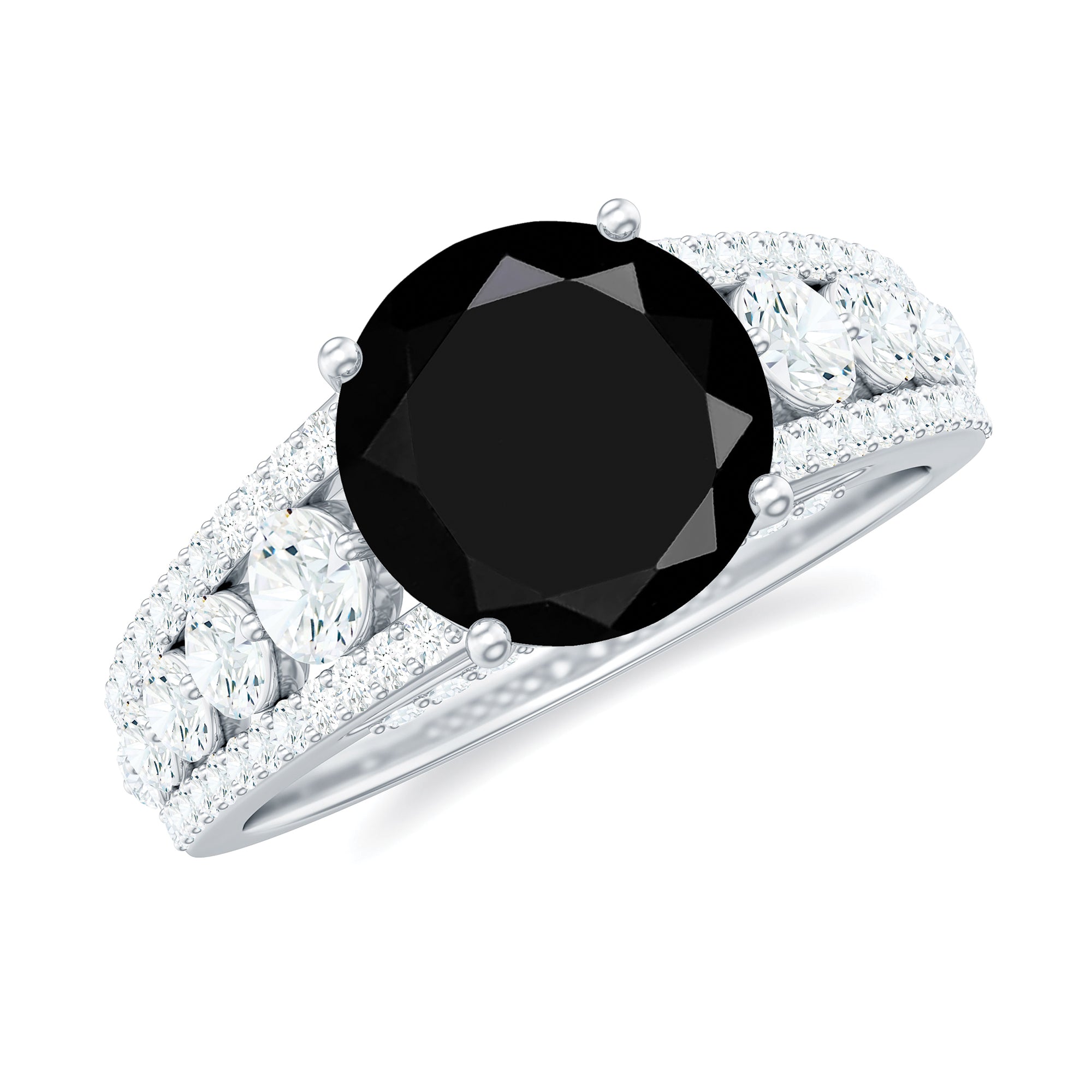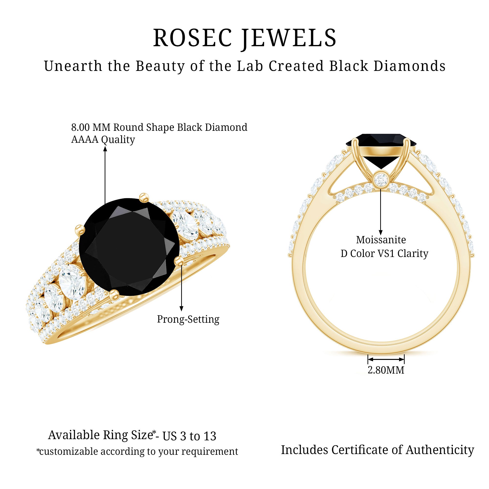 Radiate regal elegance with this enchanting Engagement Ring, featuring a brilliant Round Cut Lab Created Black Diamond as its captivating centerpiece. The allure of this ring is enhanced by shimmering Moissanite stones delicately set on the sides in an Accent Setting.