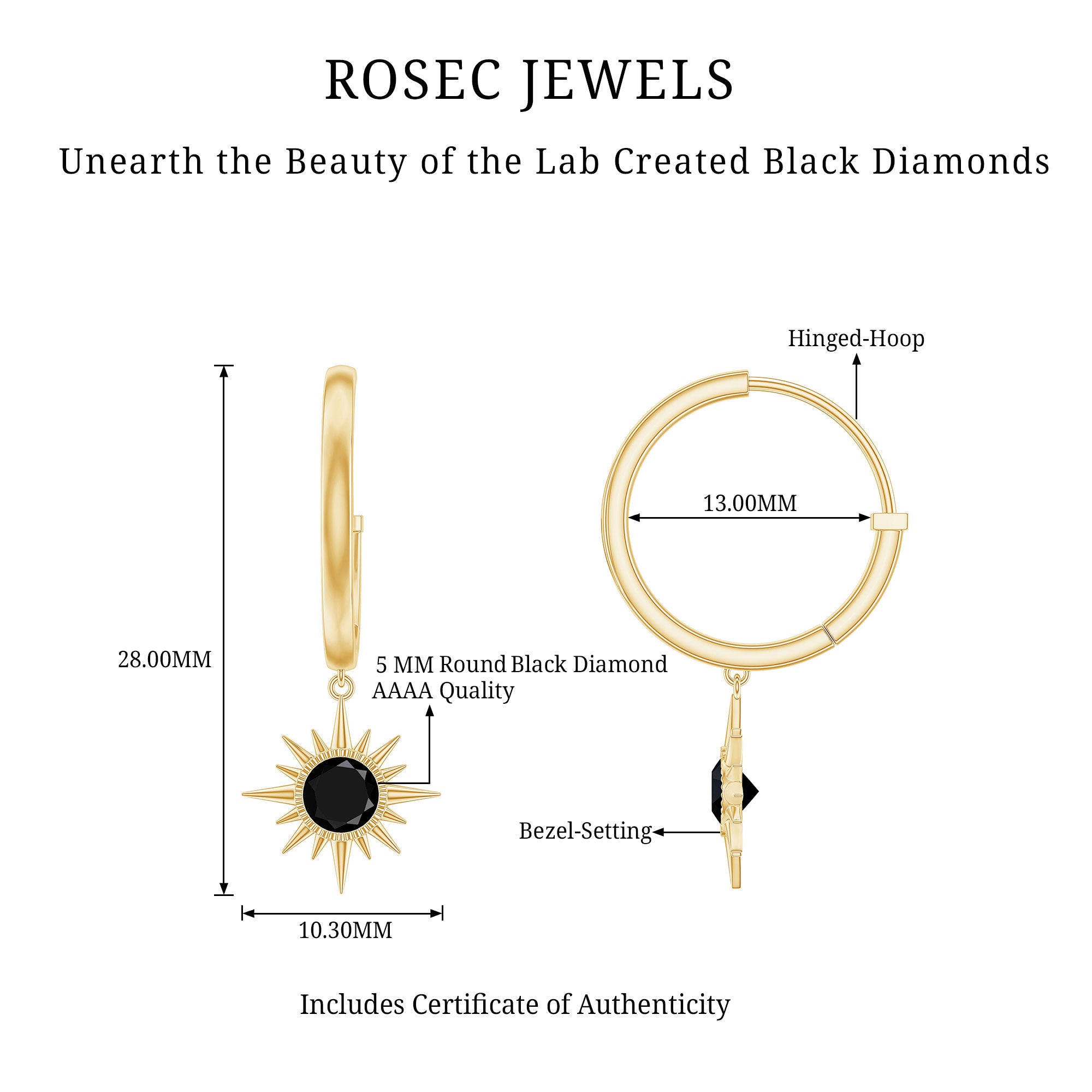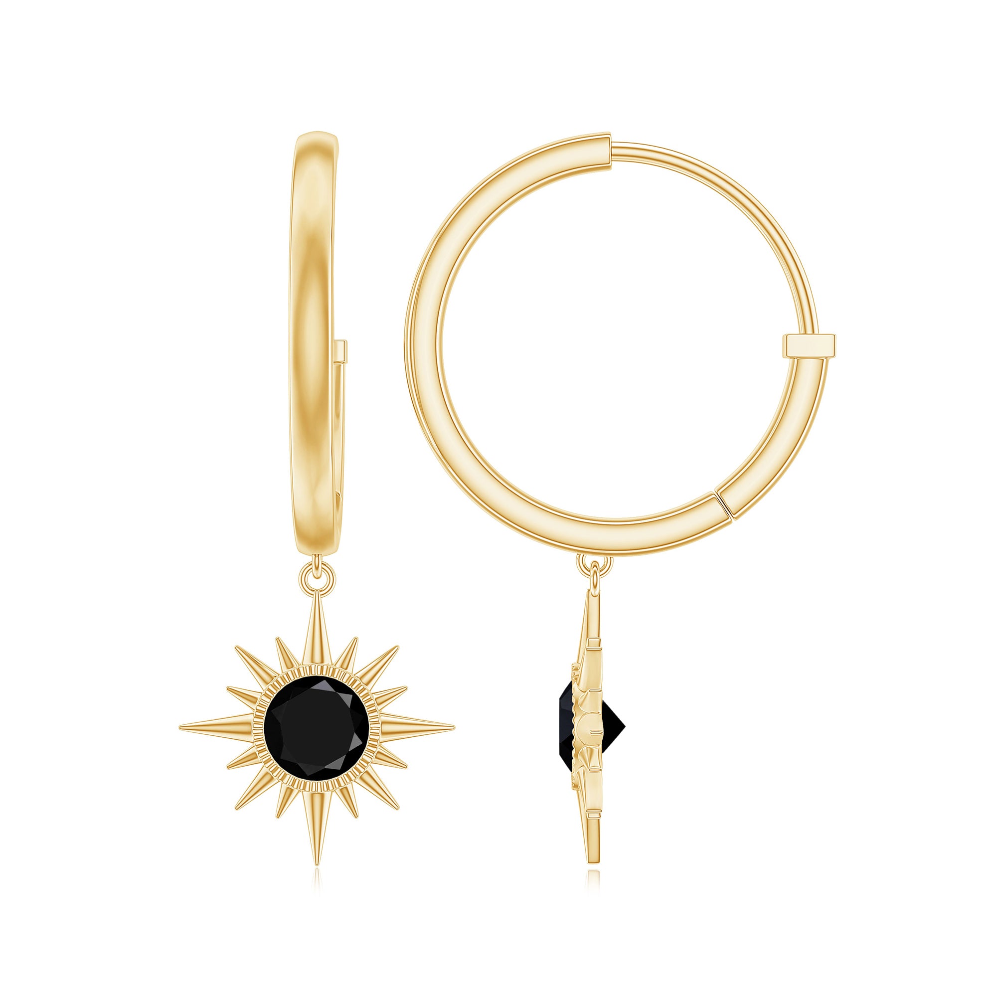 Dark, mysterious, and full of character, the Lab Created Black Diamond Drop Earrings are designed for women who appreciate jewelry with a bold yet elegant presence. Each earring features a round 5 MM lab created black diamond of AAAA quality, set in bezel setting. The stones dangle from sleek hinged hoops, allowing them to catch light naturally with movement, creating subtle flashes of shine. The surrounding sunburst-like pattern adds a delicate touch of artistry, giving the Huggie Hoop Earrings an intricate texture without overwhelming the simplicity of the design. These Hinged Hoop Earrings are lightweight and comfortable, perfect for long hours of wear, whether it is a formal dinner, a professional meeting, or a casual outing. Black diamonds are admired for their bold beauty and symbolize strength, protection, and resilience. Wearing them feels empowering, adding confidence to any outfit. The secure closure ensures they stay comfortably in place, making them practical as well as stunning. Packaged in a premium jewelry box, these Sunburst Earrings make a meaningful gift or a luxurious treat for yourself.