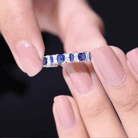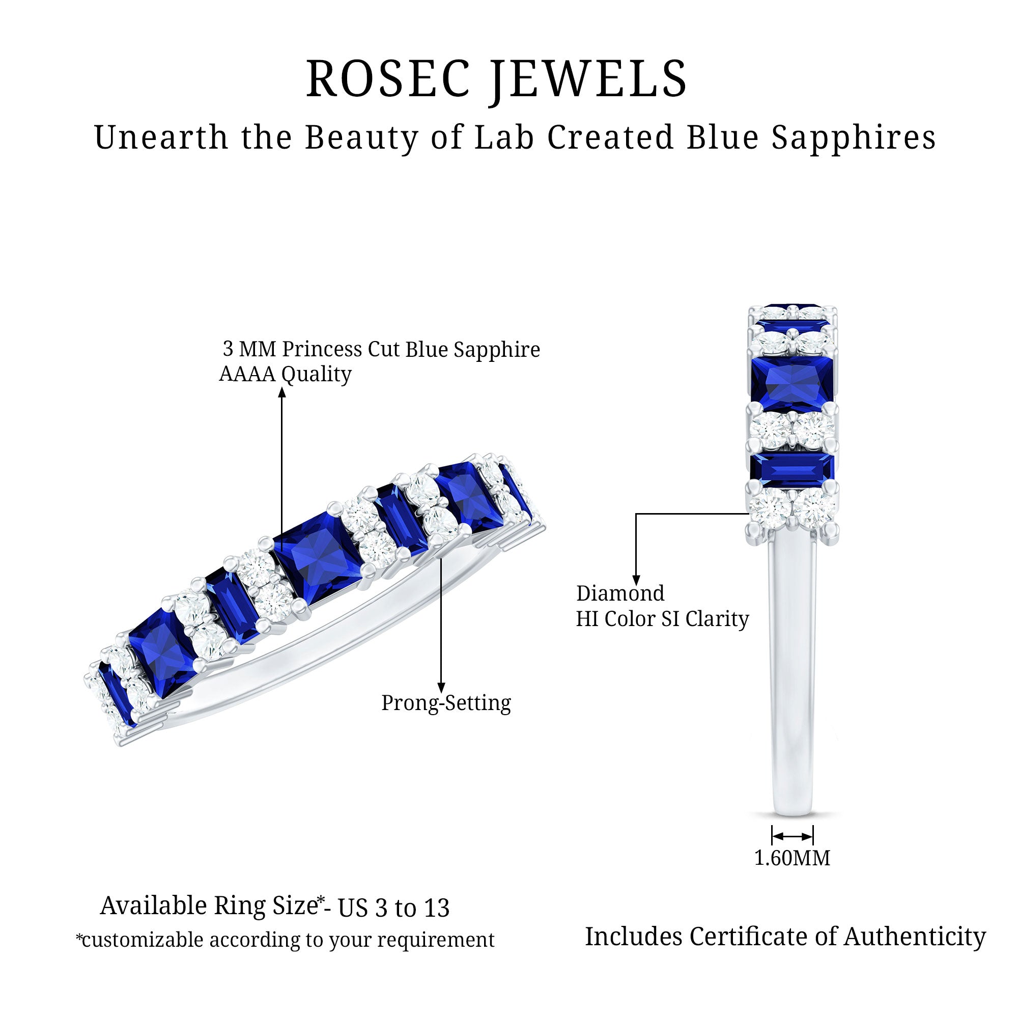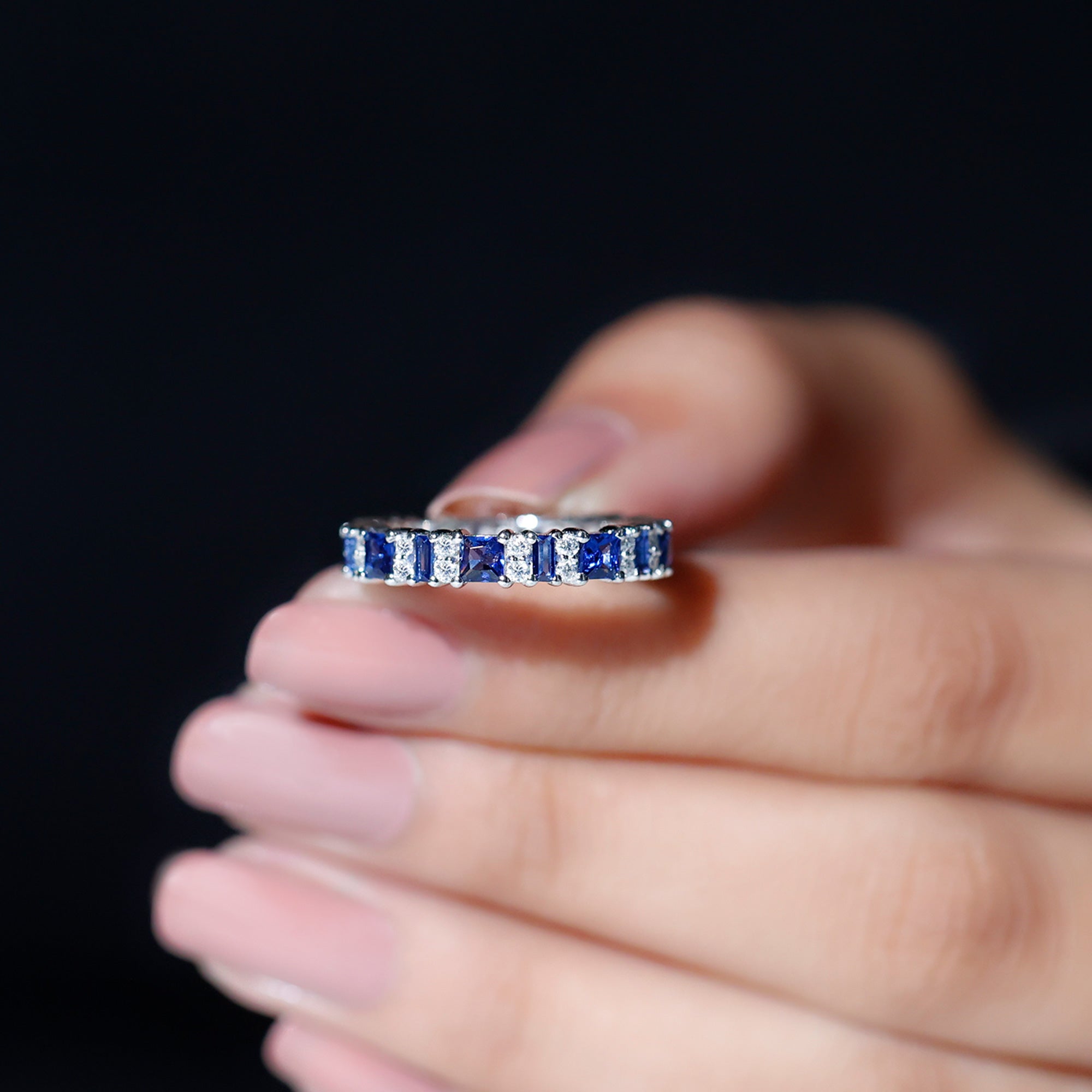This is a stunning eternity band ring that features a combination of princess and baguette cut lab-created blue sapphire and round Diamond. The eternity ring is crafted with a timeless and sophisticated design that is perfect for any occasion. The created blue sapphire and Diamond are expertly set in prong setting, creating a beautiful and sparkling look that is sure to turn heads.