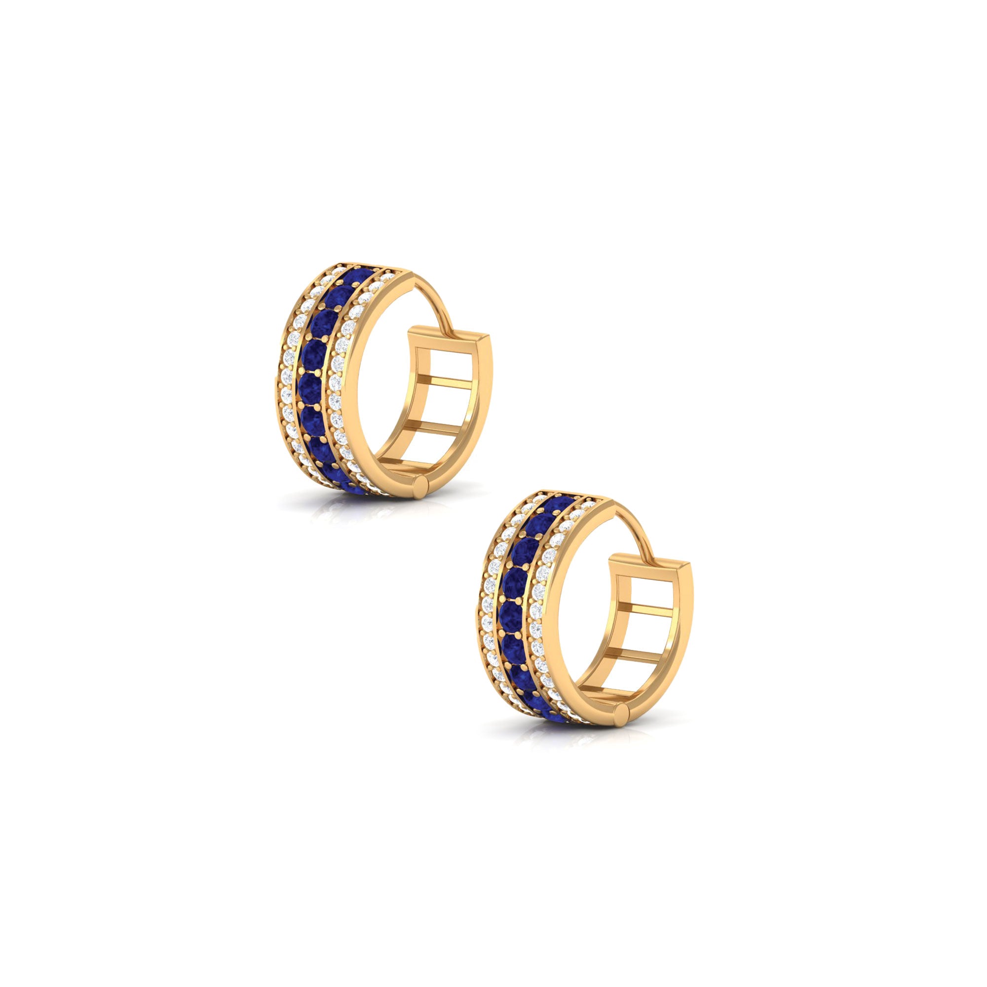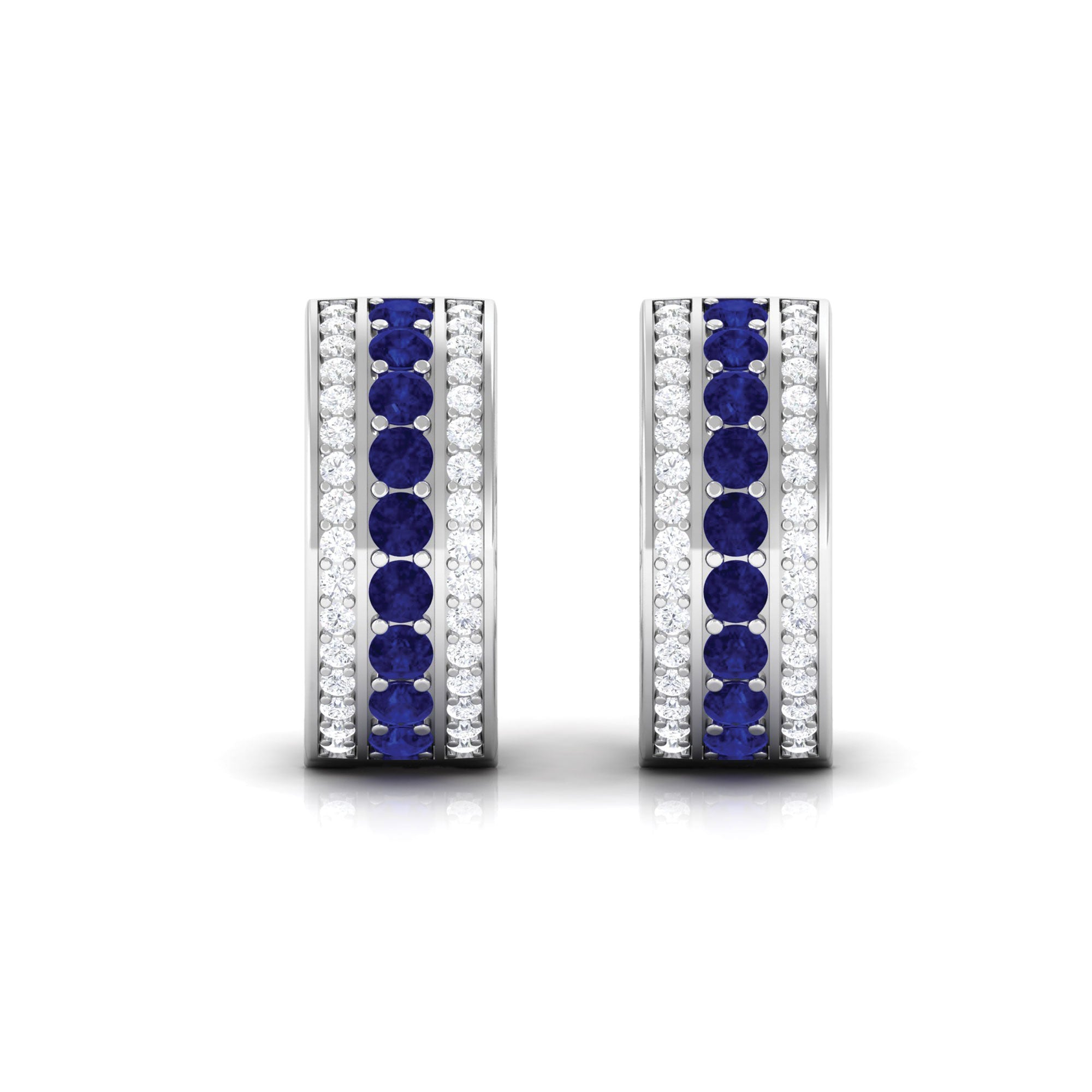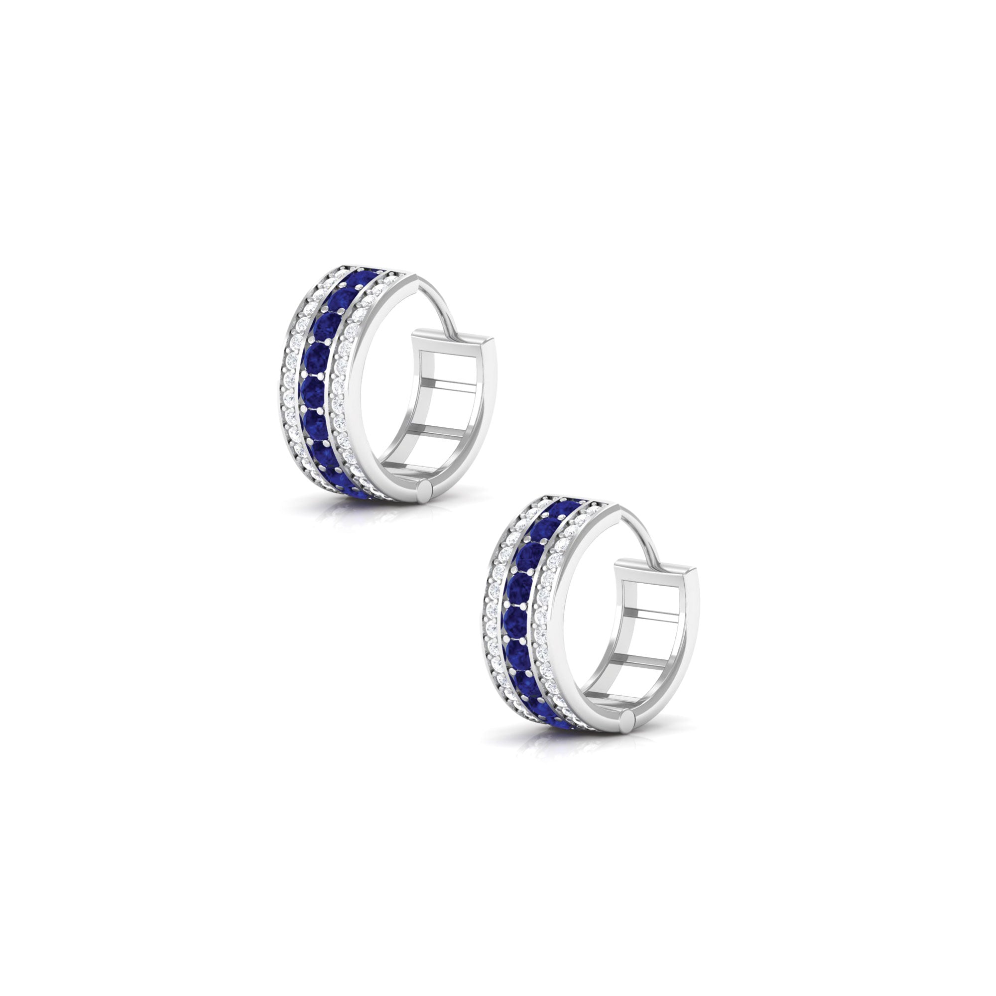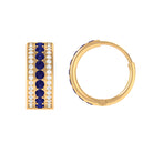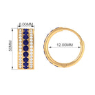 Add a touch of elegance to your look with our stunning Blue Sapphire Hoop Earrings. Designed for women who appreciate simple yet luxurious style, these Sapphire and Diamond Earrings beautifully combine modern design with timeless charm. Each earring features three delicate rows of round cut lab created Blue Sapphires and sparkling Diamonds set on a hinged hoop. The gemstones are of AAAA quality lab created Blue Sapphires and HI-SI quality Diamonds, ensuring exceptional brilliance, clarity, and lasting shine. The careful craftsmanship and high quality materials make these Wide Hoop Earrings a perfect balance of sophistication and durability. The secure hinged design makes them easy and comfortable to wear all day, whether you are dressing up for a special event or adding a touch of sparkle to your everyday outfit. Each pair comes with a Certificate of Authenticity and is beautifully packed in our signature jewelry box, making it a ready-to-gift treasure. These lab made Blue Sapphire Earrings make a thoughtful and memorable gift for any occasion, be it an anniversary, birthday, or a special treat for yourself.