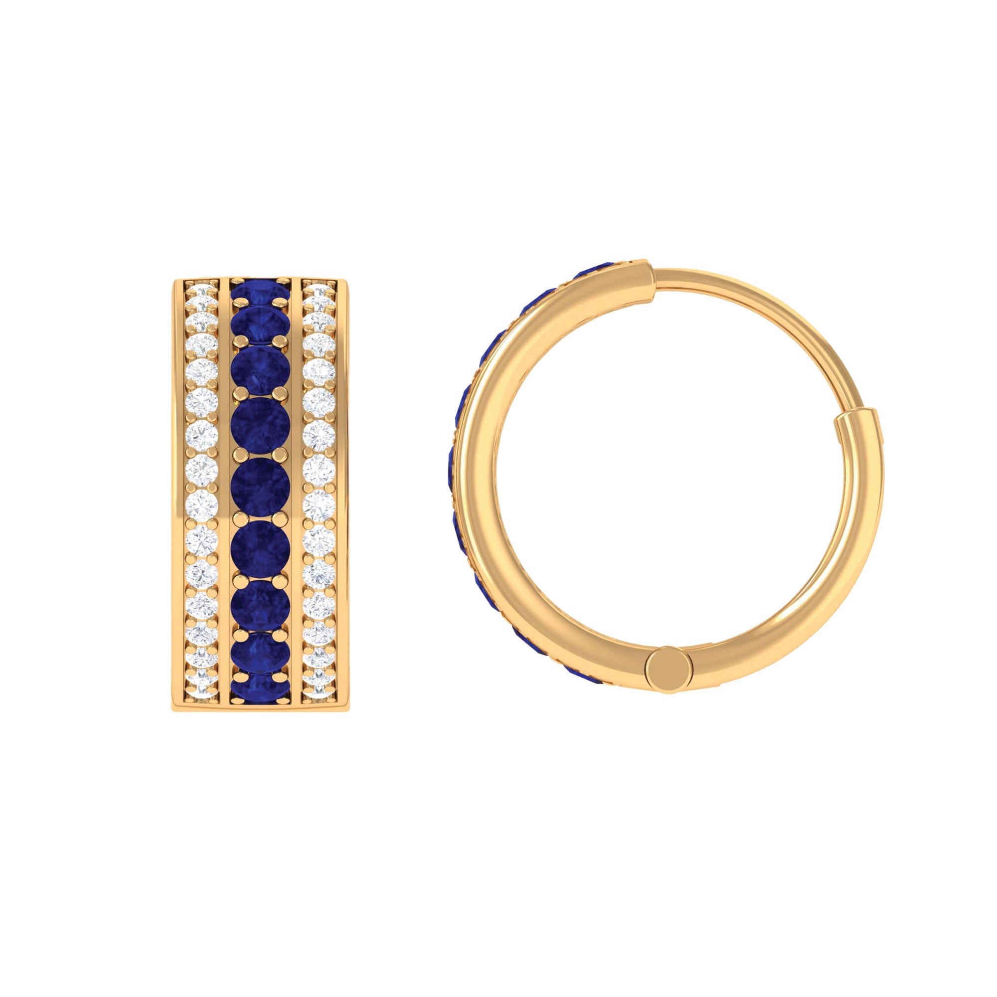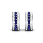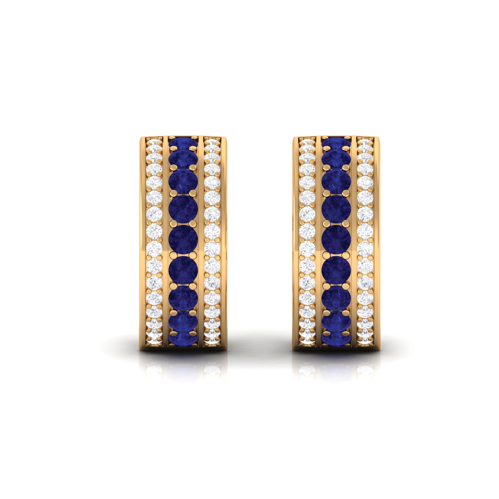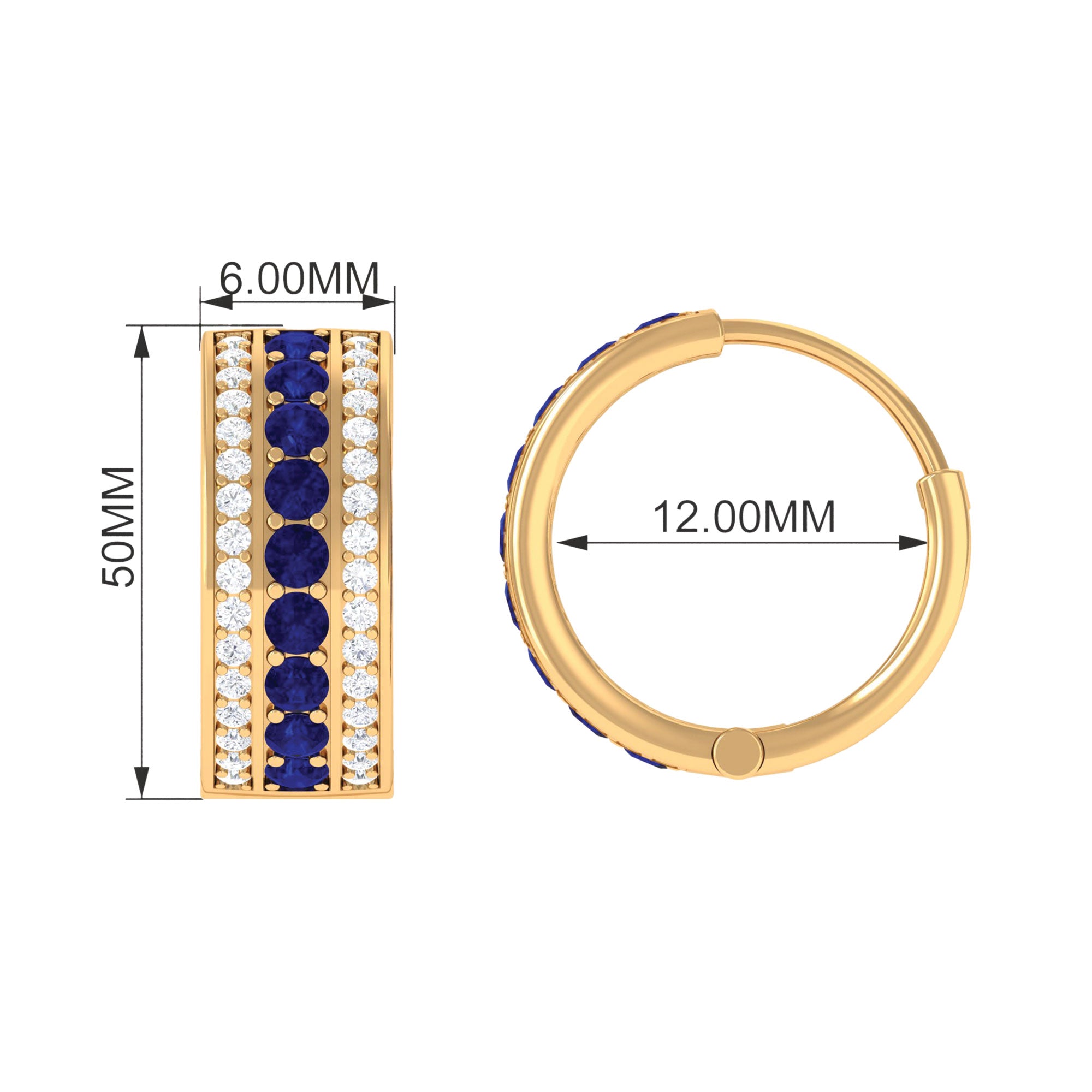 Add a touch of elegance to your look with our stunning Blue Sapphire Hoop Earrings. Designed for women who appreciate simple yet luxurious style, these Sapphire and Diamond Earrings beautifully combine modern design with timeless charm. Each earring features three delicate rows of round cut lab created Blue Sapphires and sparkling Diamonds set on a hinged hoop. The gemstones are of AAAA quality lab created Blue Sapphires and HI-SI quality Diamonds, ensuring exceptional brilliance, clarity, and lasting shine. The careful craftsmanship and high quality materials make these Wide Hoop Earrings a perfect balance of sophistication and durability. The secure hinged design makes them easy and comfortable to wear all day, whether you are dressing up for a special event or adding a touch of sparkle to your everyday outfit. Each pair comes with a Certificate of Authenticity and is beautifully packed in our signature jewelry box, making it a ready-to-gift treasure. These lab made Blue Sapphire Earrings make a thoughtful and memorable gift for any occasion, be it an anniversary, birthday, or a special treat for yourself.