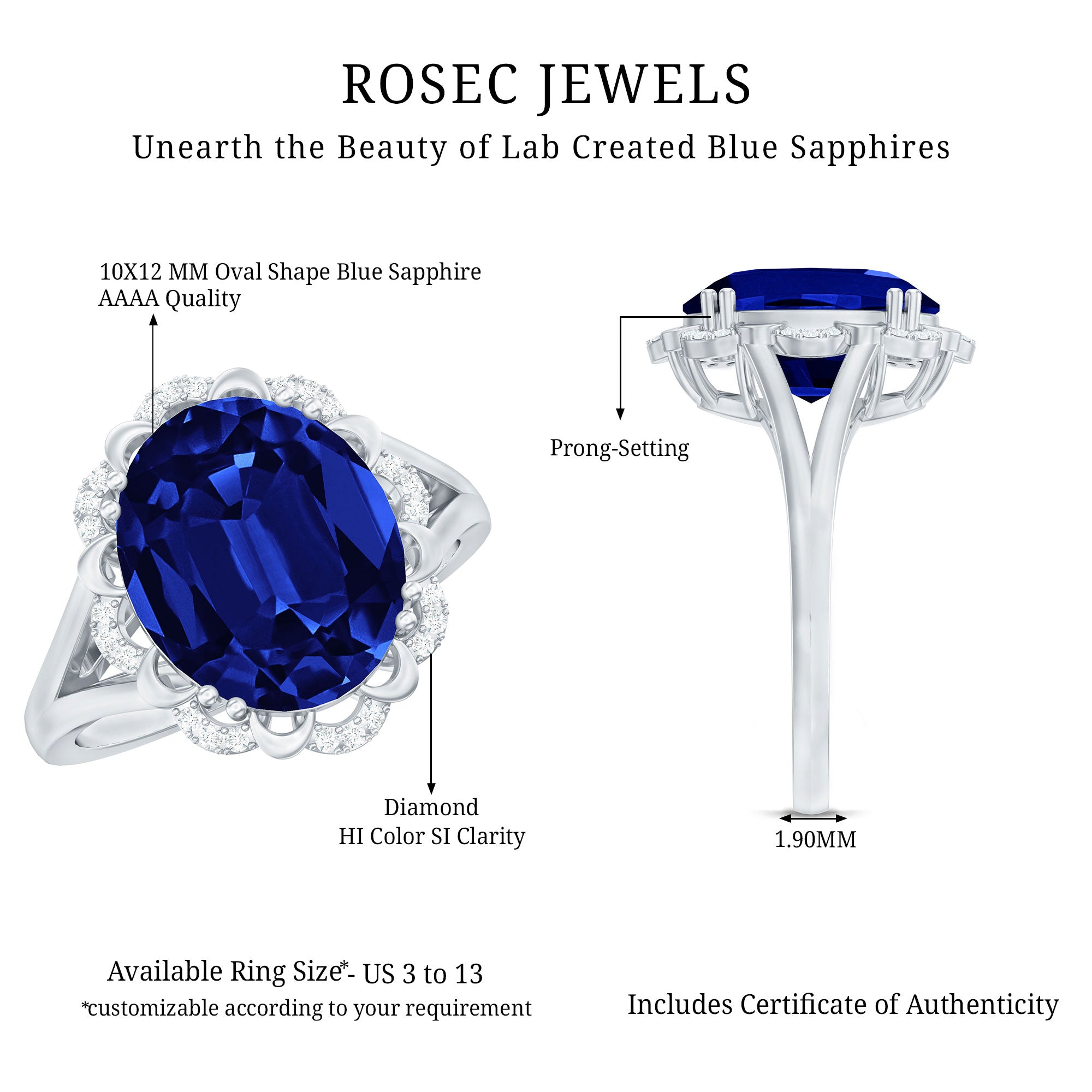 This stunning Engagement Ring showcases an Oval Cut Lab Created Blue Sapphire secured by Double Prong Setting while dainty Round Diamond on the unique design of the ring. Crafted with Hallmarked Metal and this Solitaire Ring will complement your every attire effortlessly like nothing else.