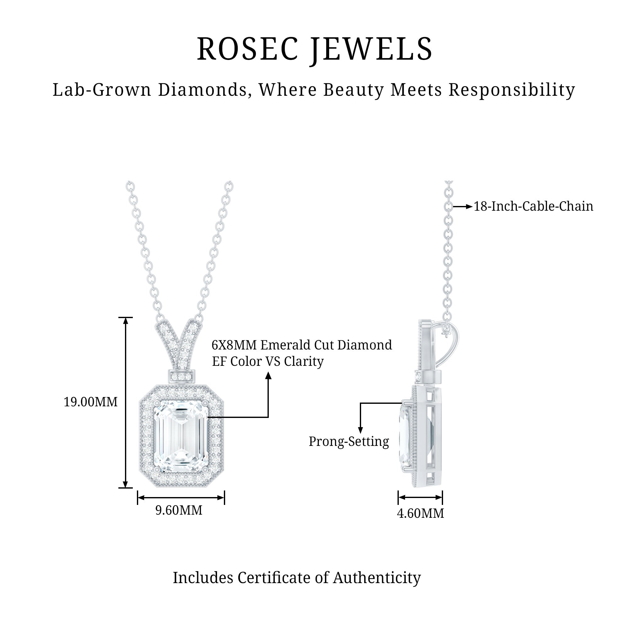Our Diamond Pendant Necklace is truly a standout piece that enhances your style with its stunning brilliance. Expertly crafted from high-quality metal, this Halo Necklace showcases a captivating 6X8 MM emerald cut lab-grown diamond of EF-VS quality, elegantly set in prongs and accentuated by petite round diamonds. The beaded detailing brings a hint of vintage elegance, while the uniquely designed Rabbit Ear bail adorned with delicate diamonds adds a touch of modern sophistication. Perfect for any occasion - be it a grand event, a romantic dinner, or just a casual outing - this Emerald Cut Pendant Necklace is the ultimate accessory. It makes a wonderful gift for birthdays, anniversaries, Valentines Day, Christmas, New Year, holidays, Mothers Day, or any special celebration.