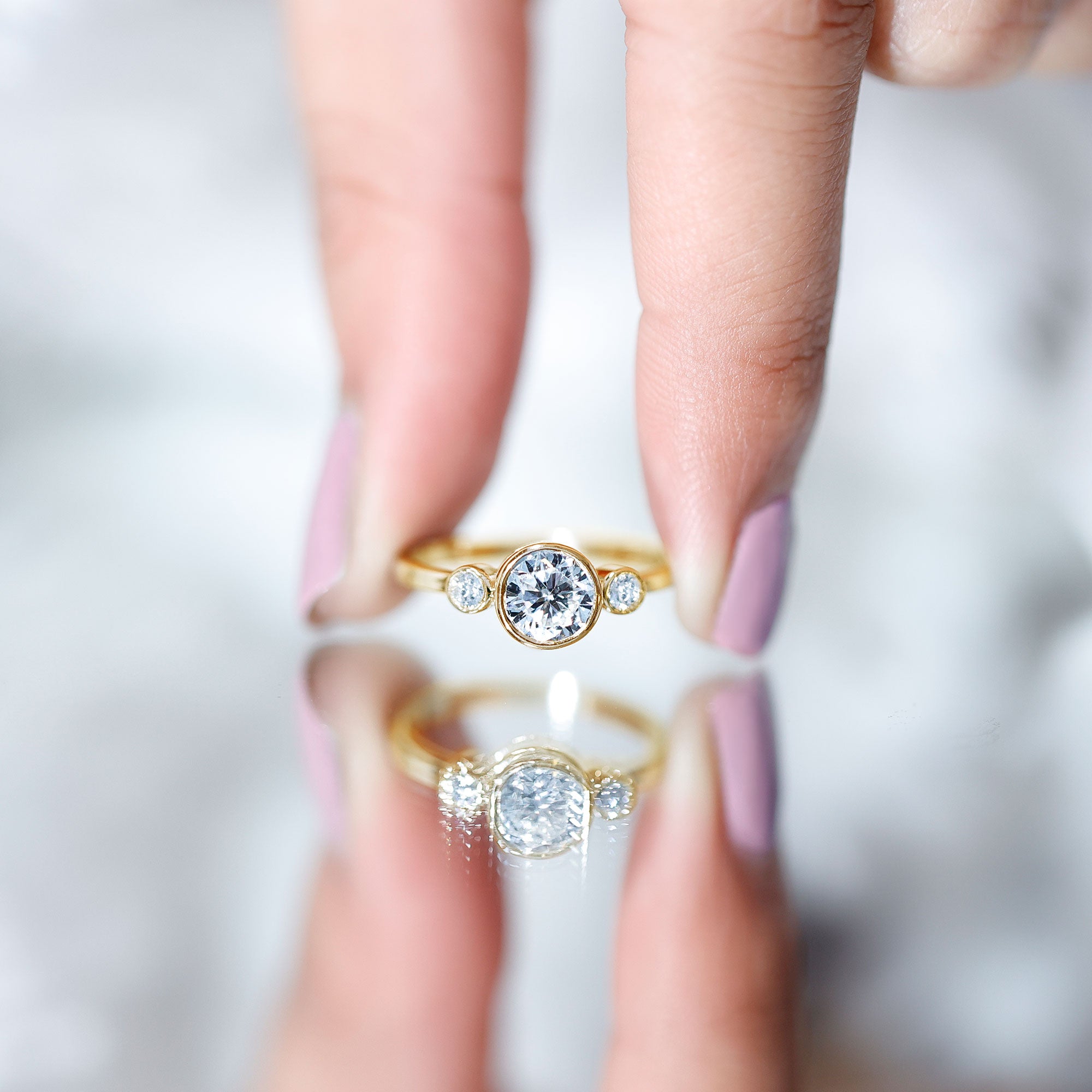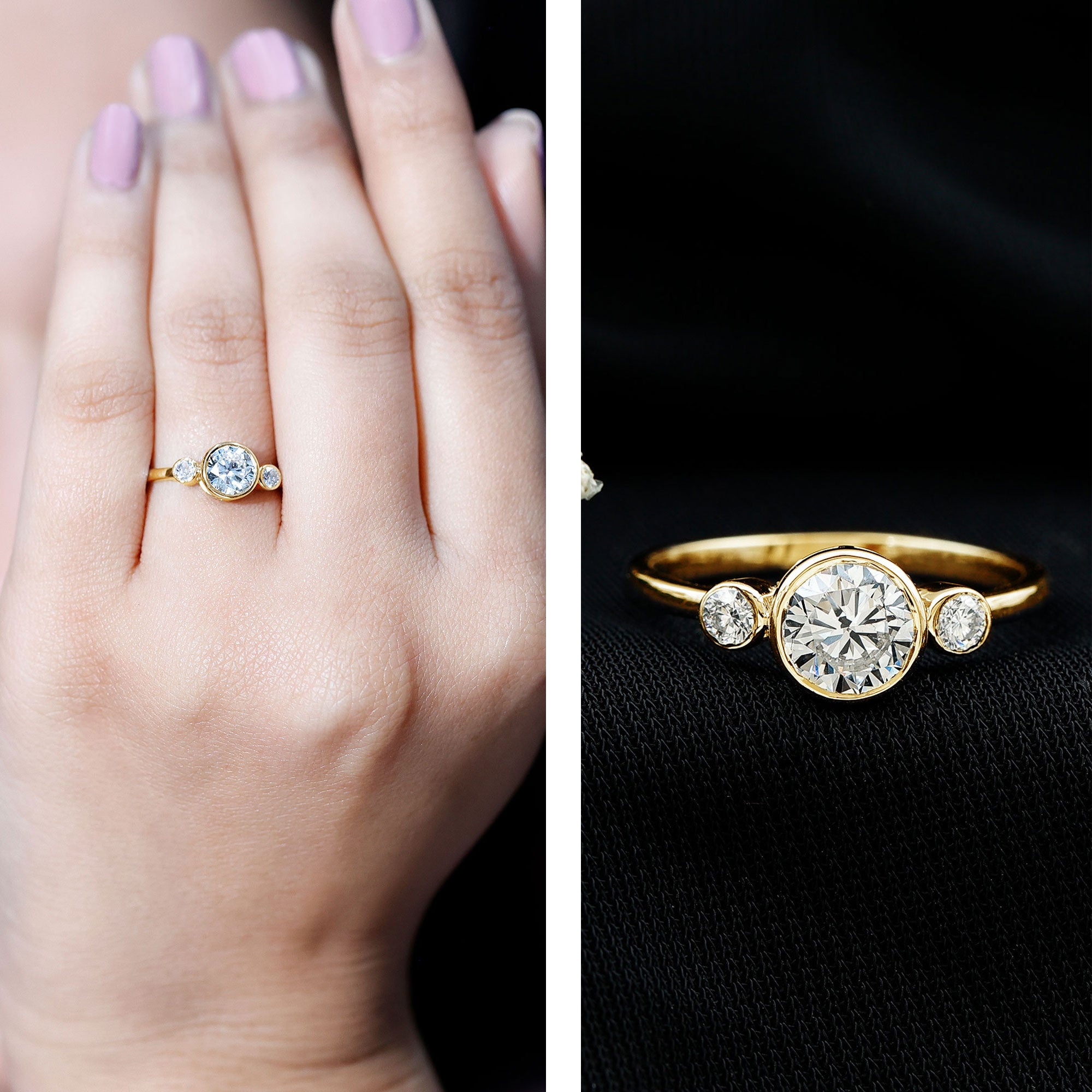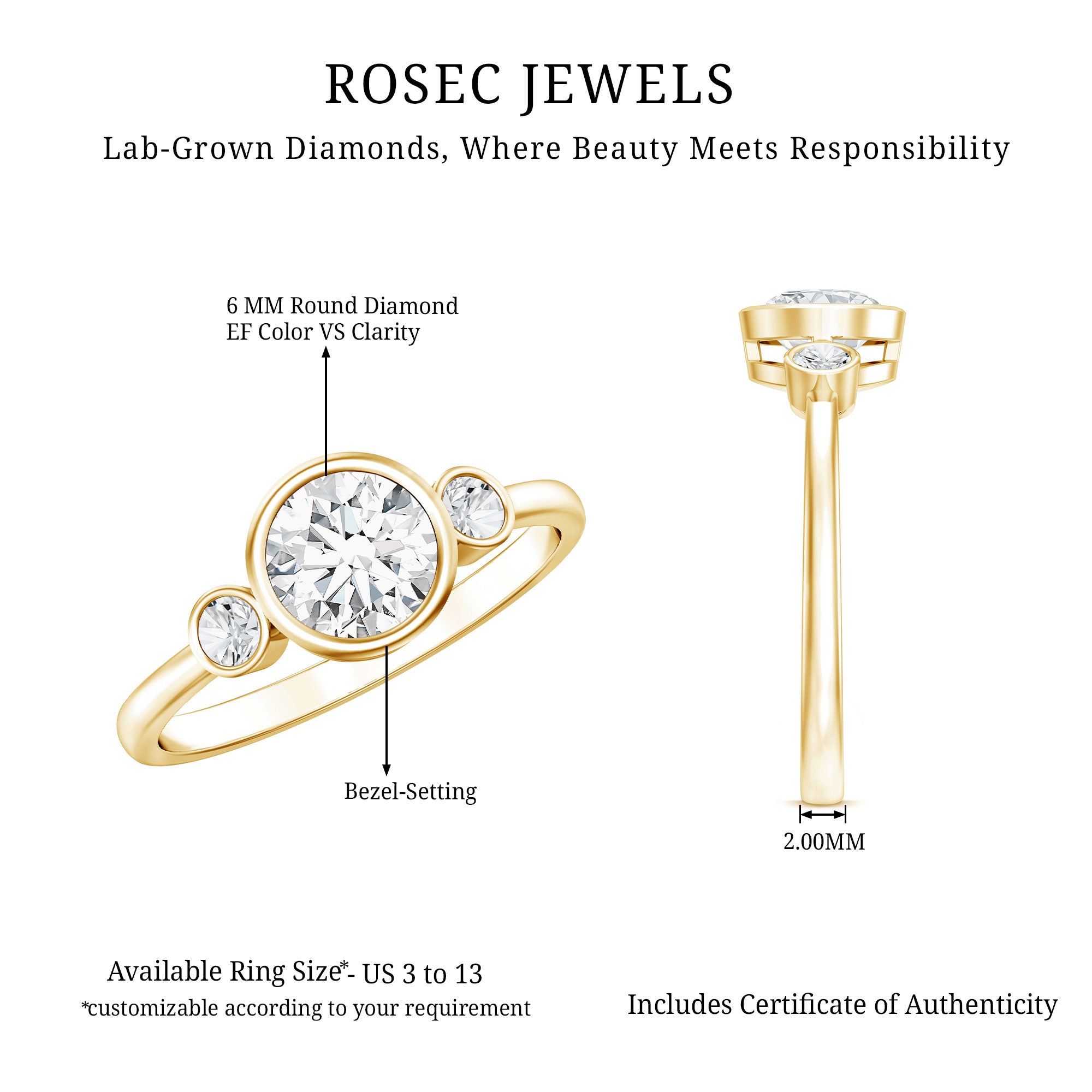 Some moments are meant to be cherished forever, and they deserve a sparkle that resonates deeply. This Lab Created Diamond Engagement Ring is crafted to honor love in its purest and most luminous form, showcasing a stunning EF-VS Quality 6 MM round lab-grown diamond accompanied by two side stones, all securely embraced by bezel setting that captures light and draws everyones gaze. With its sleek band and timeless charm, this Round Diamond Ring (Lab Diamond) exudes a modern, meaningful, and effortlessly stylish vibe. Ethically made to endure, this Bezel Set Engagement Ring celebrates your unique bond. Presented in an exquisite jewelry box, this Solitaire Engagement Ring is here to dazzle from the very first moment you unbox it. Available in sizes 3 to 13, this 1 Carat Diamond Ring is designed to fit beautifully and feel just right, regardless of your personal style. Whether it marks the start of forever or serves as a sweet reminder of enduring love, this Lab Diamond Ring embodies beauty, brilliance, and a wealth of emotion. Let it be the sparkle that signifies your love story, your promise, and everything in between.