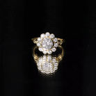 The halo of smaller diamonds around the center creates a floral silhouette, giving the ring a flower-inspired look while keeping the center stone classic.
