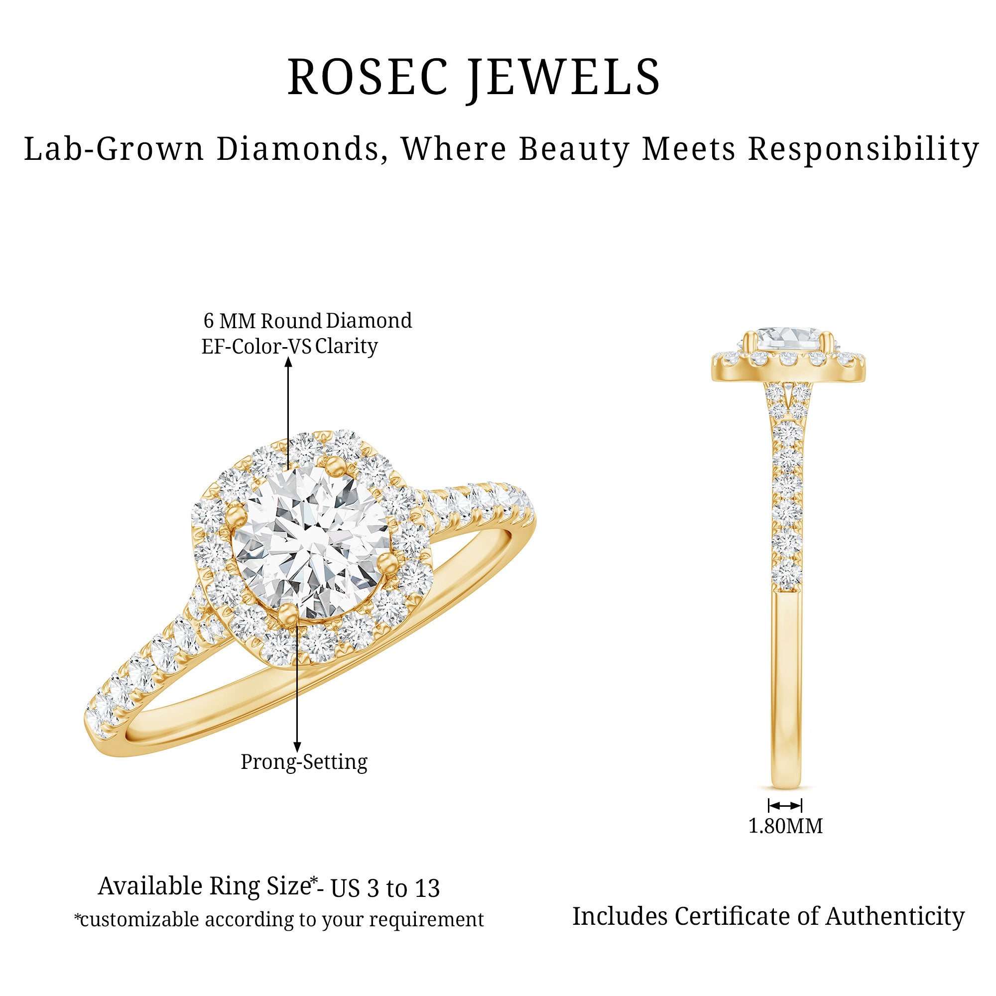 Make your special lady feel adored with our stunning Lab Grown Diamond Engagement Ring on her big day. Its elegant yet simple design beautifully highlights the center gemstone. This classic Round Engagement Ring features an EF-VS quality lab diamond, guaranteeing the fire and brilliance that symbolize love and commitment. At its core is a 6 MM round cut lab grown diamond, complemented by a floating halo of round diamonds. The dazzling round cut side stones on the 1 Carat Diamond Engagement Ring create a striking and eye-catching appearance, reflecting your individual style and personality. This Halo Engagement Ring boasts a timeless, brilliant shape that captures all the attention. It seamlessly combines classic beauty with a modern flair, offering an elegant look that radiates stunning brilliance. This Diamond Halo Ring is available in various sizes, ensuring a perfect fit that feels custom-made for you. Every detail of this Lab Created Diamond Ring for Women showcases precision, passion, and a touch of magic that only true craftsmanship can deliver. Let your fingers tell your story and allow your love to shine with a brilliance that is as unique as your bond.