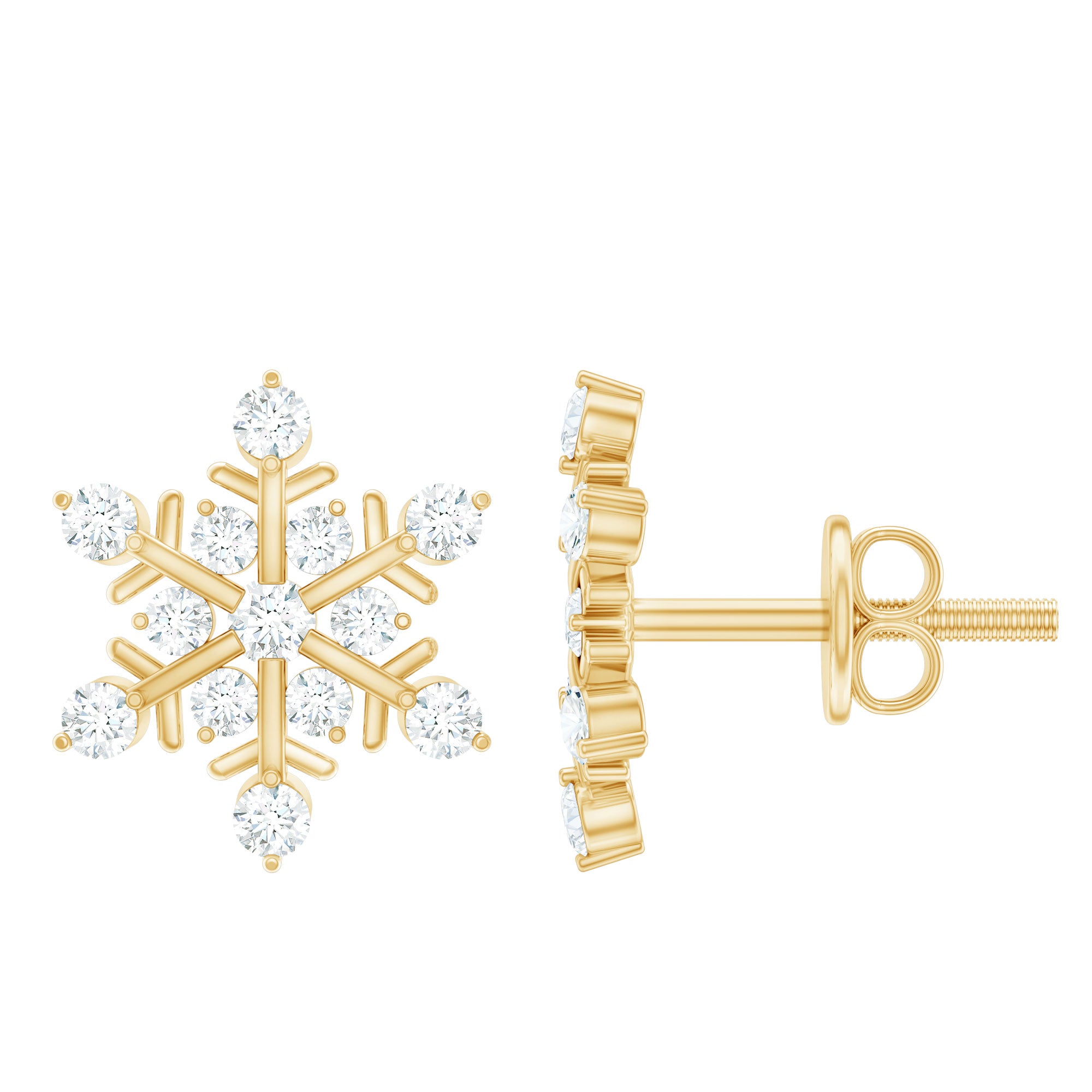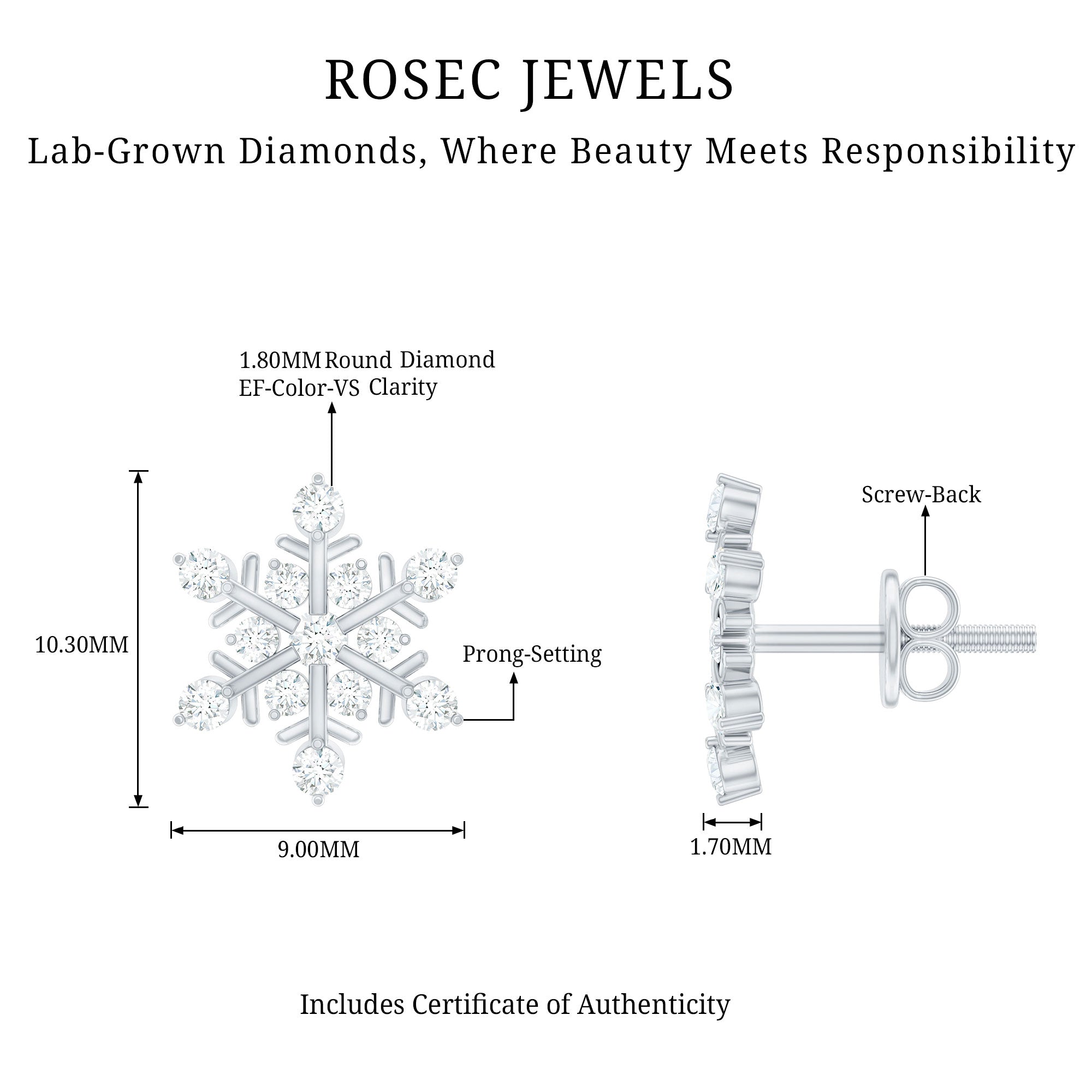 The charm of winter is captured in these Lab Grown Diamond Stud Earrings, designed to mirror a Snowflake. They showcase small round Lab Grown Diamonds set in prong setting, arranged with metal bars to form a classic snowflake design. The studs shine with the timeless brilliance of EF-VS Quality lab diamonds, making them not only eco-friendly but also budget-friendly, offering the same sparkle, durability, and allure as natural diamonds. These Snowflake Stud Earrings are perfect for completing your Christmas party outfit or adding a bit of sparkle to your daily looks. Wear them with your winter attire and embrace the feeling of being a snow queen. With Screw on Backs, these Lab Created Diamond Earrings will stay secure all day long, allowing you to enjoy every moment with complete peace of mind. Additionally, these Winter Earrings come with a certificate of authenticity, so you can shop confidently and get excellent value for your investment. Our Snowflake Jewelry is delivered in a premium jewelry box, ideal for keeping it safe when you are not wearing it.