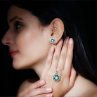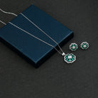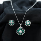 This Emerald Jewelry Set is crafted with 14K White Gold Plated Silver. This jewelry set features a pendant chain with earrings. The necklace and earrings set features a Round Shape Zircon and Pear Shape Lab Grown Emerald placed in a floral pattern. The pendant is accentuated with a standard bail and dangles with a sturdy cable chain, and the Earrings with Screw on Backs stays on place throughout. This Floral Jewelry Set dazzles with the classic shine of AAAA quality Lab Grown Emerald and Zircon, which completes the look for the special day.