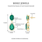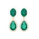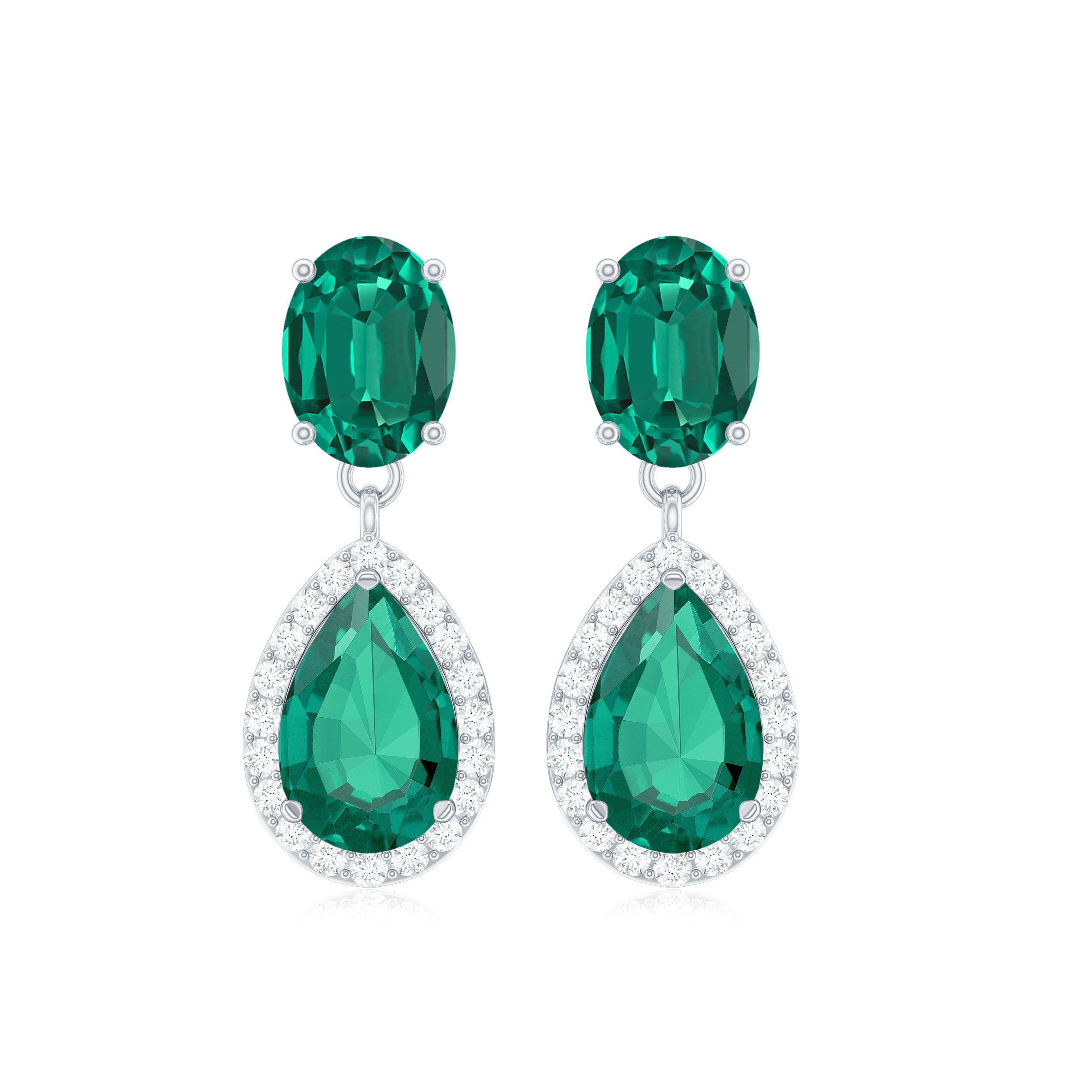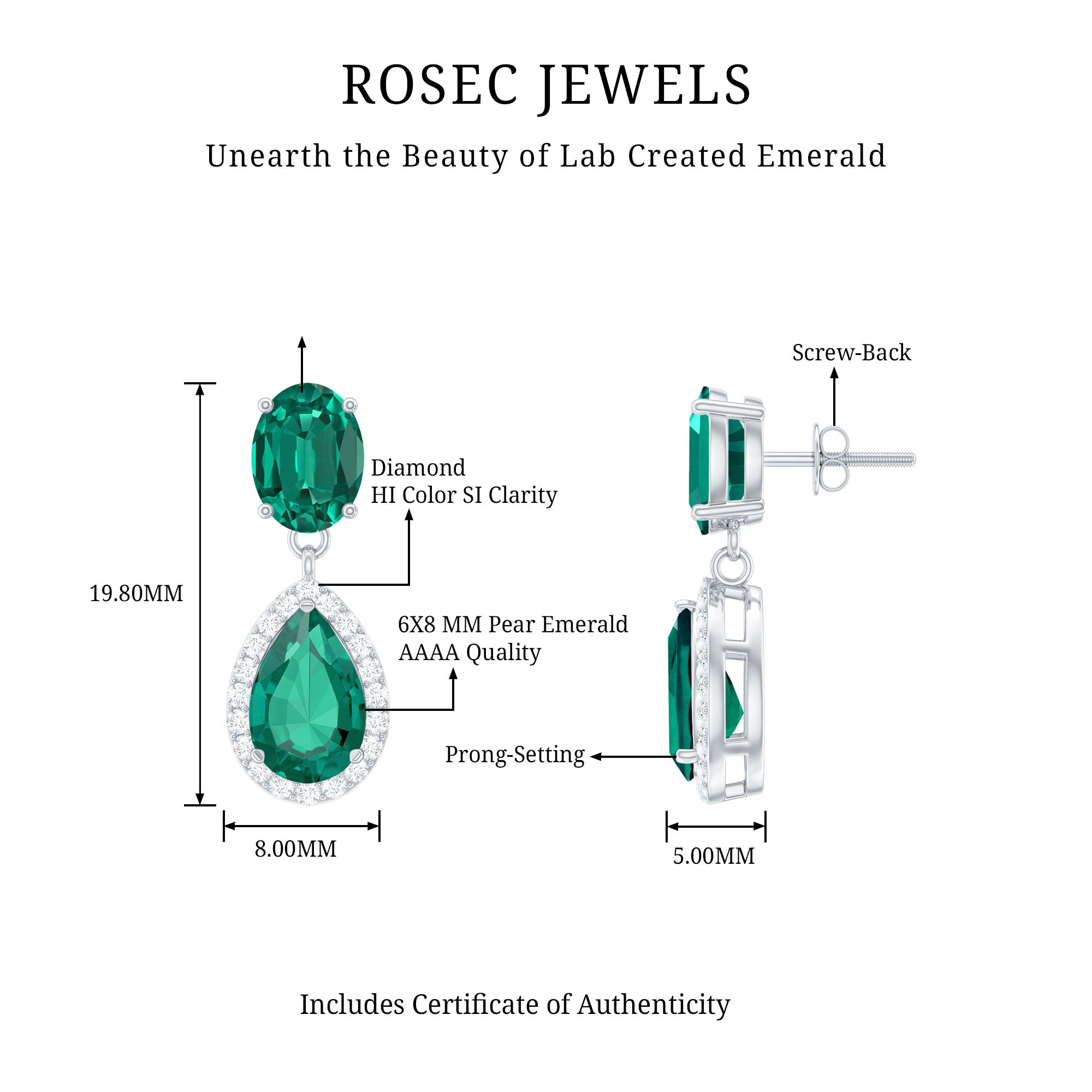 These Lab Grown Emerald Earrings represent a truly exquisite piece of jewelry, making them an ideal choice for your wedding day. As stunning Wedding Earrings For Bride, they are destined to capture attention with their timeless and understated brilliance. The striking burst of color from the AAAA Quality lab created emerald and HI-SI Quality diamonds creates a remarkable statement, perfect for the bride desiring a daring appearance. These Dangle Drop Earrings feature a 6X8 MM pear shape lab grown emerald elegantly set in a prong setting, surrounded by a diamond halo, designed as a drop. Enhancing their allure is the 5X7 MM oval shape lab created emerald positioned above. These magnificent Emerald Drop Earrings serve as the timeless bridal accessory, secured with a screw back closure. The exceptional craftsmanship and expertise of skilled artisans have rendered these Emerald and Diamond Earrings effortlessly stylish, exuding a subtle glamour that is ideal for elevating bridal sophistication and elegance. They are guaranteed to infuse a vibrant touch of color into your ensemble.