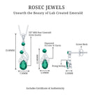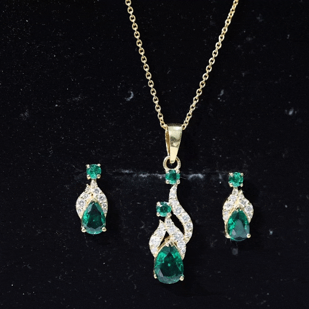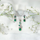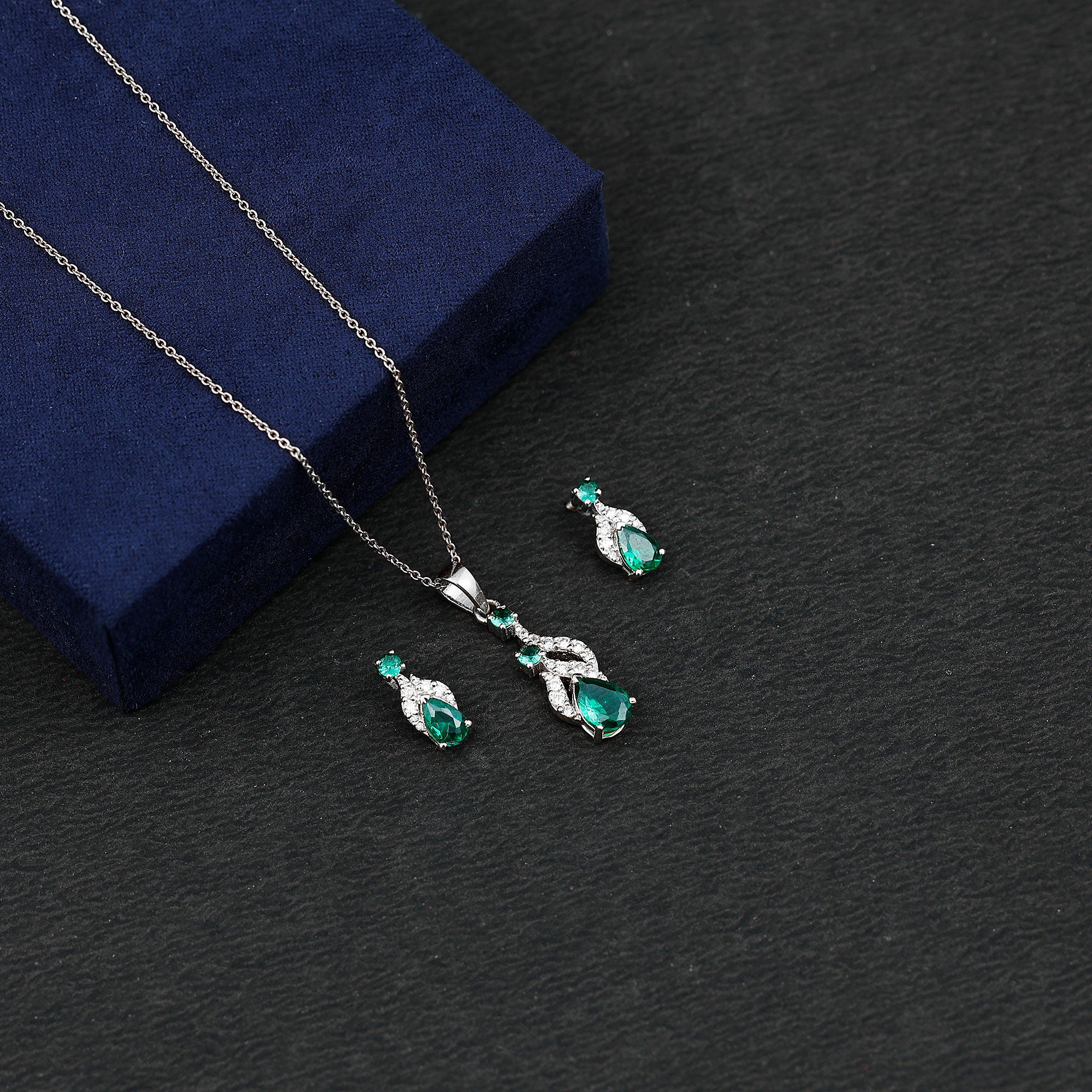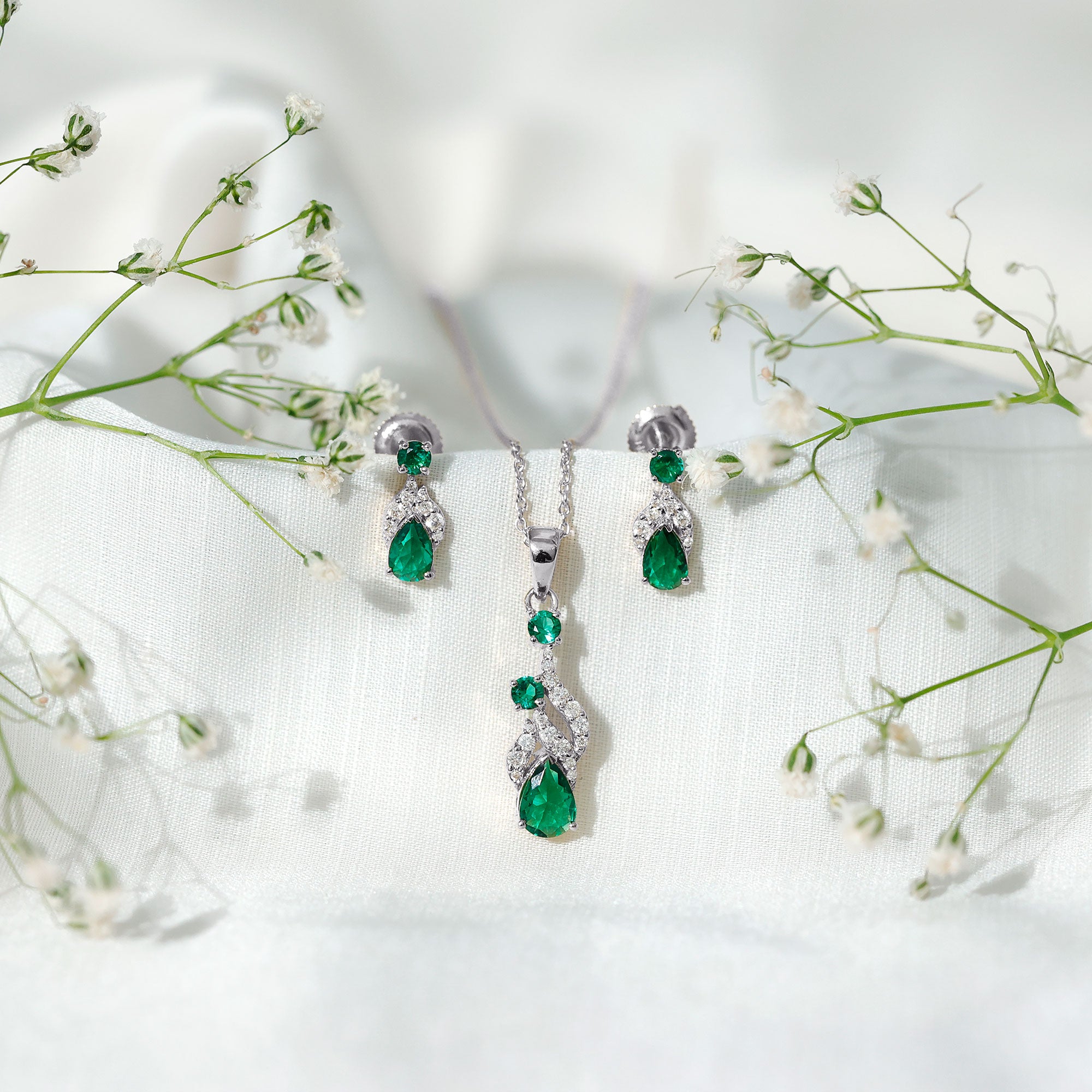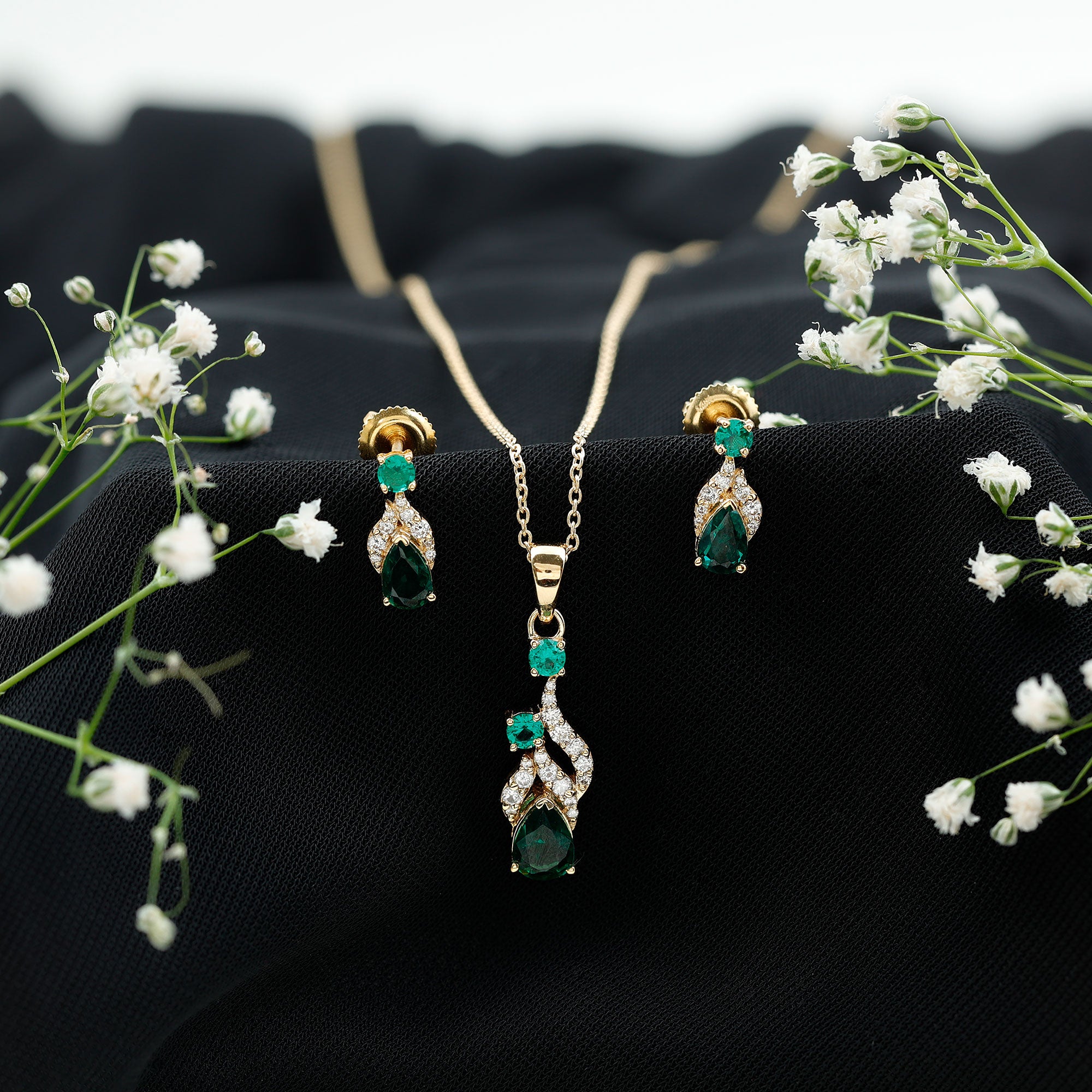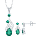 We know how you always need Jewelry to bring spark to those dull, lazy days and so we bring this Emerald and Diamond Jewelry Set. Crafted with precision and care, the Emerald Jewelry Set includes a stunning pendant necklace and matching stud earrings, perfect for both special occasions and everyday elegance. The necklace features a 5X7MM pear shaped lab created emerald as its centerpiece, securely set in prong setting. Flanking the emerald are sparkling round diamond stones with round cut lab created emeralds, creating a harmonious designer pattern that is both natural and stylish. The pendant hangs gracefully from a durable cable chain via a standard bail, resting beautifully on the neckline. The matching stud earrings are equally captivating, each featuring a 4X6 MM lab created emerald accented with delicate diamond stones. Screw-back closures ensure comfort and security, making them ideal for all-day wear without worry. Crafted from AAAA quality lab created emeralds and HI-SI-quality diamonds, the Designer Necklace Set offers a striking contrast that draws the eye and adds sophistication to any ensemble. Versatile and timeless, the Necklace and Earrings Set can be worn together for a coordinated statement or separately for subtle elegance.