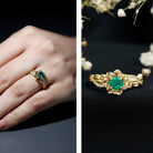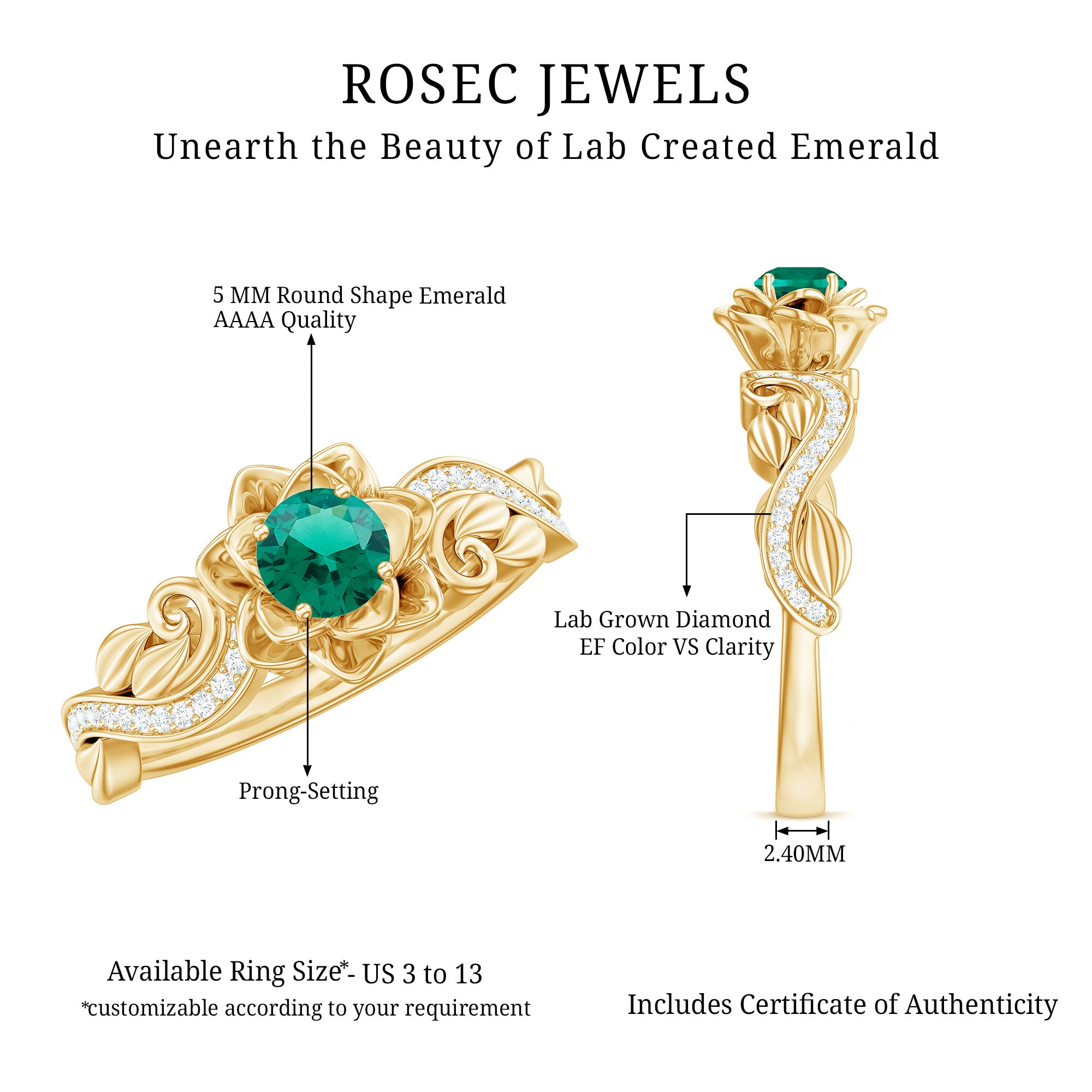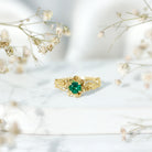 Celebrate love with a touch of nature’s elegance through this Lab Created Emerald Engagement Ring, designed to capture hearts with its beautiful floral charm. Crafted to resemble a blooming rose, this ring features a 5 MM Round Shaped Lab Created Emerald in secure prong setting. The rose-inspired design is detailed with delicately sculpted petals that gracefully wrap around the center stone, creating the look of a flower in full bloom. This Rose Engagement Ring is a perfect representation of how love blossoms over time. The center emerald is beautifully complemented by sparkling lab grown diamonds adorning the shank, adding just the right amount of shimmer and elegance to the overall look. Crafted in 14k yellow gold plated silver with care and precision, this Flower Engagement Ring is ideal for the bride who appreciates meaningful details and unique designs. The AAAA Quality Lab Emerald offers a bold yet graceful appearance, while the EF-VS Quality Lab Grown Diamonds bring light and brilliance that highlight every angle of the ring. Whether you are planning a proposal or looking for a romantic anniversary gift, this ring makes a heartfelt statement. It is a symbol of your journey together, a reminder of cherished moments, and a promise of forever. Presented in a premium jewelry box and accompanied by a certificate of authenticity, this Emerald Flower Ring is perfect for nature lovers, modern romantics, or anyone who wants a unique and eye-catching piece to treasure.