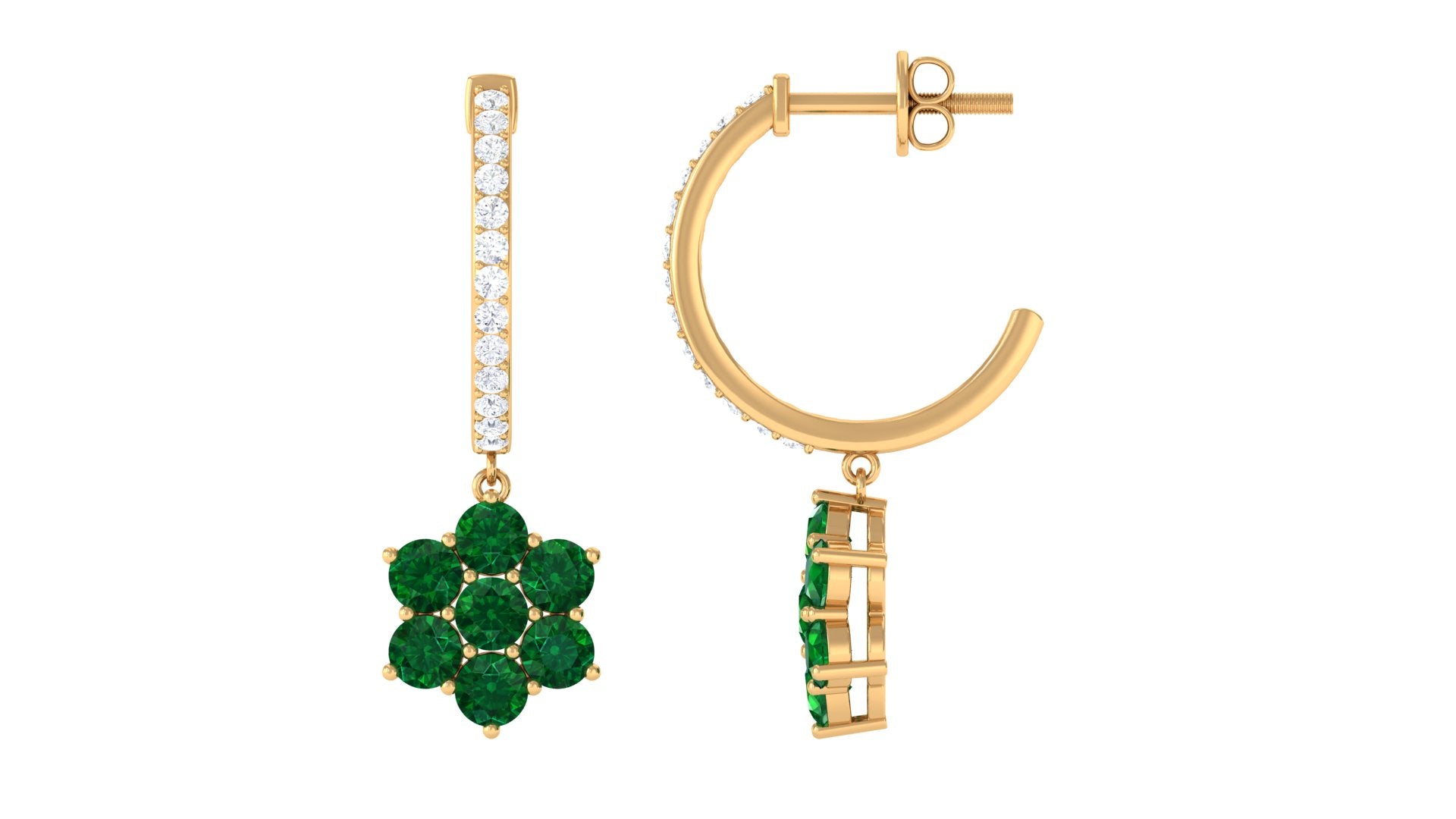 Inspired by the elegance of nature, these Emerald Flower Earrings capture the charm of blooming flowers. The earring features a delicate flower cluster of round cut Lab Created Emerald stones which is hanging from a sleek half hoop adorned with shimmering Diamonds. The flower drop design adds movement and sparkle with every turn. The Diamonds are carefully set to enhance the rich green tones of the Emeralds, creating a stunning contrast that catches the light beautifully. Designed with elegance and comfort in mind, these Emerald and Diamond Hoop Earrings come with a secure screw back closure, ensuring a perfect fit for long hours of wear. Whether paired with a classic gown or a modern ensemble, they effortlessly elevate any outfit with their timeless charm and glamour. The Emerald Drop Earrings are perfect for special occasions, from weddings and parties to anniversaries and celebrations, or simply as a meaningful gift for someone who loves the beauty of nature. With their floral inspiration and exquisite craftsmanship, these Half Hoop Earrings are a true reflection of elegance and grace, making every moment you wear them feel as special as a blooming flower in spring.