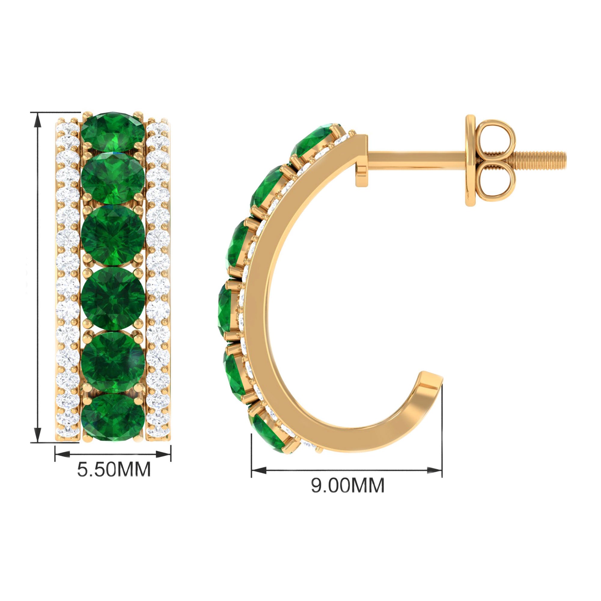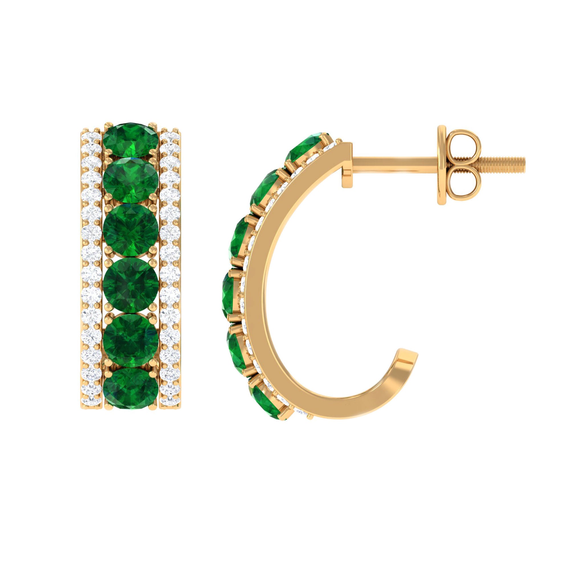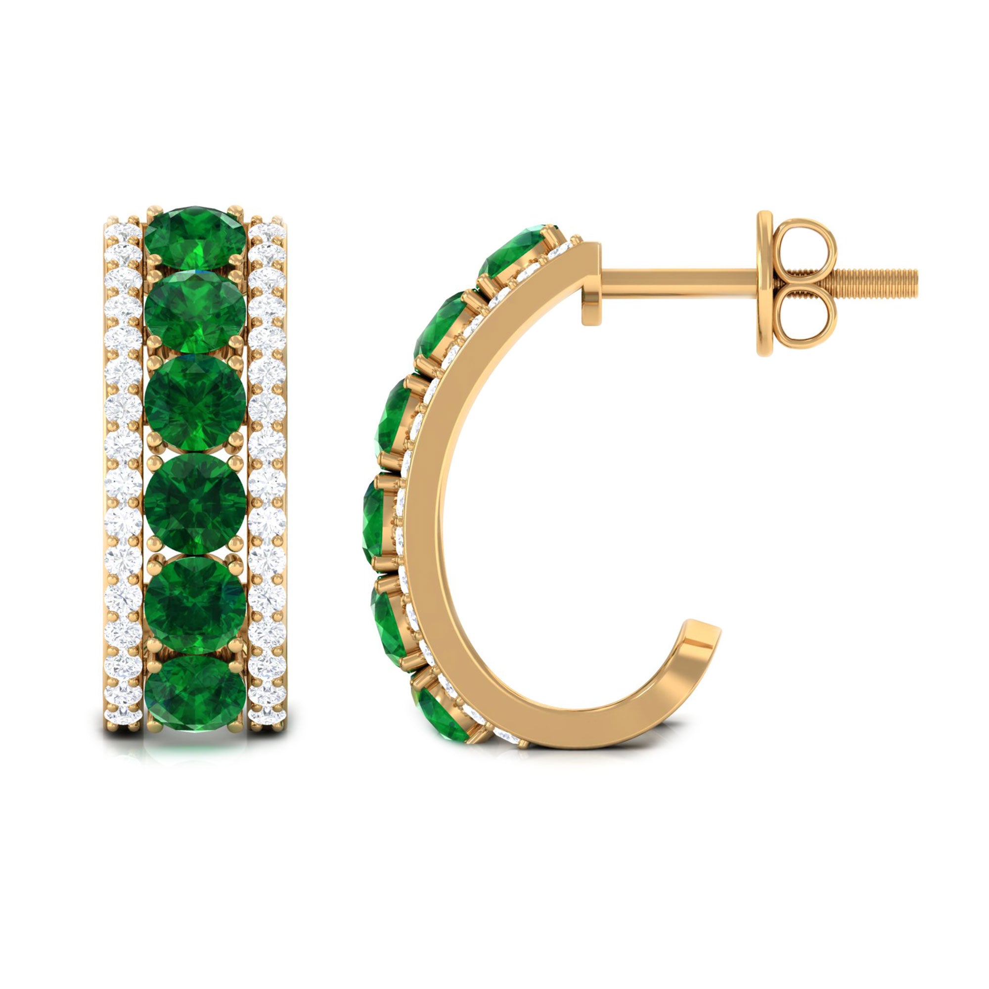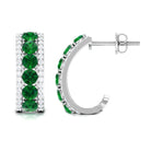 Shine with elegance and charm on your special day with these beautiful Lab Created Emerald Hoop Earrings. Designed to add a touch of sparkle and color, these Half Hoop Earrings feature a stunning arrangement of round shaped lab created emeralds set gracefully along the center row. On each side of the emeralds, two delicate rows of sparkling diamonds enhance the brilliance of the design, creating a captivating contrast between the deep green stones and the shimmering diamonds. The unique J hoop shape adds a modern twist to a classic style, making these Emerald and Diamond Earrings both elegant and versatile. Crafted with attention to detail, these J Hoop Earrings are fitted with secure screw back closures to ensure a comfortable and confident wear all day long. Whether you are walking down the aisle, celebrating a milestone, or attending a special event, these Lab Grown Emerald Earrings will beautifully complement your outfit and bring a radiant glow to your look. Ideal for weddings, anniversaries, or any occasion that calls for a little extra sparkle.