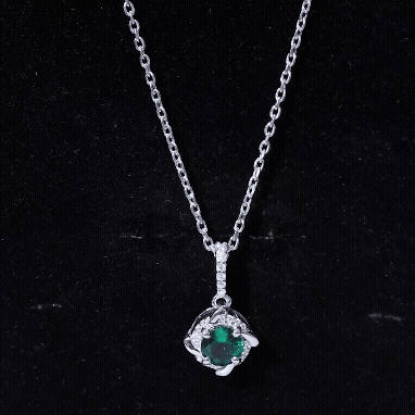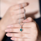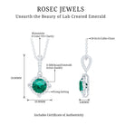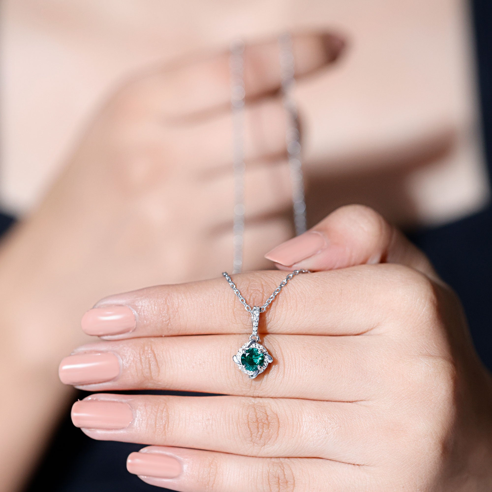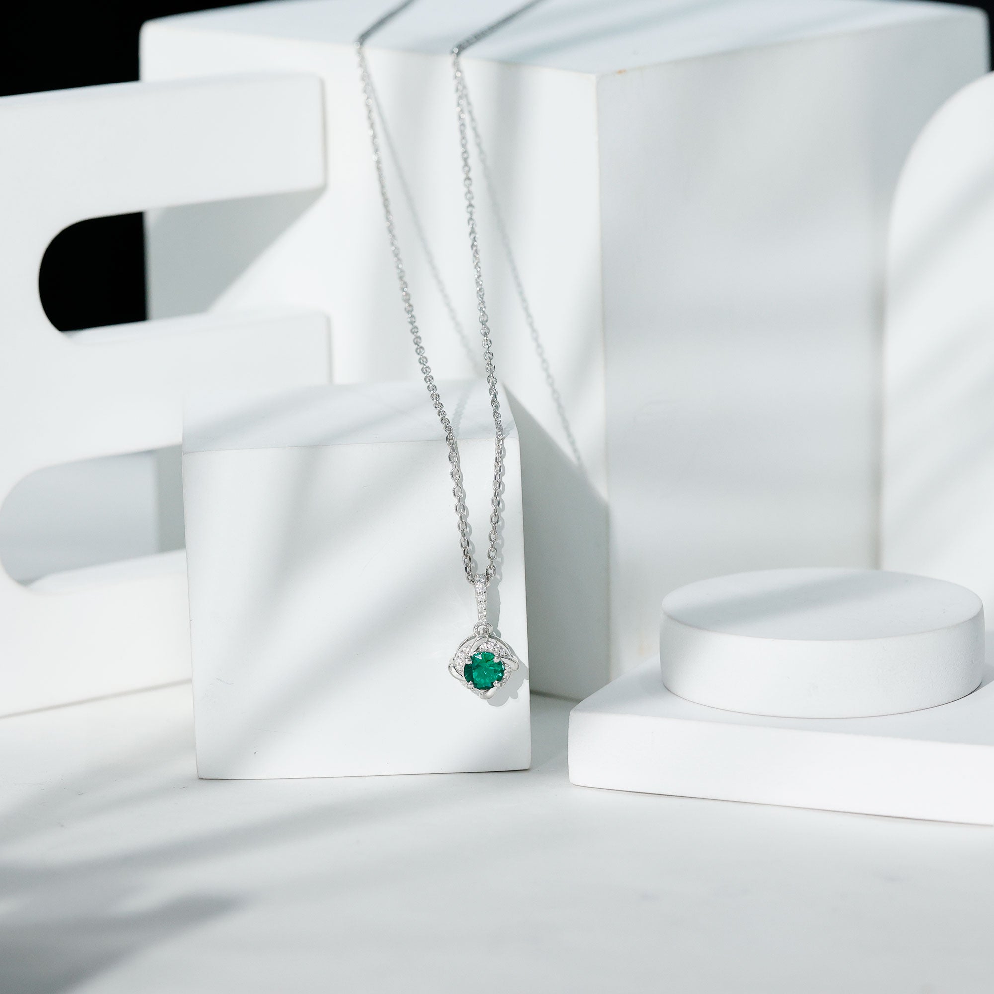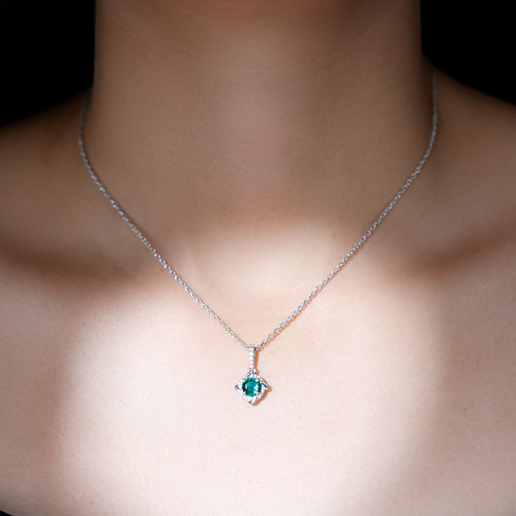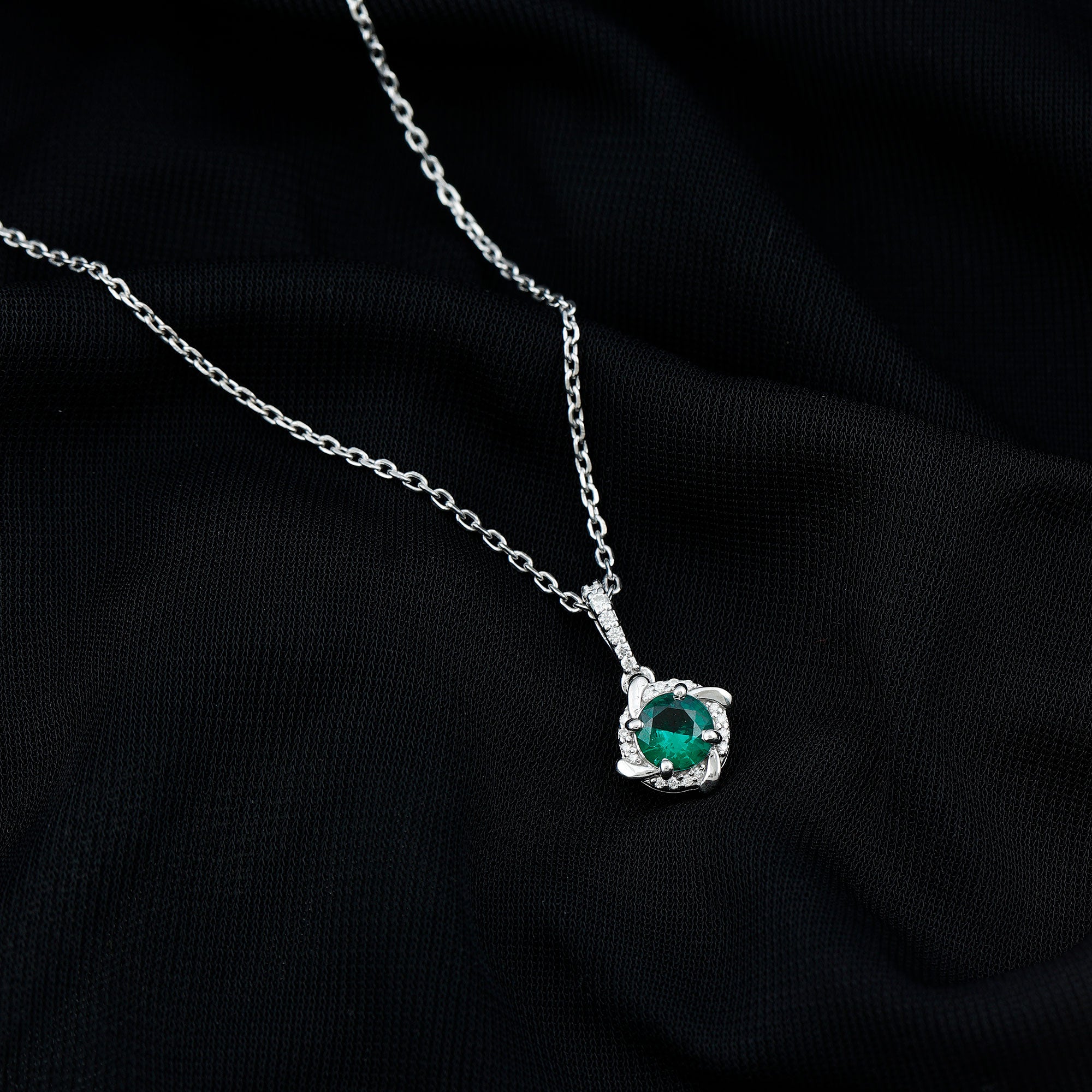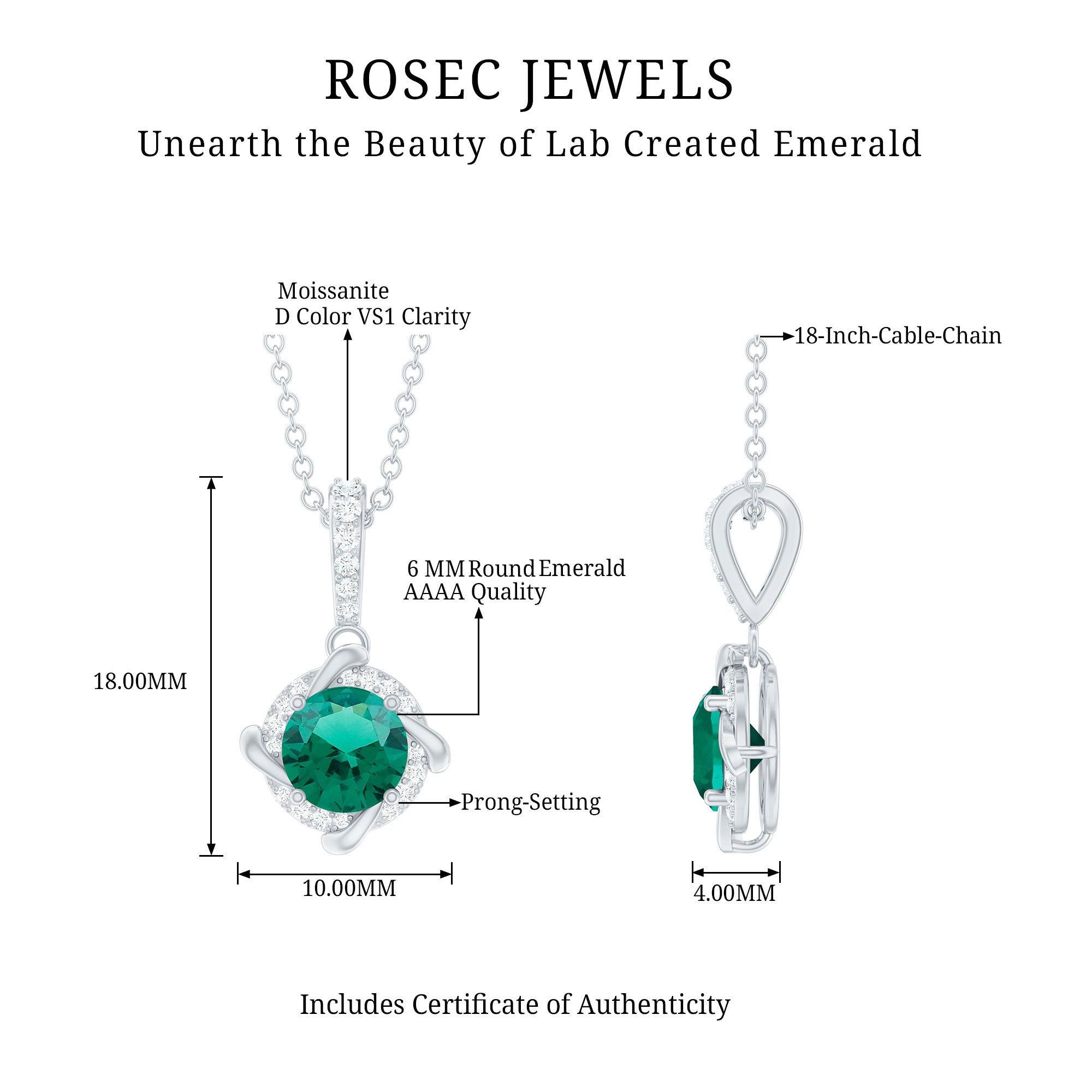 Make your look appealing with the vibrant green hue of this Lab Grown Emerald Pendant, handcrafted in 14K white gold plated silver. This pendant features a 6 MM Round Shape Emerald of AAAA quality securely placed in Prong Setting and encircled with smaller Moissanite stones. The Halo Pendant is accentuated with a stone-studded bail and dangles from a sturdy cable chain, which makes it perfectly sit on the neckline. We delivered this Pendant with a Chain to you in a premium quality velvet pouch. Also, it makes a thoughtful gift for your lady love on occasions like Valentines Day, Anniversaries, Birthdays, New Year, Christmas, and many more.