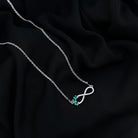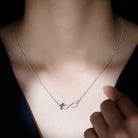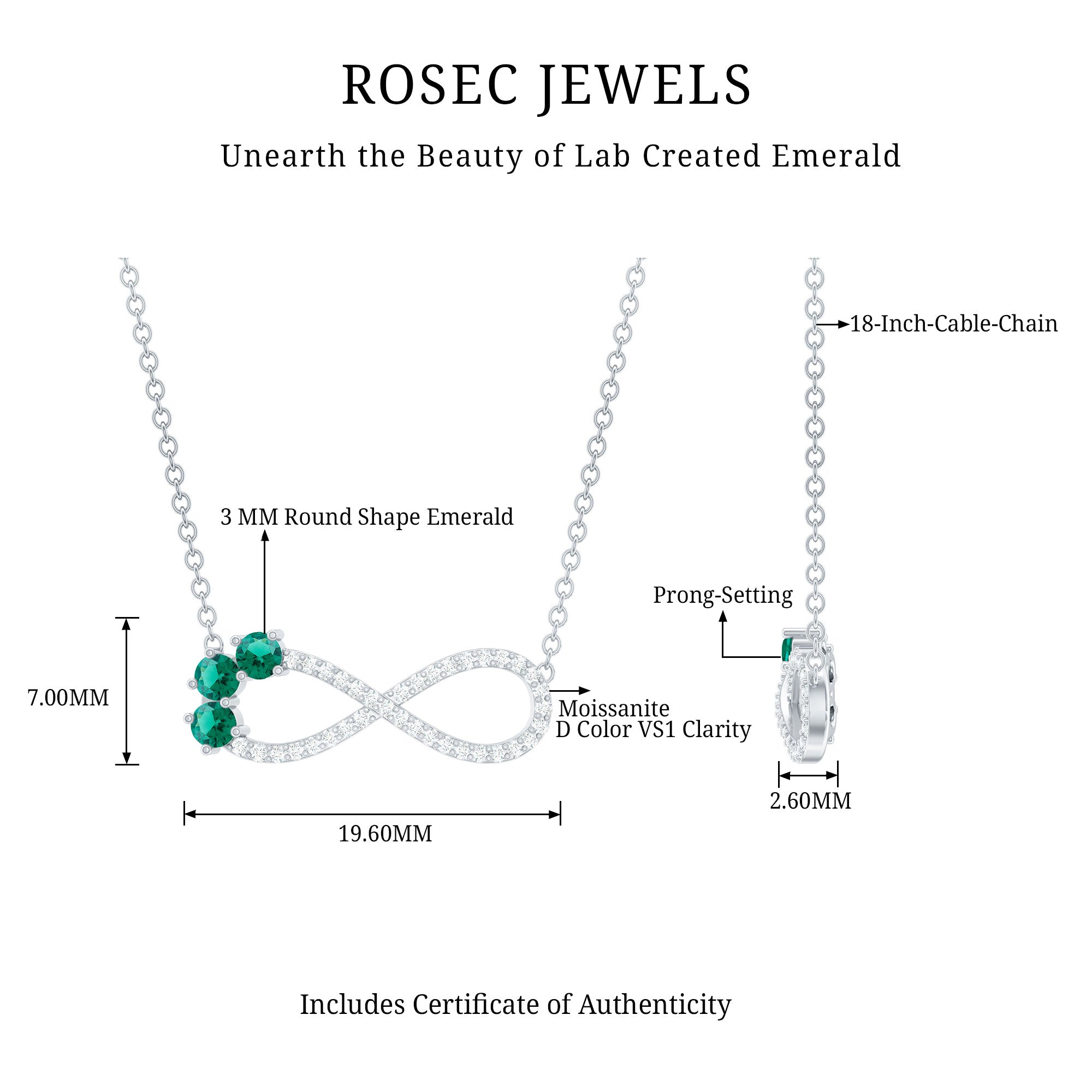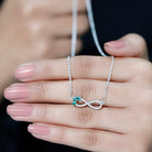 Adorn your neckline with this Moissanite Emerald Pendant, which is a symbol of eternal and everlasting love. This necklace features an vertical infinity frame studded with petite Moissanite Stones and accentuated with round shape lab grown emerald secured in Prong Setting. This Infinity Pendant can be a beautiful gift option for your lady love when you celebrate a milestone in your relationship. This Forever Pendant will always remind her of your unconditional love. This Minimalist Necklace beholds the classic shine of D-VS1 Quality Moissanite and AAAA Quality Lab Created Emerald, and will be delivered to you in premium packaging.