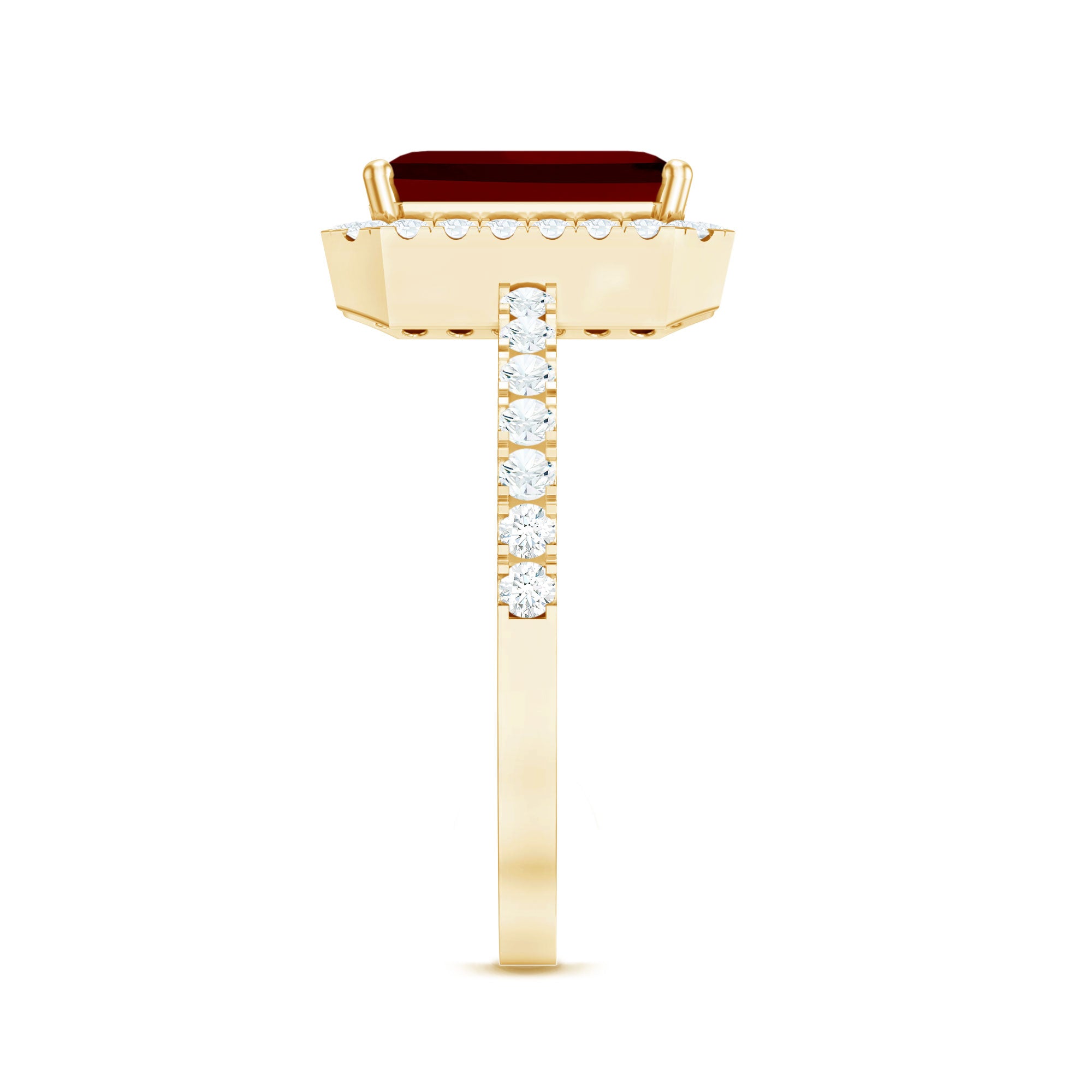 Capture attention with a design that reflects your bold love. This Halo Engagement Ring offers a contemporary take on a classic style, showcasing a breathtaking 7X9 MM emerald cut lab created ruby at its heart. Set in prong setting, the ruby is encircled by a diamond halo that adds a hint of sparkle. It is a timeless piece crafted for the woman who wishes to stand out without uttering a word. To enhance the beauty of the design, more round cut diamonds are incorporated into the band as side stones. These side stones and the halo provide the Lab Created Ruby Engagement Ring with a gentle shimmer that harmonizes beautifully with the rubys boldness. This design feels both timeless and distinctive, ideal for someone seeking an Emerald Cut Engagement Ring with a touch of edge. It comes in an exquisite jewelry box, ready to impress, and includes a certificate of authenticity, ensuring you can trust in its quality. From the very first glance to forever, this Ruby and Diamond Ring serves as a lovely reminder of enduring love.