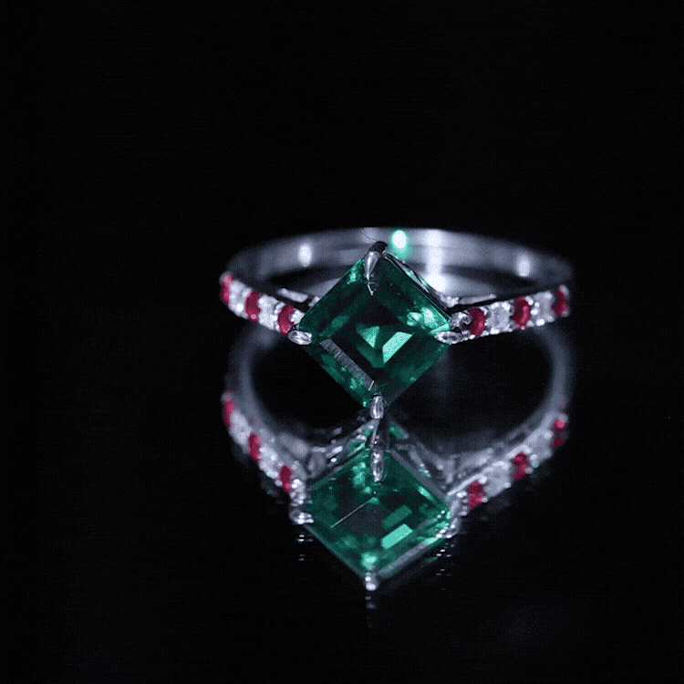 This lab created emerald engagement ring is designed for those who appreciate vibrant contrast and contemporary elegance. The rich green center stone is paired with lab created ruby accents and moissanite detailing, creating a striking harmony of color and light.
