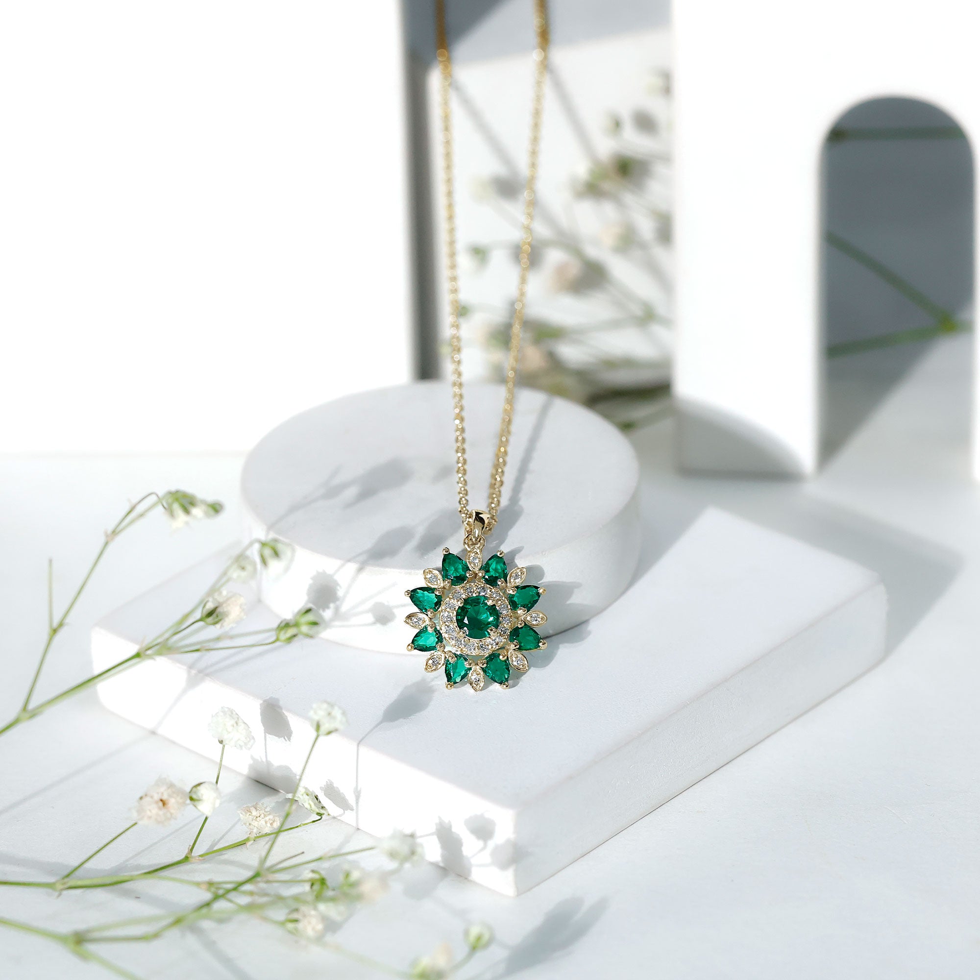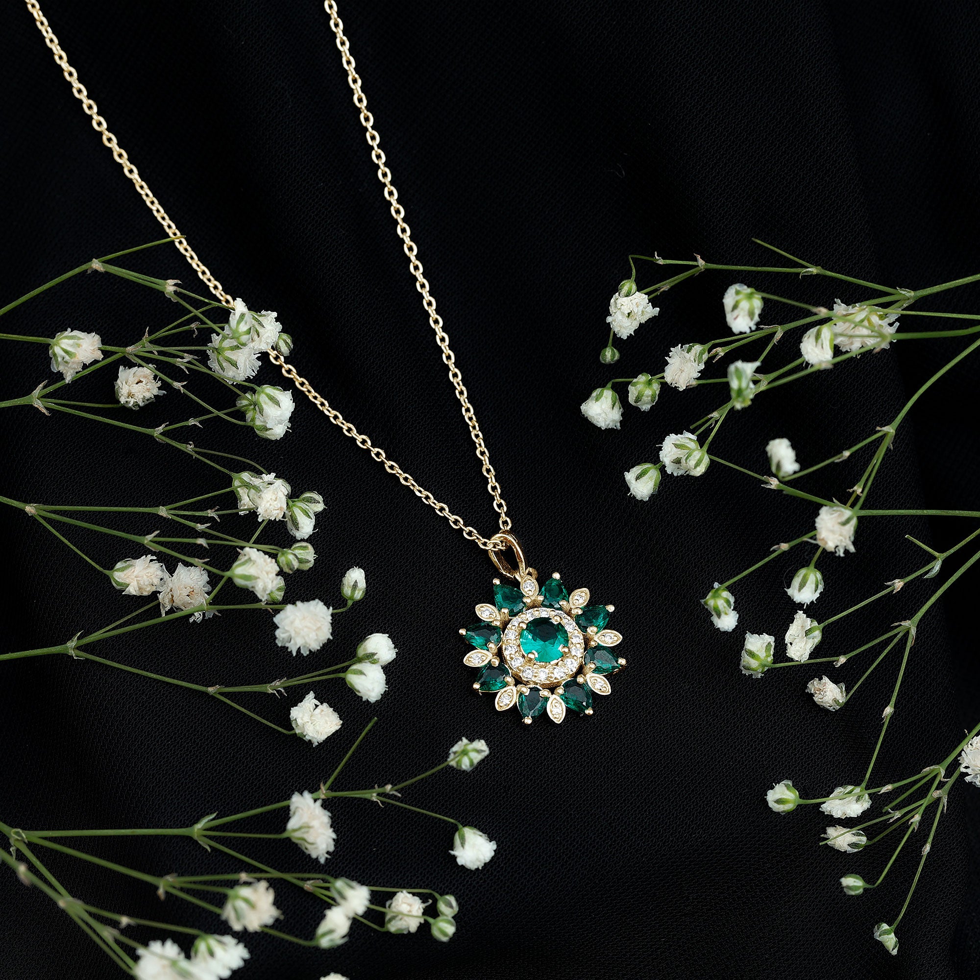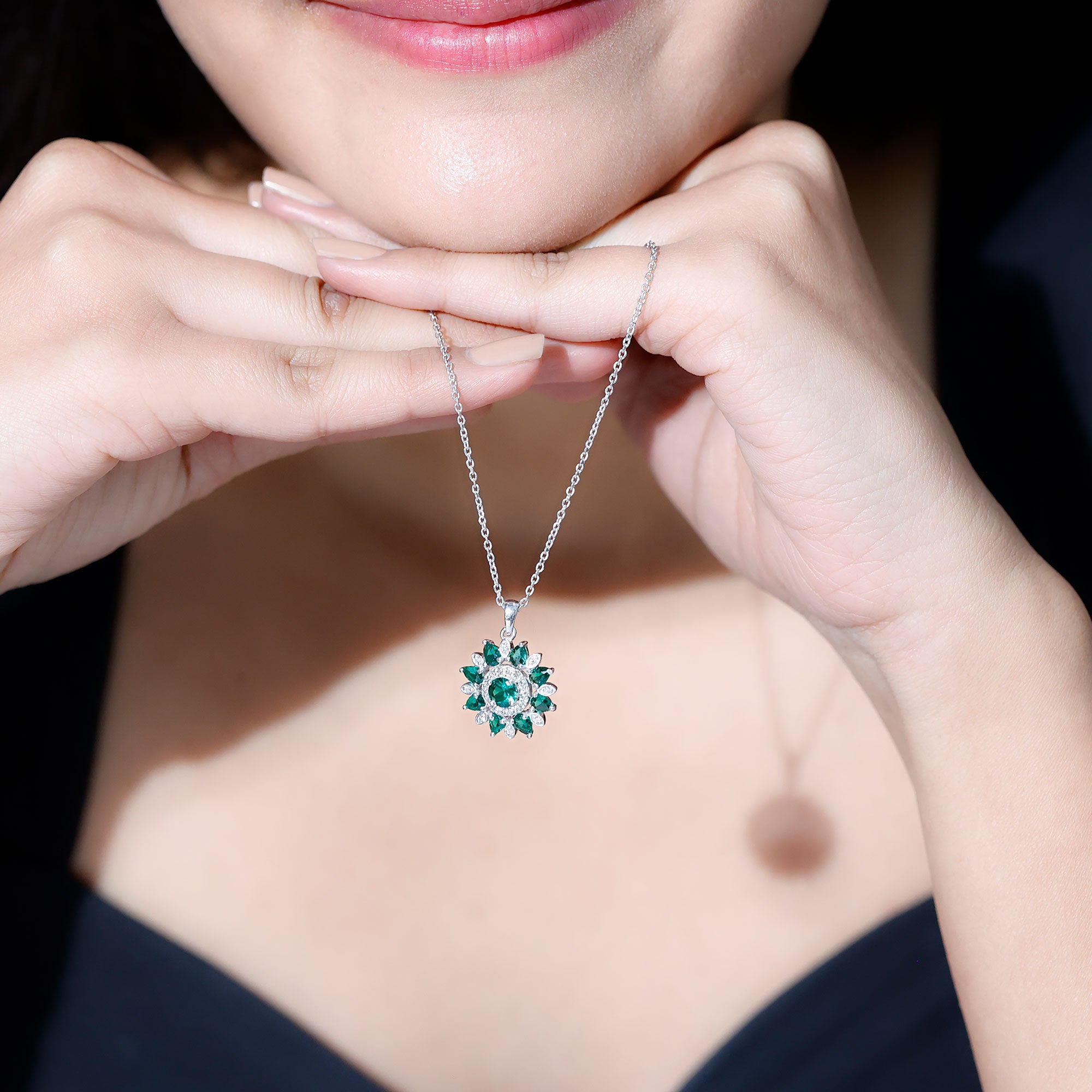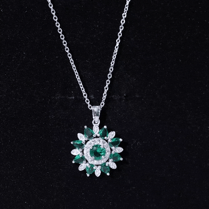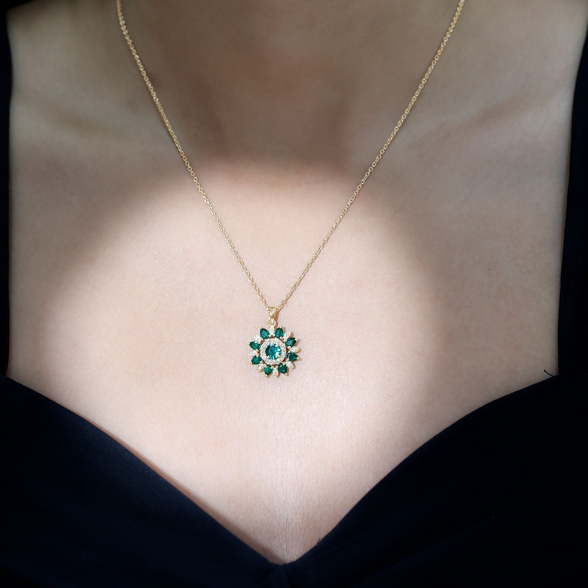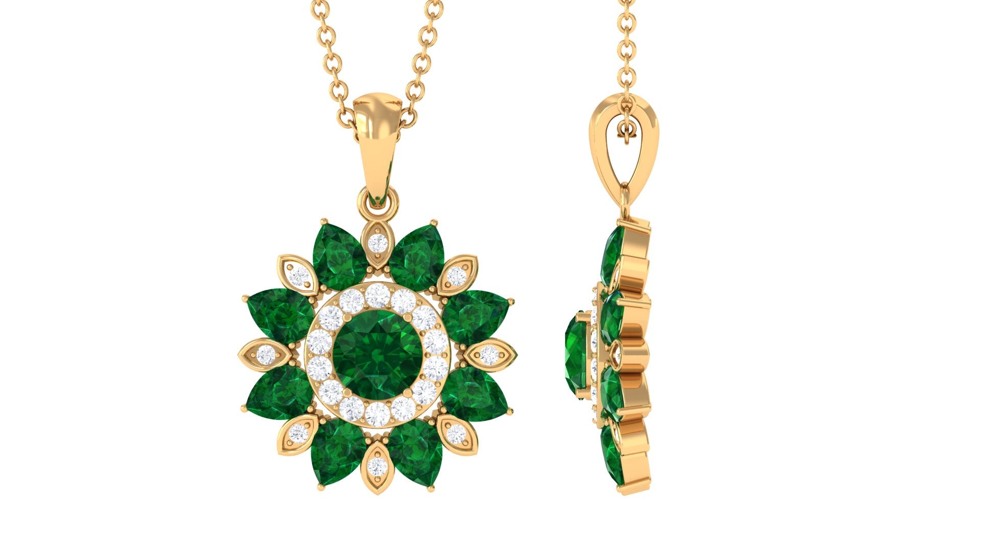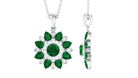The lab created emerald flower cocktail pendant with Diamond is a wearable oasis, capturing the beauty and magic of nature in a stunning piece of jewelry. The pendant features a 5 MM emerald center stone flower, its petals adorned with sparkling Diamond and pear-shaped emerald stones. As you move, the pendant comes alive, its emerald petals shimmering and its Diamond stones twinkling like stars. This pendant is a perfect gift for a woman who loves the beauty of nature and the magic of the universe.