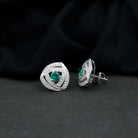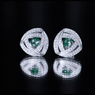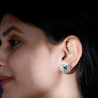 Introducing a dazzling pair of handcrafted Lab Grown Emerald Stud Earrings - a blend of bold elegance and modern luxury. These Triangle Stud Earrings are designed to captivate, featuring a unique, geometric silhouette that stands out in every setting. They are embellished with a 5 MM round cut lab grown emerald held by prongs in the center and boast AAAA quality for that deep green hue. The vibrant centerpiece is encased within an open triangle frame studded with round cut moissanite stones, offering a striking contrast that elevates the overall design. These Cocktail Studs are curated in 14k white gold-plated silver, mixing strength and grace seamlessly. The Geometric Earrings are finished with a secure and comfortable screw back closure, making them perfect for everyday wear or special occasions. Whether you are dressing up a chic evening outfit or adding flair to your daily look, this pair is sure to turn heads and spark conversations.