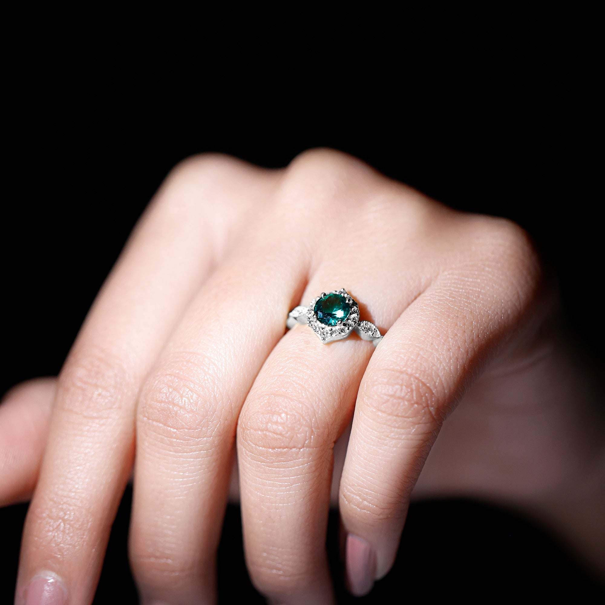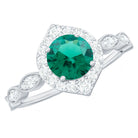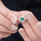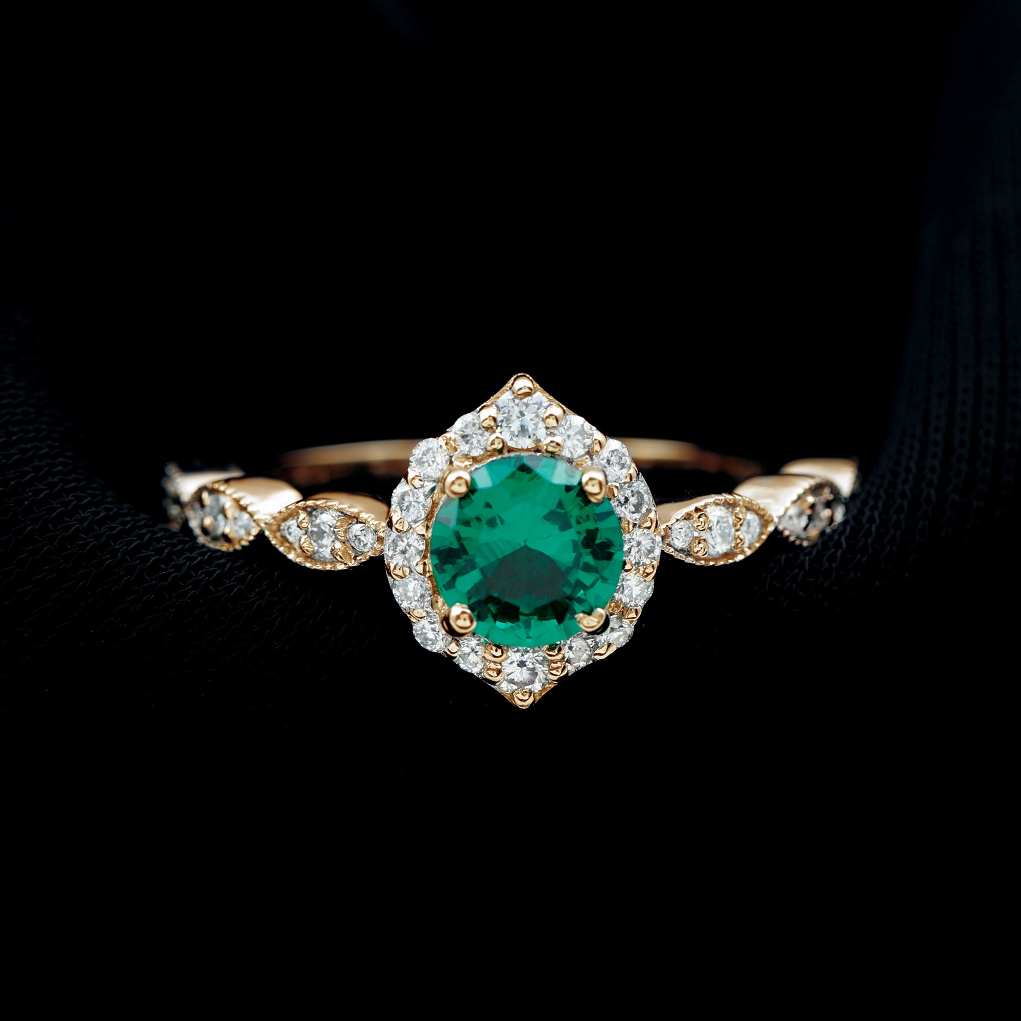 Express your profound feelings of love and affection by gifting your beloved this Vintage Inspired Emerald Engagement Ring. This stunning Antique Looking Ring features a vibrant 6 MM Round Shape Lab Created Emerald at the center, radiating its beautiful green hue, and surrounded by an exquisite Round Shape Diamond Halo. Additional diamonds are placed in a delicate scalloped pattern band, and fine milgrain detailing along the edges gives the piece a vintage inspired look. Crafted from AAAA quality lab grown emerald and HI-SI quality diamonds, this Halo Engagement Ring is a perfect fit for women who appreciate antique and artistic jewelry. Its intricate design and vintage-inspired aesthetic make it a truly unique piece that your partner will cherish for a lifetime. Whether you are marking a birthday, anniversary, engagement, or simply giving a thoughtful gift, this design fits any meaningful occasion. Lightweight and comfortable to wear, this Emerald and Diamond Ring has a simple yet eye-catching look. Its classic shape and quality craftsmanship make it a piece you will enjoy for years.