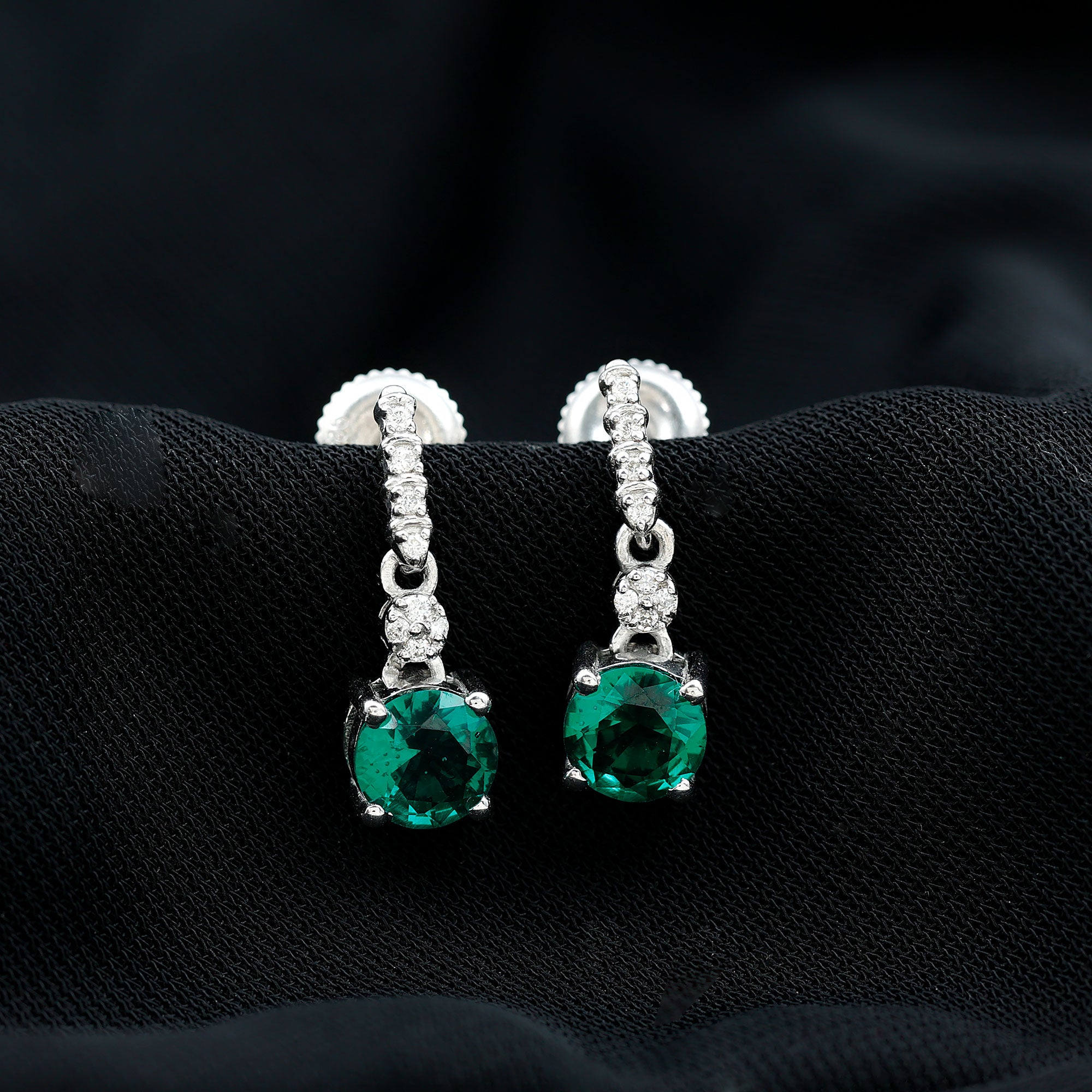 These stunning Lab Created Emerald Earrings feature a beautiful mix of color and shine that brings a classic elegance. When you wear these unique Emerald Drop Earrings, they look amazing with any outfit. Adorned with 6 MM round cut lab created emeralds in prong setting, they dangle gracefully with D-VS1 Quality Moissanite sparkling from the top, creating a dazzling effect that catches the light beautifully with every move. We have added a screw back closure for a secure and comfy fit all day long. These Lab Emerald Wedding Earrings enhance your style with their timeless charm and subtle elegance, making them ideal for special occasions. Enjoy the luxury of royalty with their classic sophistication and modern versatility. They also strike a perfect balance between traditional charm and a contemporary vibe.