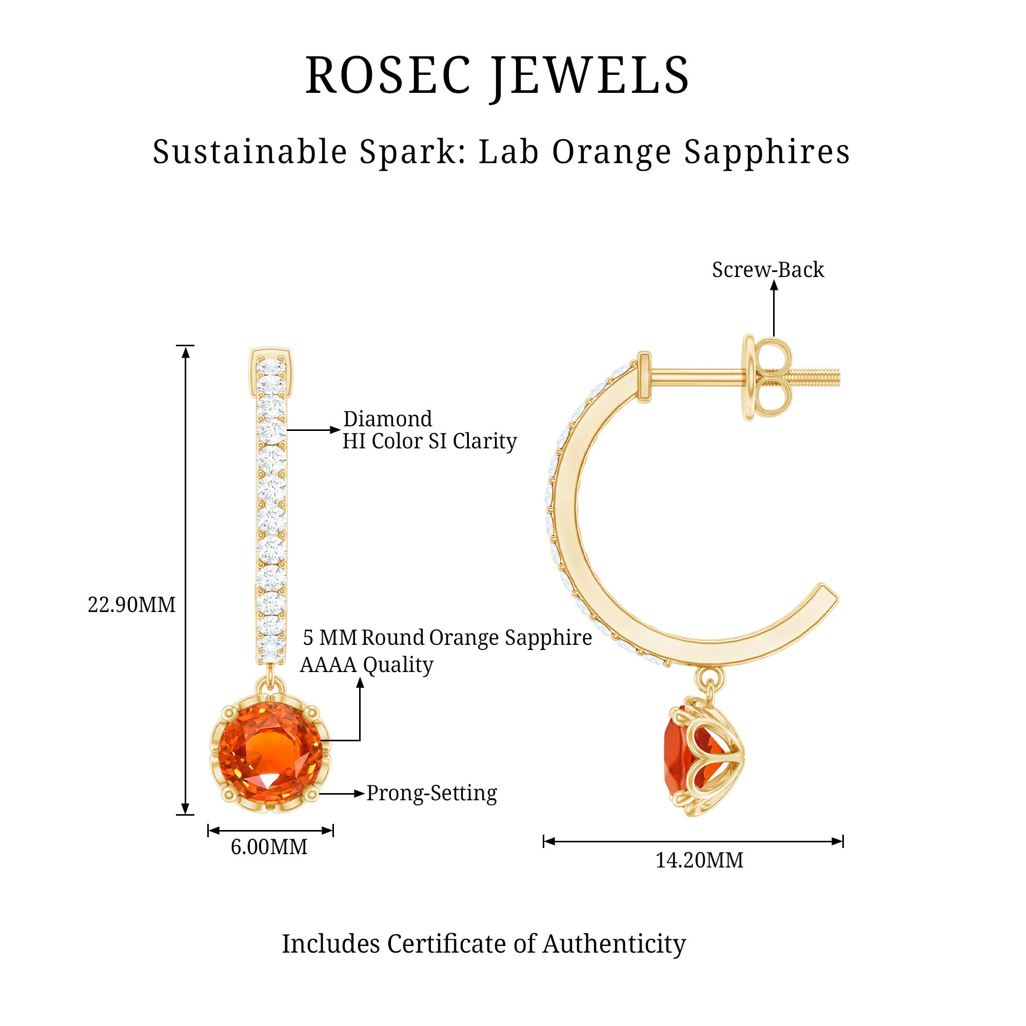 Add a spark of sunshine to your style with these stunning Lab Grown Orange Sapphire Earrings. Designed to bring out your inner glow, these Hoop Drop Earrings combine timeless beauty with modern charm. Each earring features a brilliant 5 MM round cut lab created orange sapphire that shines with a warm glow. The stone hangs gracefully from a sleek half-hoop design, giving the piece a refined and elegant look. The half hoops are carefully adorned with shimmering round cut diamonds, adding just the right amount of sparkle without being too flashy. Together, the orange sapphire and diamonds create a beautiful balance of color and brilliance that instantly catches the eye. These Sapphire and Diamond Earrings are made for women who love to express their confidence and style in a subtle yet striking way. Whether you are dressing up for a special event or adding a touch of elegance to your everyday look, these Orange Sapphire Hoop Earrings are perfect for any occasion. The secure screw back closures ensure a comfortable and safe fit, so you can wear them all day with ease. Their versatile design makes them easy to pair with both casual and formal outfits, making them a must-have addition to any jewelry collection.