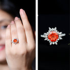 Turn heads and light up the room with this breathtaking Orange Sapphire Halo Ring - an eco-conscious statement piece that also serves as a bold and unforgettable engagement ring. At its heart sits a vibrant 8 MM round cut lab created orange sapphire, secured in claw setting. Encircling the brilliant orange center stone is a floral-inspired halo made up of alternating marquise and round lab created diamonds. This dynamic halo enhances the glow of main gem and gives the Cocktail Ring a romantic yet regal presence. The band adds extra sparkle, with round lab created diamonds adorning each shoulder. Crafted entirely with lab grown gemstones, this Orange Sapphire and Diamond Engagement Ring is not only stunning but also a responsible choice for those who value sustainability and ethical sourcing. Every stone is created with precision and care, offering exceptional clarity and brilliance without harming the environment. Whether you are marking a lifelong commitment or making a fashion-forward statement, this 2 Carat Orange Sapphire Ring is bold, elegant, and full of meaning - a celebration of color, conscience, and everlasting beauty.
