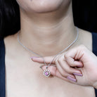 This Sapphire and Diamond Necklace is a graceful celebration of elegance, nature, and love. Designed for those who appreciate ethical beauty and timeless charm, this Flower Necklace blends sophistication with sustainability. Crafted in 14k white gold plated silver, the Snowflake Necklace features a dazzling AAAA quality lab created pink sapphire at the center set in prong setting. Surrounding it is a burst of brilliance from EF-VS quality lab grown diamonds, delicately arranged in a snowflake pattern. The design feels like a perfect mix of winter wonder and floral freshness, making it ideal for both cold seasons and sunny days. The Pink Sapphire Pendant hangs from a polished nail and comes with a matching chain for easy styling. Whether you are dressing up for a special dinner or adding a meaningful sparkle to your everyday look, this necklace is the perfect companion. Ethically made with lab created stones, this Floral Pendant is a beautiful choice for anyone who values sustainable and responsible luxury. Plus, it comes with a certificate of authenticity and is packed in a premium jewelry box, making it an ideal gift for birthdays, anniversaries, or a just-because moment.