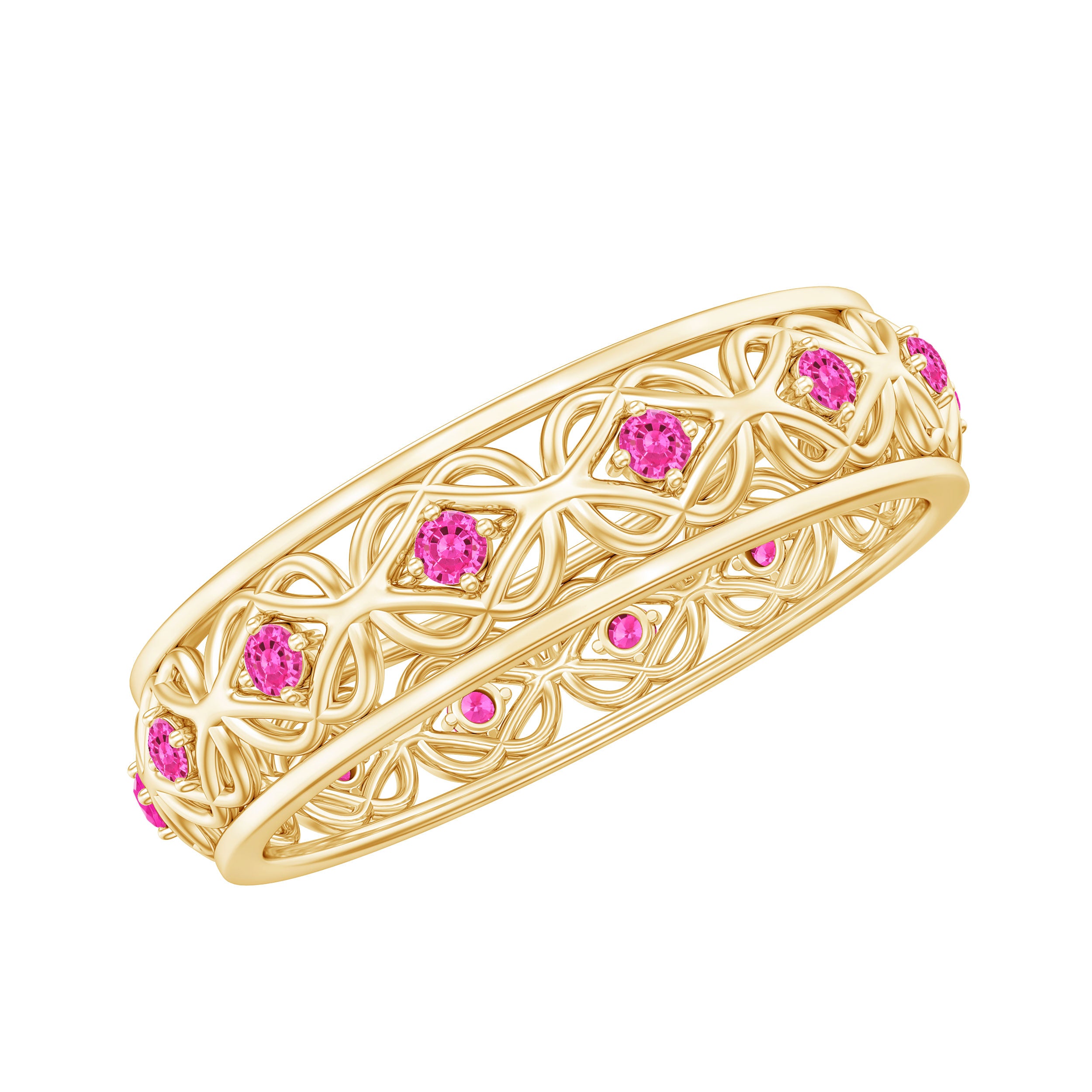 Complement your outfit with this gorgeous Celtic Band Ring crafted with Gold. This Band Ring for Women is adorned with Round Shape Lab Created Pink Sapphire in 4 Prong Diagonal Setting with Celtic Details to make for a charming accessory for special occasions.