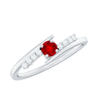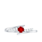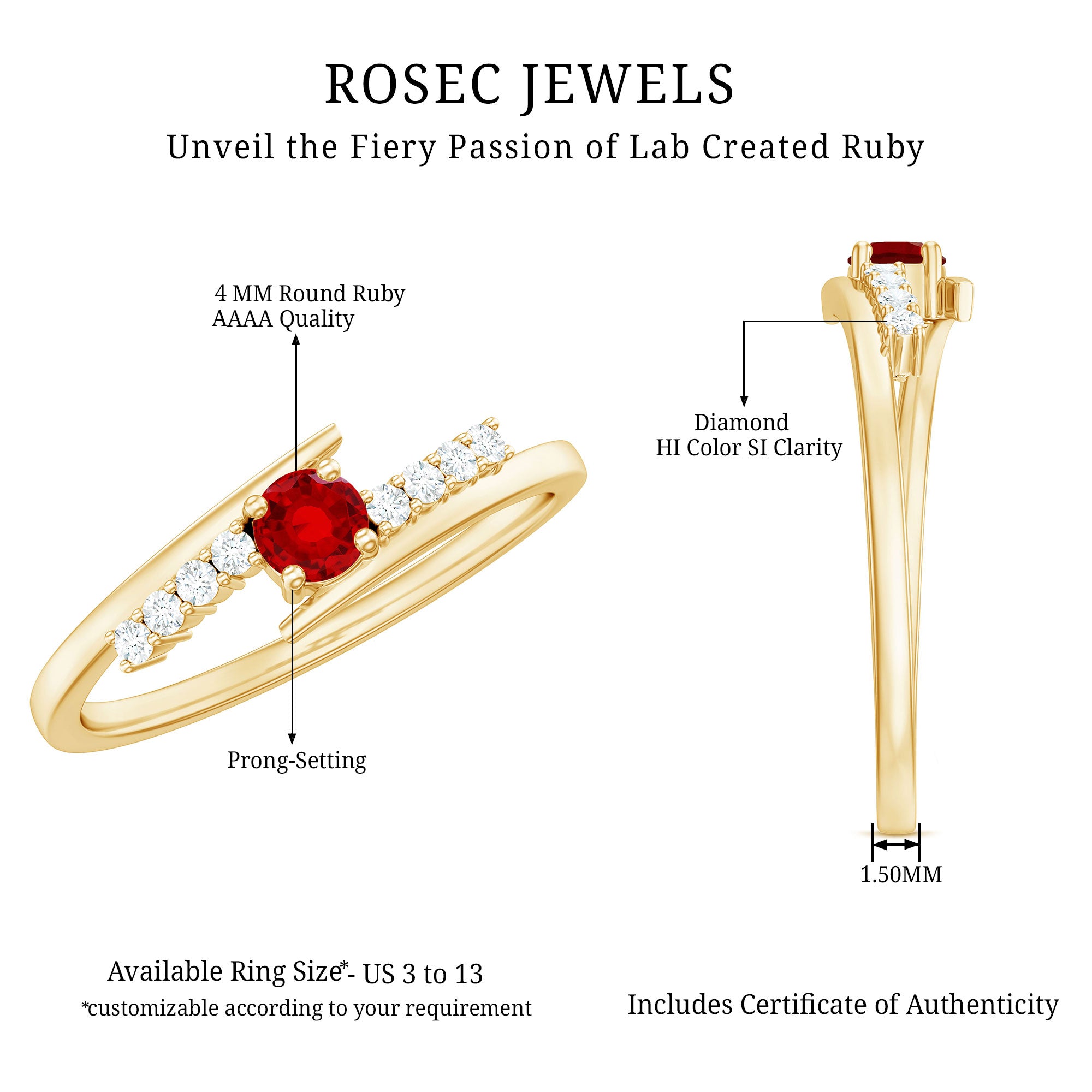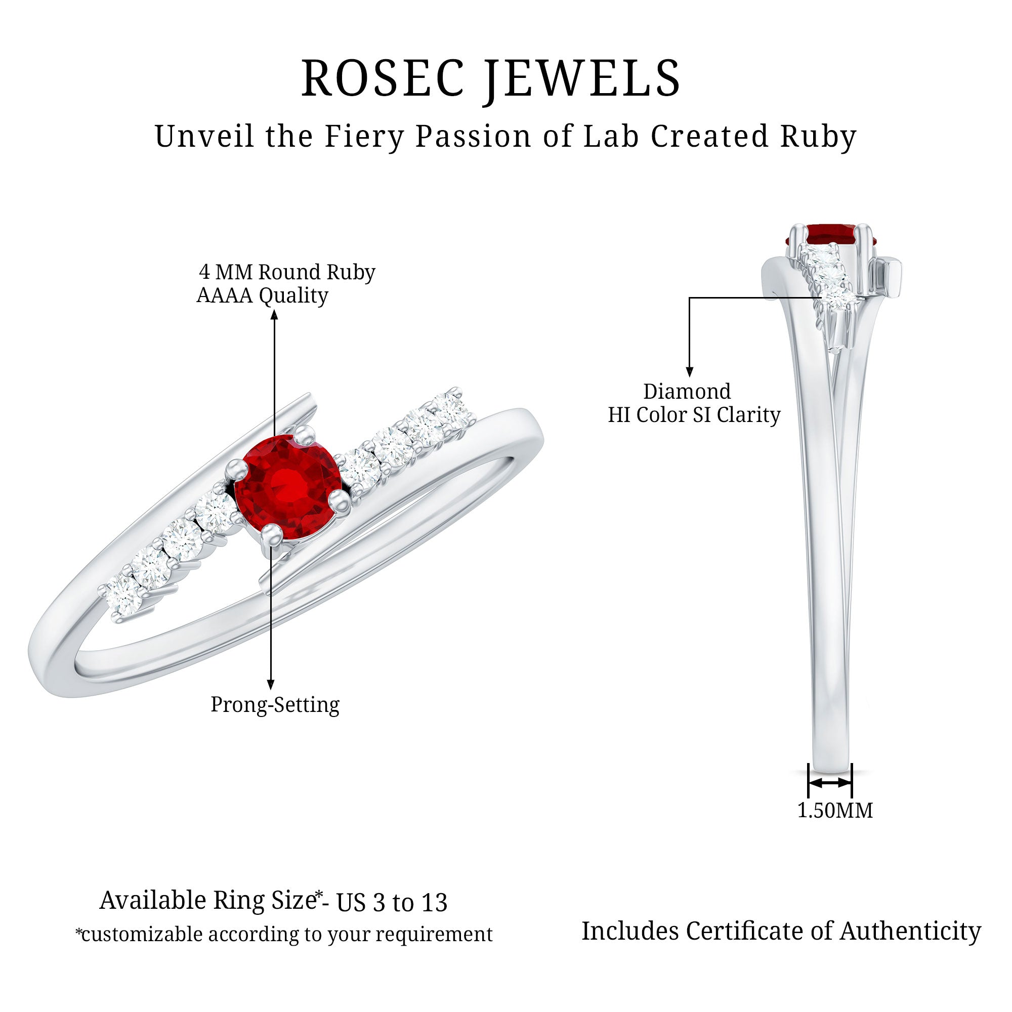 This stunning Ruby Promise Ring puts a modern spin on a classic style, representing a bond that strengthens with each day. At its core, it features a 4 MM round cut lab created ruby securely held in prong setting. On either side of the center stone, there is a row of sparkling round diamonds, all elegantly arranged on a bypass shank that curves gently to embrace the main gem. Whether you are celebrating a promise, a special occasion, or just showing your love, this Bypass Promise Ring makes a statement with its simple beauty and sophisticated design. The AAAA quality lab created ruby and HI-SI quality diamonds provide amazing fire and brilliance. Designed to suit any personal style, this Lab Created Ruby Ring for Women comes in a variety of metal colors and purities, so you can tailor it to your liking. It is lightweight and comfy for daily wear, making it a perfect match for both casual and formal looks. This Ruby and Diamond Ring also comes with a certificate of authenticity and is beautifully packaged in a luxurious jewelry box, ready to make your gifting experience unforgettable.