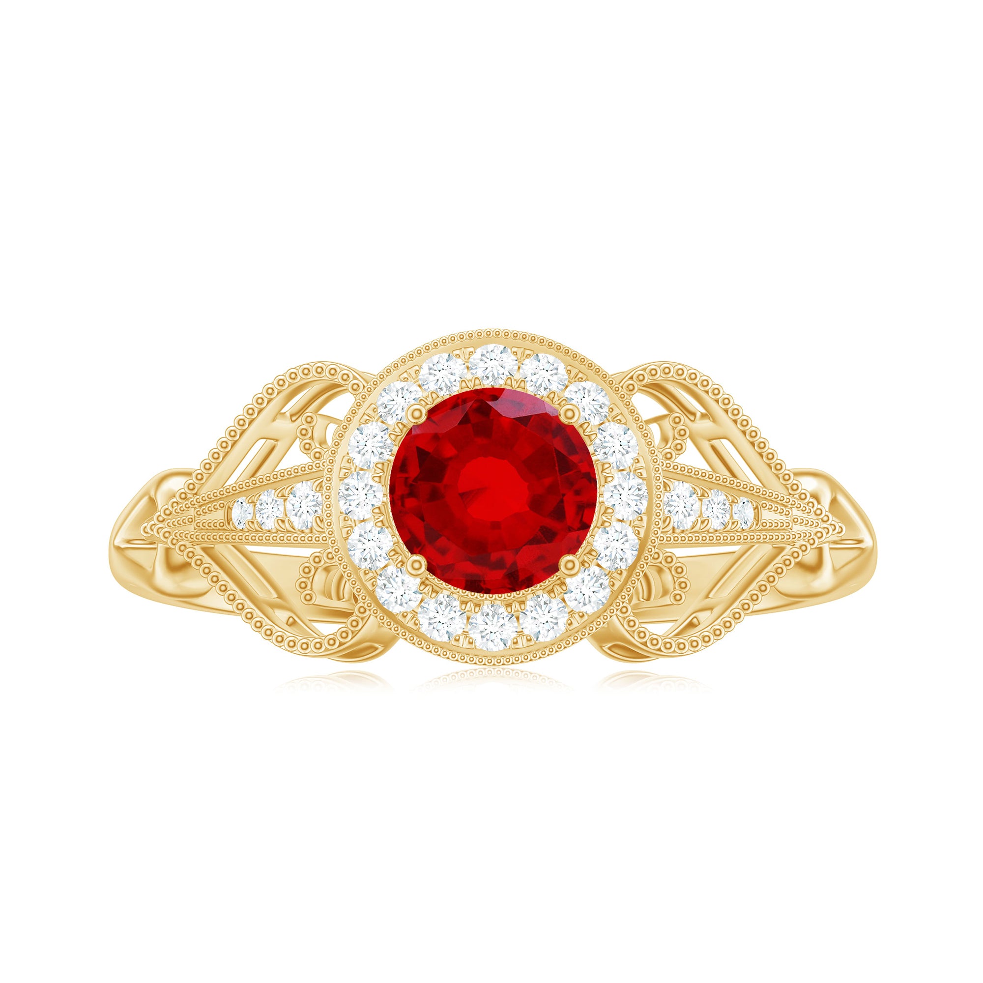 When your love story deserves something bold and beautiful, this Vintage Ruby Engagement Ring brings just the right mix of elegance and charm. Designed to feel both classic and special, it is the kind of piece that instantly catches the eye and holds the heart. At the center of the Antique Looking Engagement Ring is a stunning 5 MM round lab created ruby set in a secure prong setting. Surrounding the ruby is a delicate halo of sparkling diamonds, creating a soft shimmer that makes the ruby stand out even more. The band is where vintage inspiration truly shines. Fine beaded detailing runs along the sides, giving the Ruby and Diamond Ring an antique touch that feels romantic and full of character. Additional small round diamonds are set along the shoulders of the band, adding just enough sparkle without making the Vintage Ruby Ring feel too flashy. Every detail is carefully crafted to balance beauty with meaning, making it a lovely choice for someone who appreciates timeless design with a personal touch. The Lab Grown Ruby Ring comes in a beautiful box, ready to be gifted or treasured.