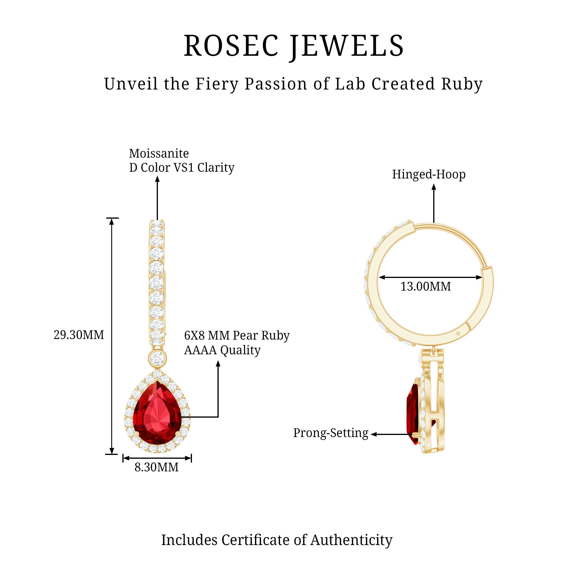 Glistening with charm and sophistication, these Ruby Teardrop Earrings are designed to bring elegance and vibrance to every moment. At the center of each earring rests a 6X8 MM pear shaped lab created ruby, set in prong setting. Surrounding the ruby is a halo of sparkling moissanites, creating a radiant frame that enhances the gemstone’s rich color and gives it a captivating brilliance from every angle. The drop design hangs gracefully from a hoop that is embellished with round moissanite stones, adding an extra layer of sparkle and refinement. The contrast between the bright D-VS1 quality moissanites and the AAAA quality lab grown ruby creates a perfect balance of warmth and light, making these Huggie Hoop Earrings stand out with understated luxury. Crafted with care and precision, the hinged hoop closure ensures a secure and comfortable fit, allowing for easy wear throughout the day or evening. Whether paired with a sleek evening gown or a simple outfit, these Ruby and Moissanite Earrings bring a sense of glamour and grace that never goes unnoticed. Ideal for special occasions or as a cherished gift, they symbolize passion, strength, and confidence. Presented in a beautifully designed jewelry box, these Ruby Drop Earrings are ready to make any moment unforgettable.