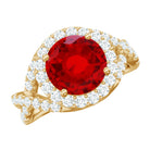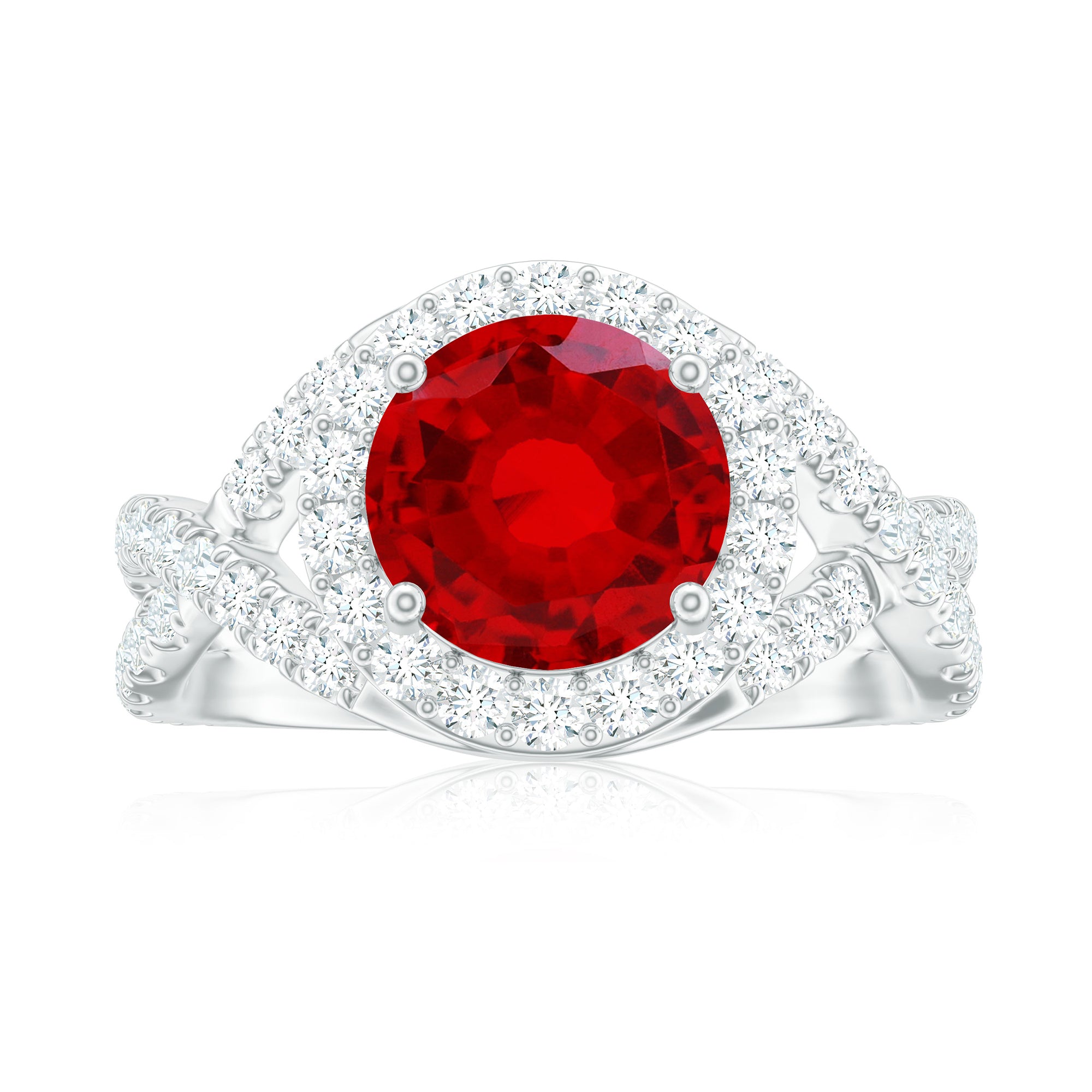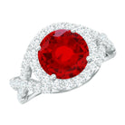 Two paths, one promise; this exquisite Certified Ruby Engagement Ring truly embodies that sentiment. Crafted to evoke a sense of romance and timelessness, it is a piece that narrates a story each time you gaze upon it. At its heart lies a radiant 8 MM round cut lab created ruby, securely held in prong setting. Encircling the central stone is a halo of shimmering moissanite stones, providing just the right touch of brilliance. What elevates this Ruby and Moissanite Ring is its unique crossover shank design, where two bands elegantly twist together, symbolizing the union of two lives into one. The band is adorned with additional round moissanite stones along the twist, ensuring the Crossover Ring sparkles beautifully from every perspective. Tailored for those who appreciate sophisticated styles with a contemporary flair, this Halo Engagement Ring radiates charm and elegance. Every aspect, from the contrasting stones to the intertwined band, is meticulously crafted with attention to detail and quality. It is stunning, significant, and perfect for everyday wear, ready to weave itself into your love story, now and forever.