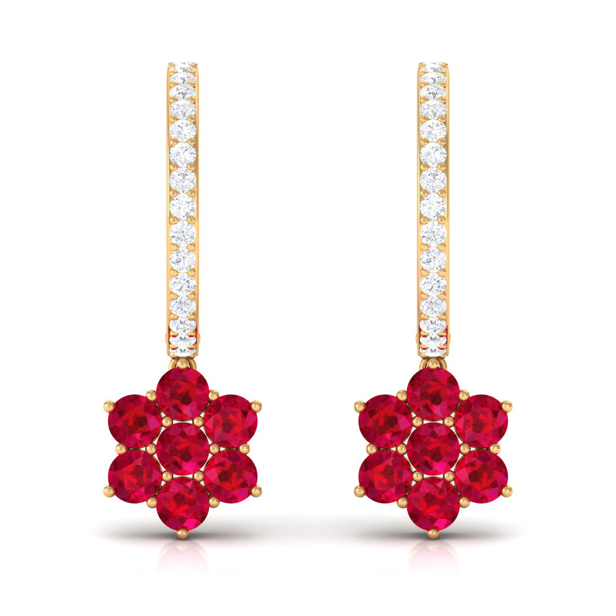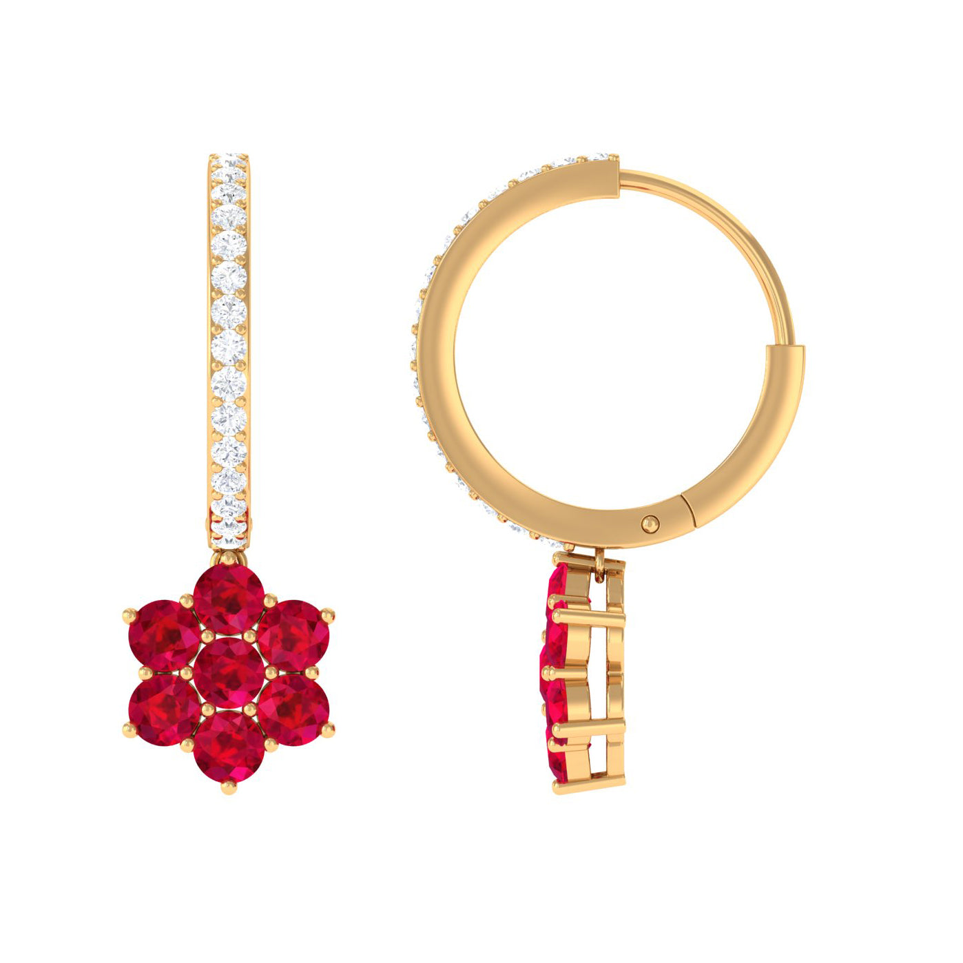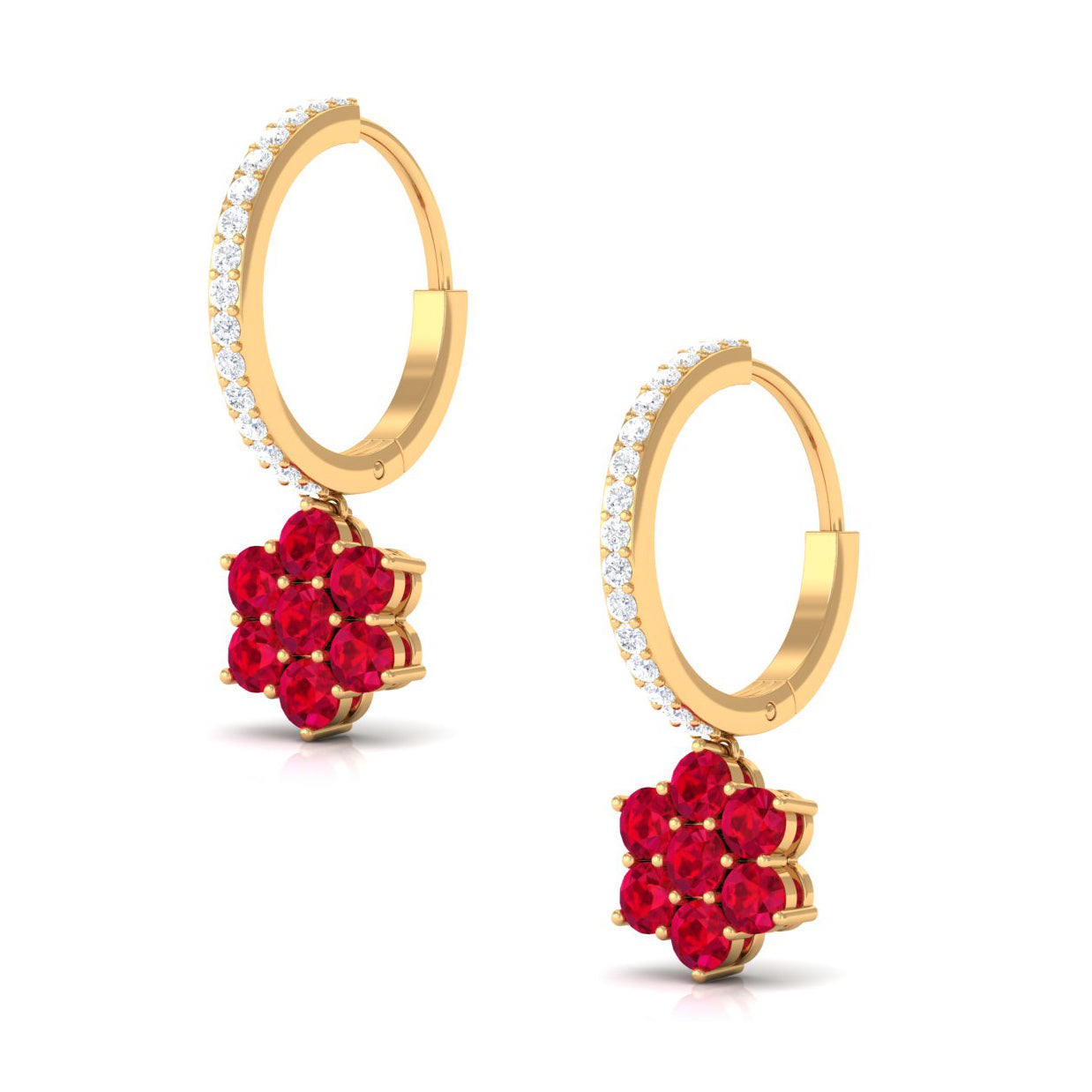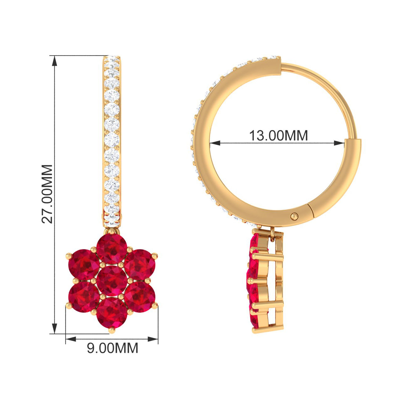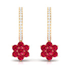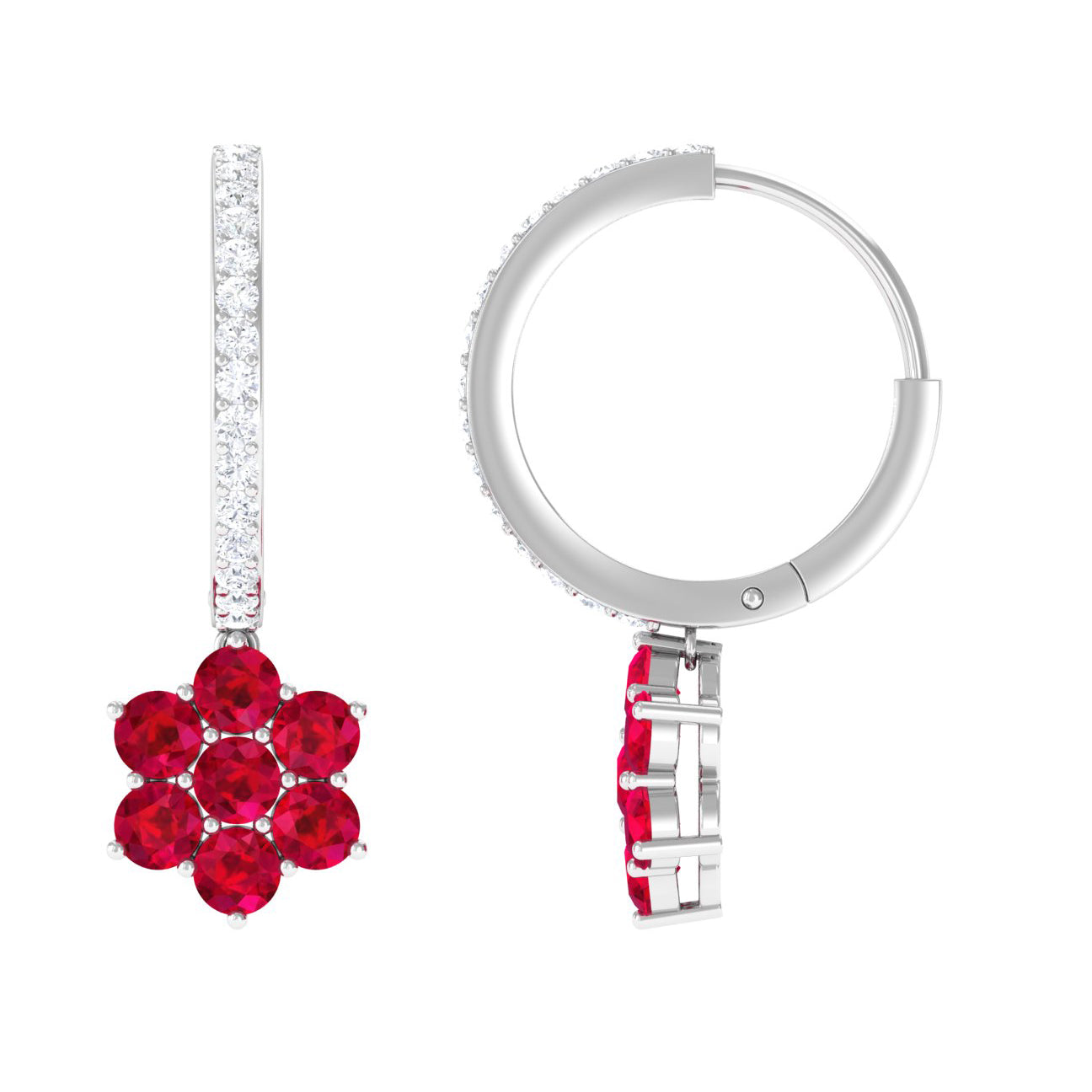 Lab Created Ruby Flower Drop Hoop Earrings with Diamond