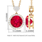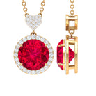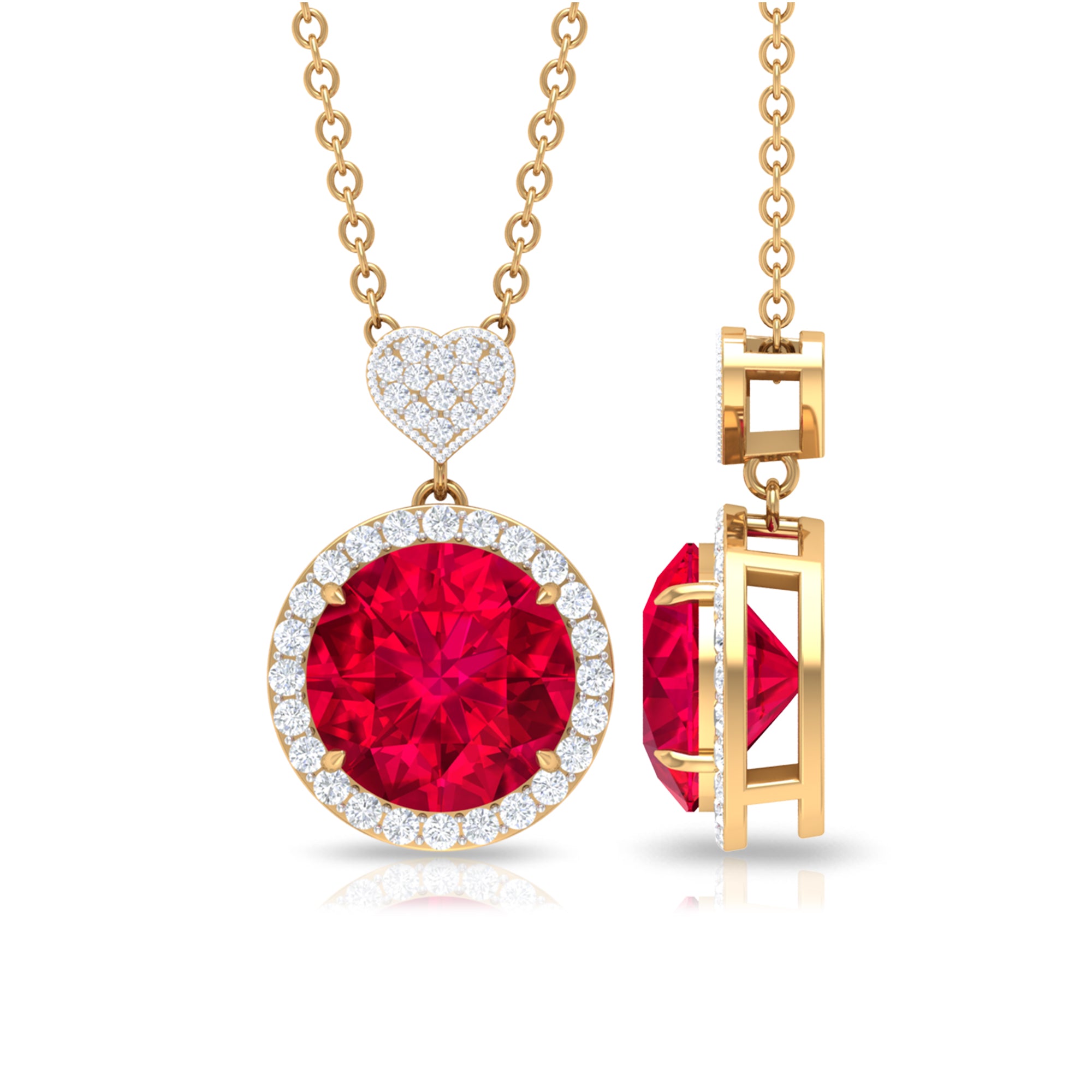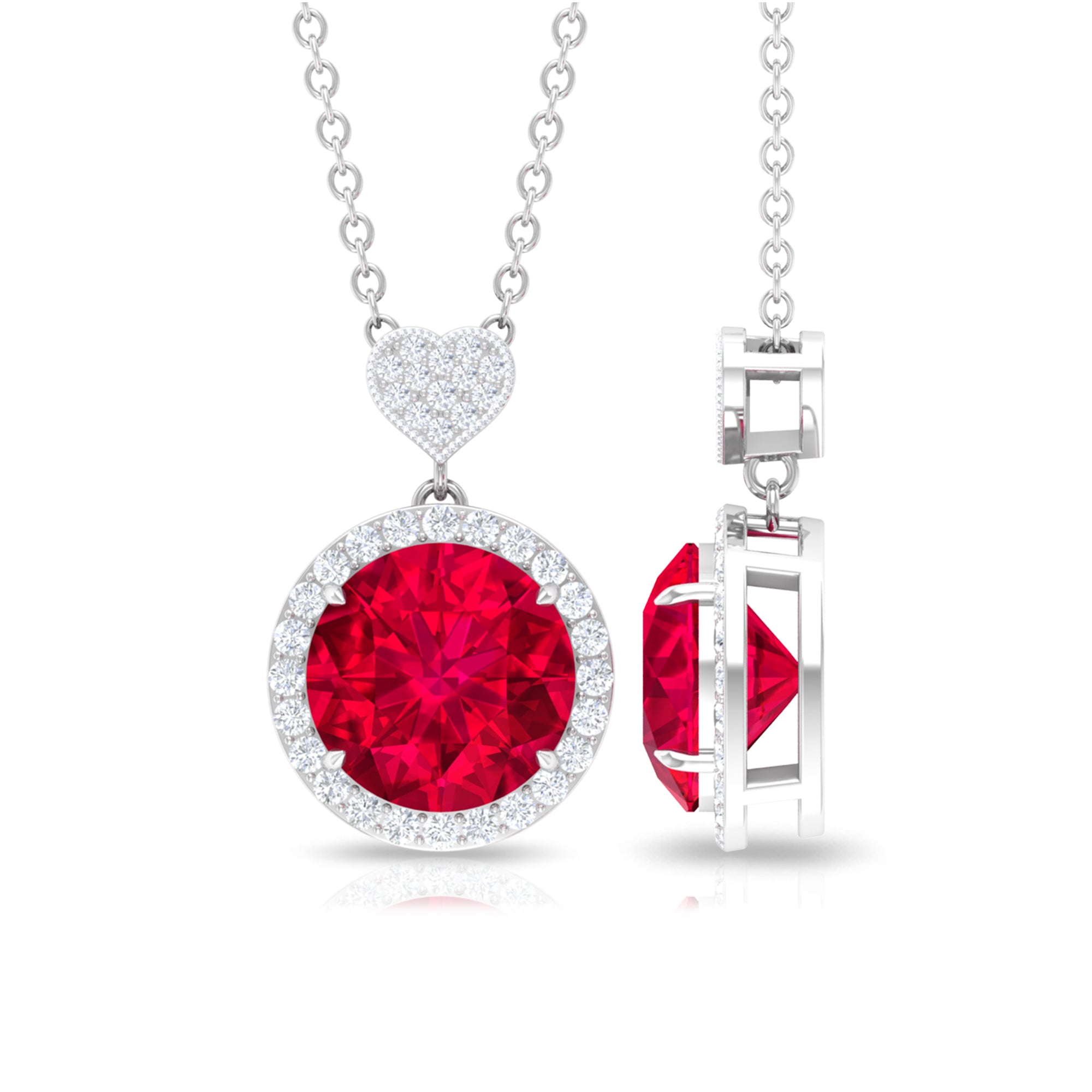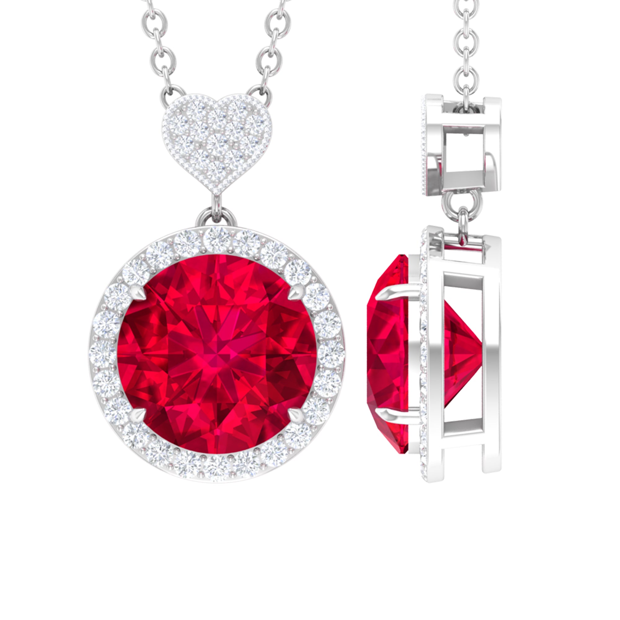 Looking for jewelry that completes your look with a bold touch, here we got your back with this Lab Grown Ruby Pendant. It features an 8 MM Round Shape Lab Created Ruby Securely placed in Claw Setting encircled by Halo of Diamond also at the top of the pendant there is a diamond studded heart which beautifies the look of this pendant. This Bridal Necklace exudes a classic shine of AAAA Quality Lab Grown Ruby making it perfect to complete your look and can also be paired with matching studs. This pendant will be delivered to you in premium quality jewelry box with the certificate of authenticity.