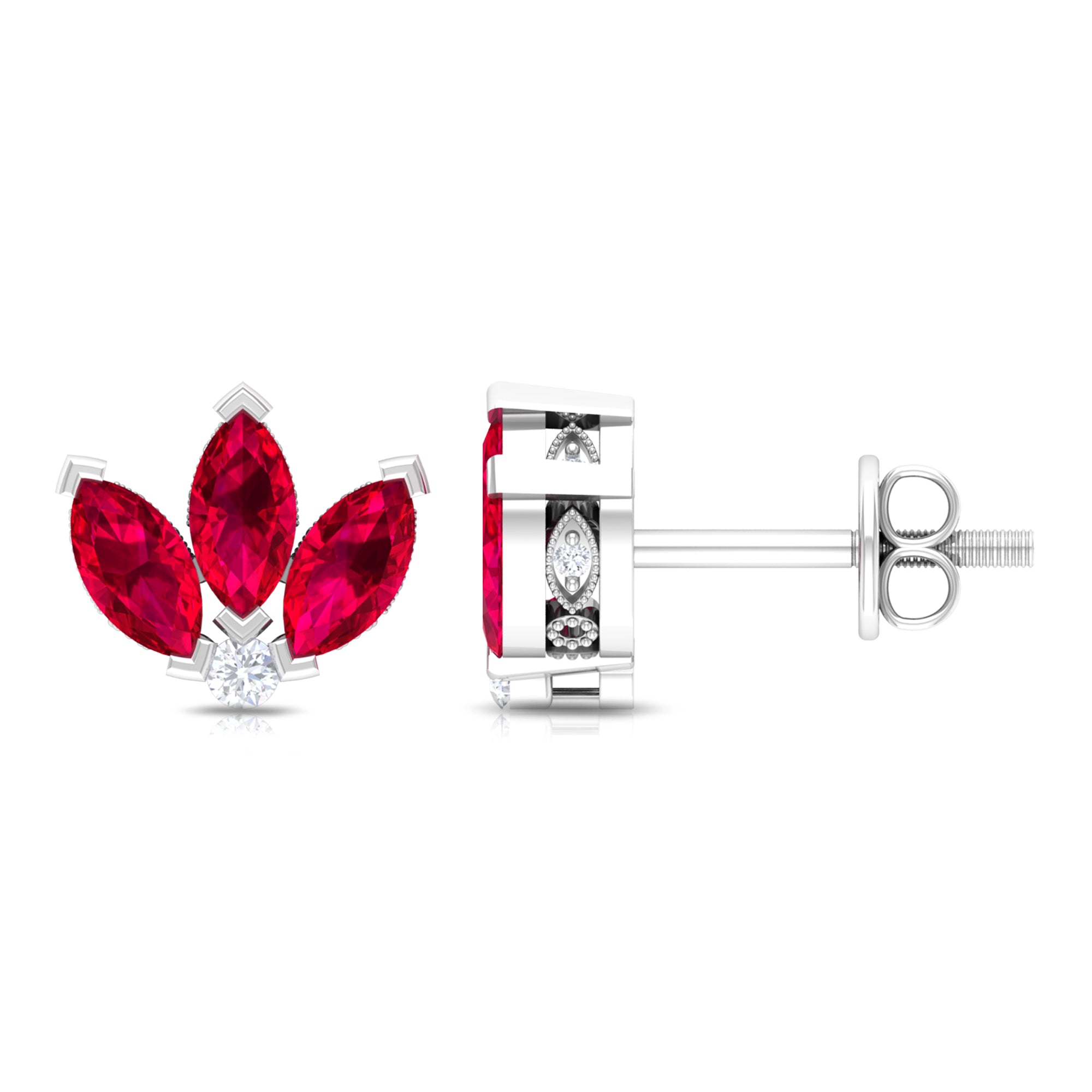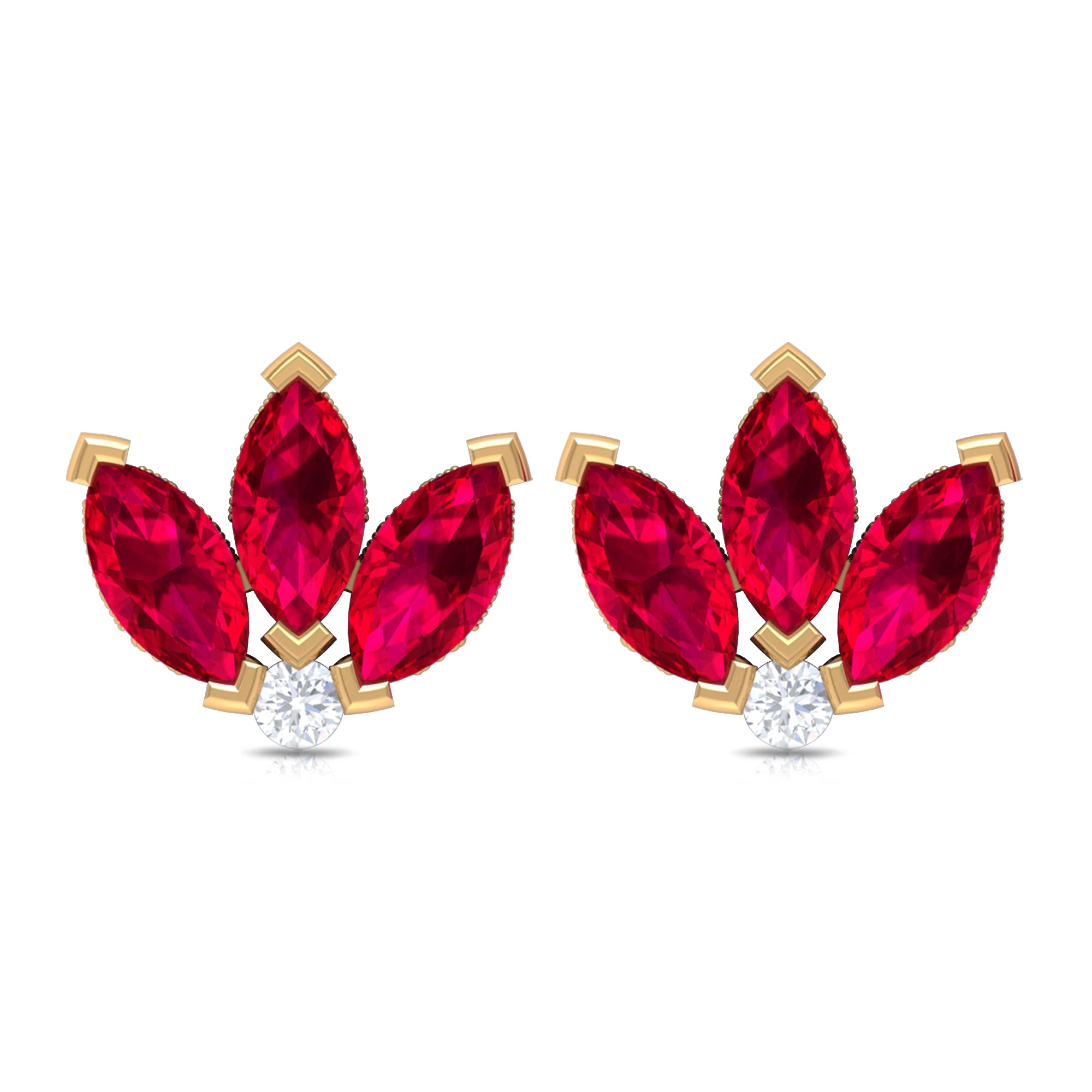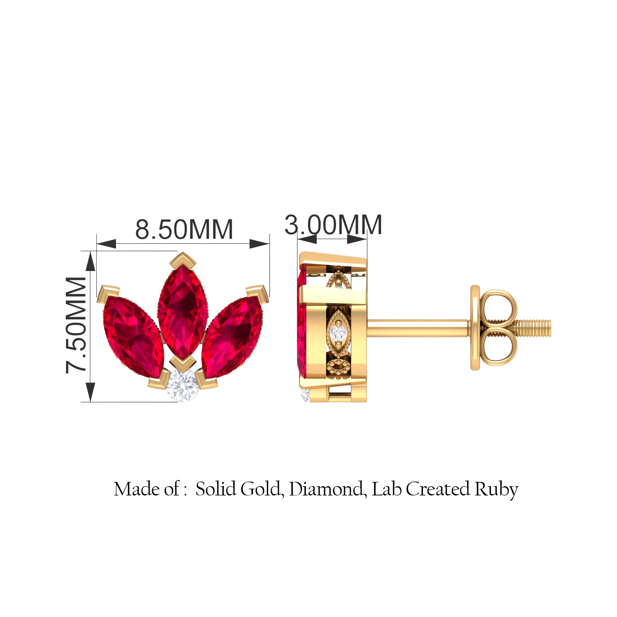Embrace the charm of nature with these beautiful Ruby and Diamond Earrings, designed to add a touch of elegance and grace to your look. Curated with a delicate lotus inspired design, brought to life with three marquise cut lab created rubies, securely set in V-prong setting, forming graceful petals that capture the essence of the lotus flower. At the base of the design sits a sparkling round diamond, adding a gentle shimmer and completing the floral look with refined beauty. The combination of the AAAA quality lab made rubies and the subtle sparkle of the HI-SI quality diamond creates a harmonious balance of color and light, making these Lotus Flower Earrings perfect for both everyday wear and special occasions. Carefully crafted with attention to detail, these Ruby Stud Earrings are available in various metal options to suit your style. The secure screw back closures ensure comfort and safety, allowing you to wear them with confidence all day long. These Lab Grown Ruby Earrings come with a certificate of authenticity and are beautifully presented in a premium jewelry box, making them an ideal gift for someone special or a lovely treat for yourself.