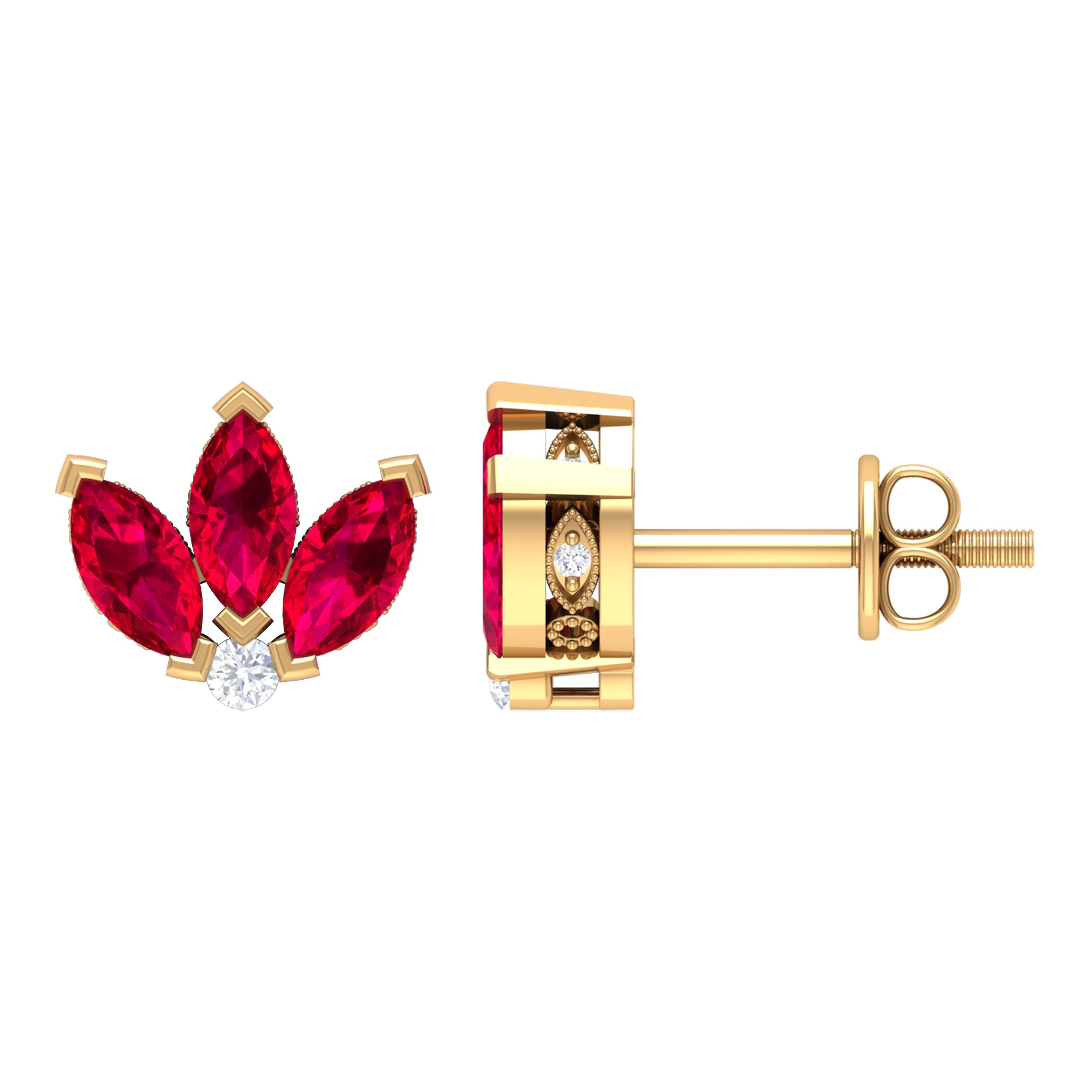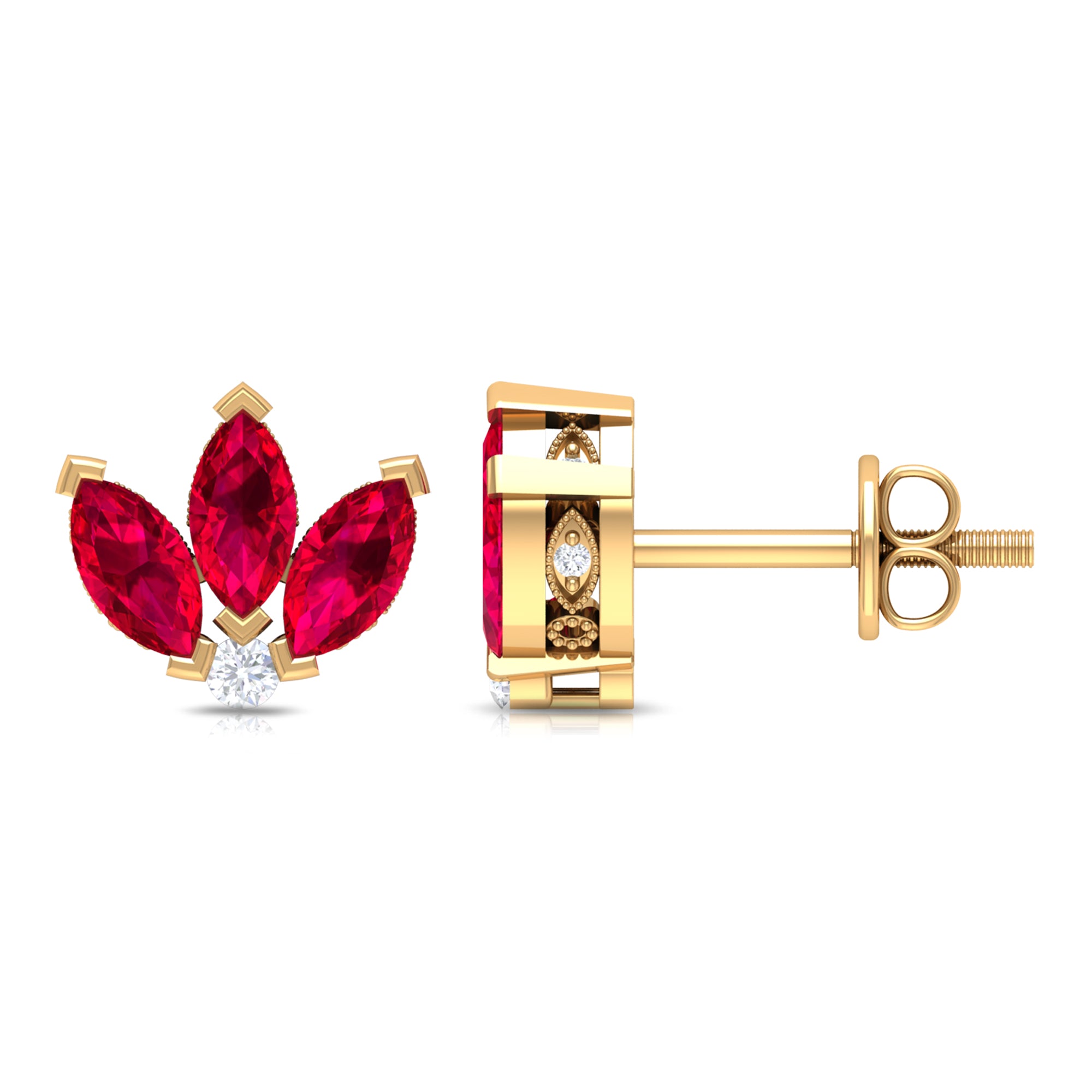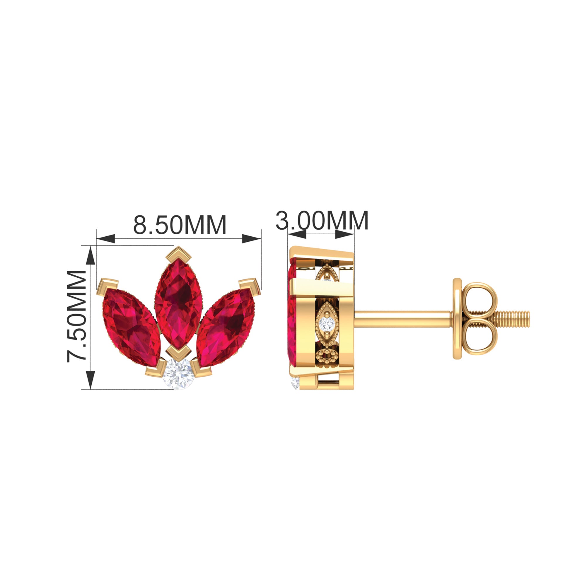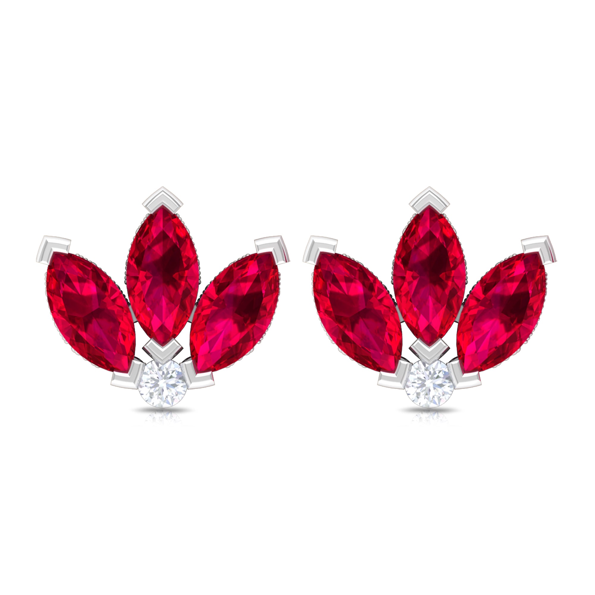 Embrace the charm of nature with these beautiful Ruby and Diamond Earrings, designed to add a touch of elegance and grace to your look. Curated with a delicate lotus inspired design, brought to life with three marquise cut lab created rubies, securely set in V-prong setting, forming graceful petals that capture the essence of the lotus flower. At the base of the design sits a sparkling round diamond, adding a gentle shimmer and completing the floral look with refined beauty. The combination of the AAAA quality lab made rubies and the subtle sparkle of the HI-SI quality diamond creates a harmonious balance of color and light, making these Lotus Flower Earrings perfect for both everyday wear and special occasions. Carefully crafted with attention to detail, these Ruby Stud Earrings are available in various metal options to suit your style. The secure screw back closures ensure comfort and safety, allowing you to wear them with confidence all day long. These Lab Grown Ruby Earrings come with a certificate of authenticity and are beautifully presented in a premium jewelry box, making them an ideal gift for someone special or a lovely treat for yourself.