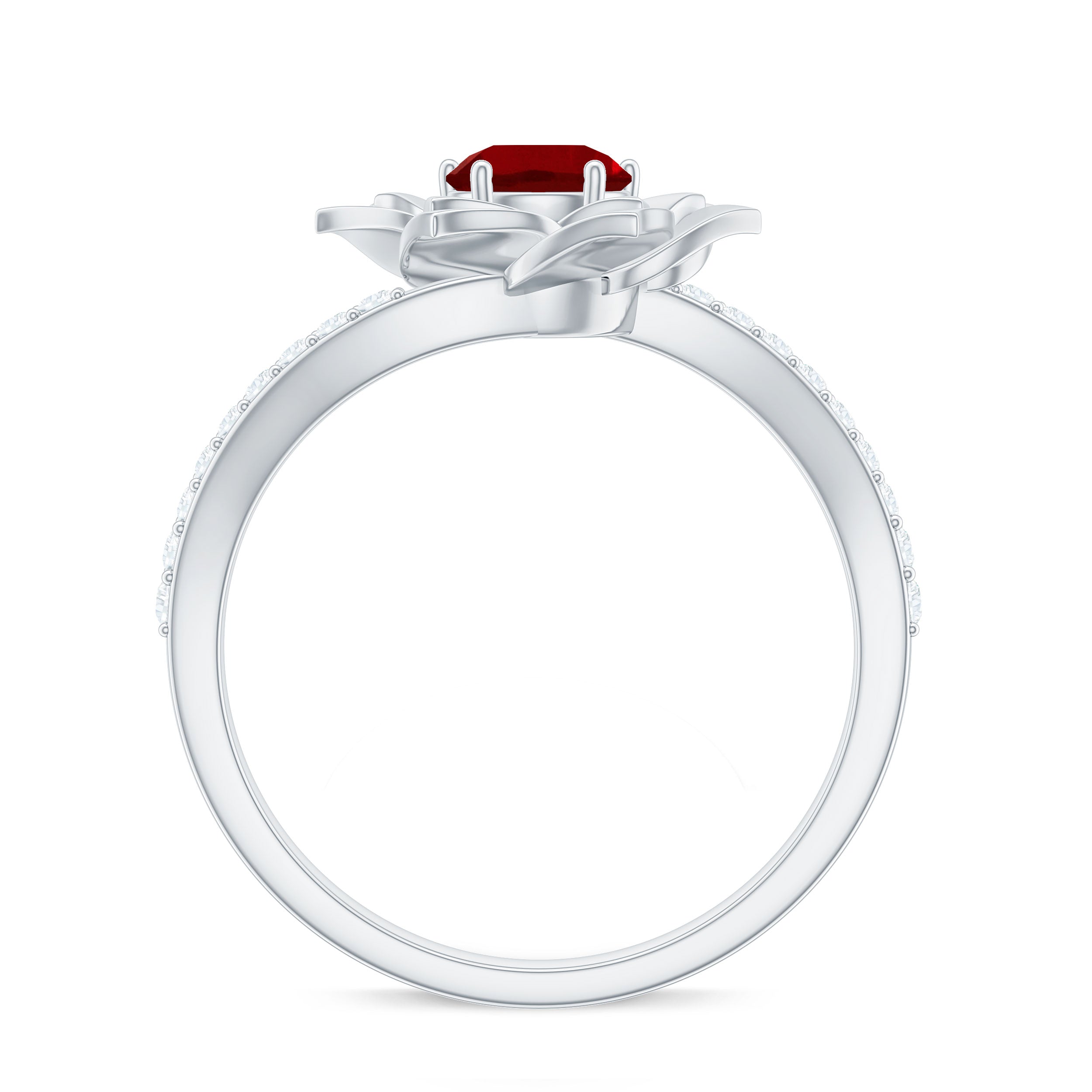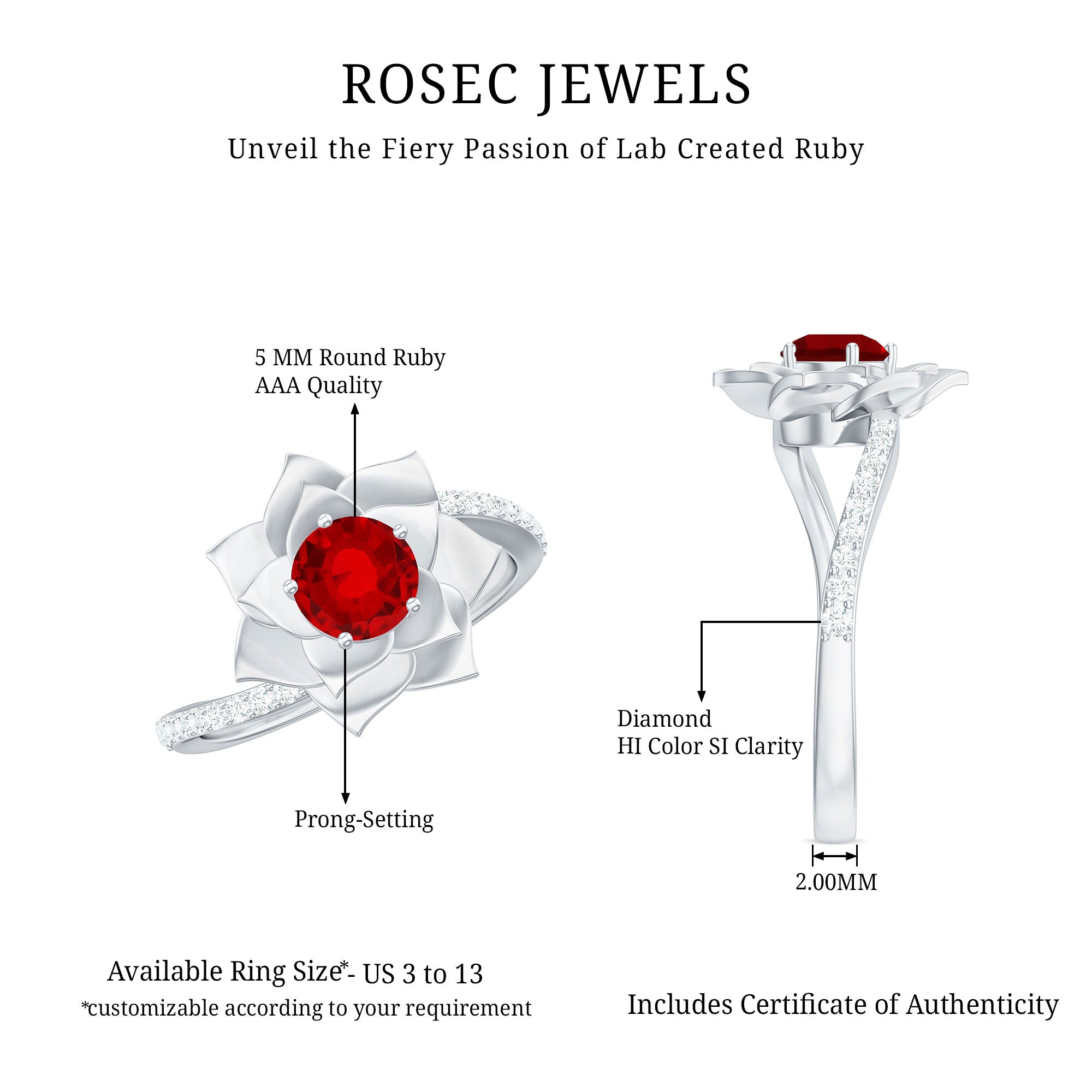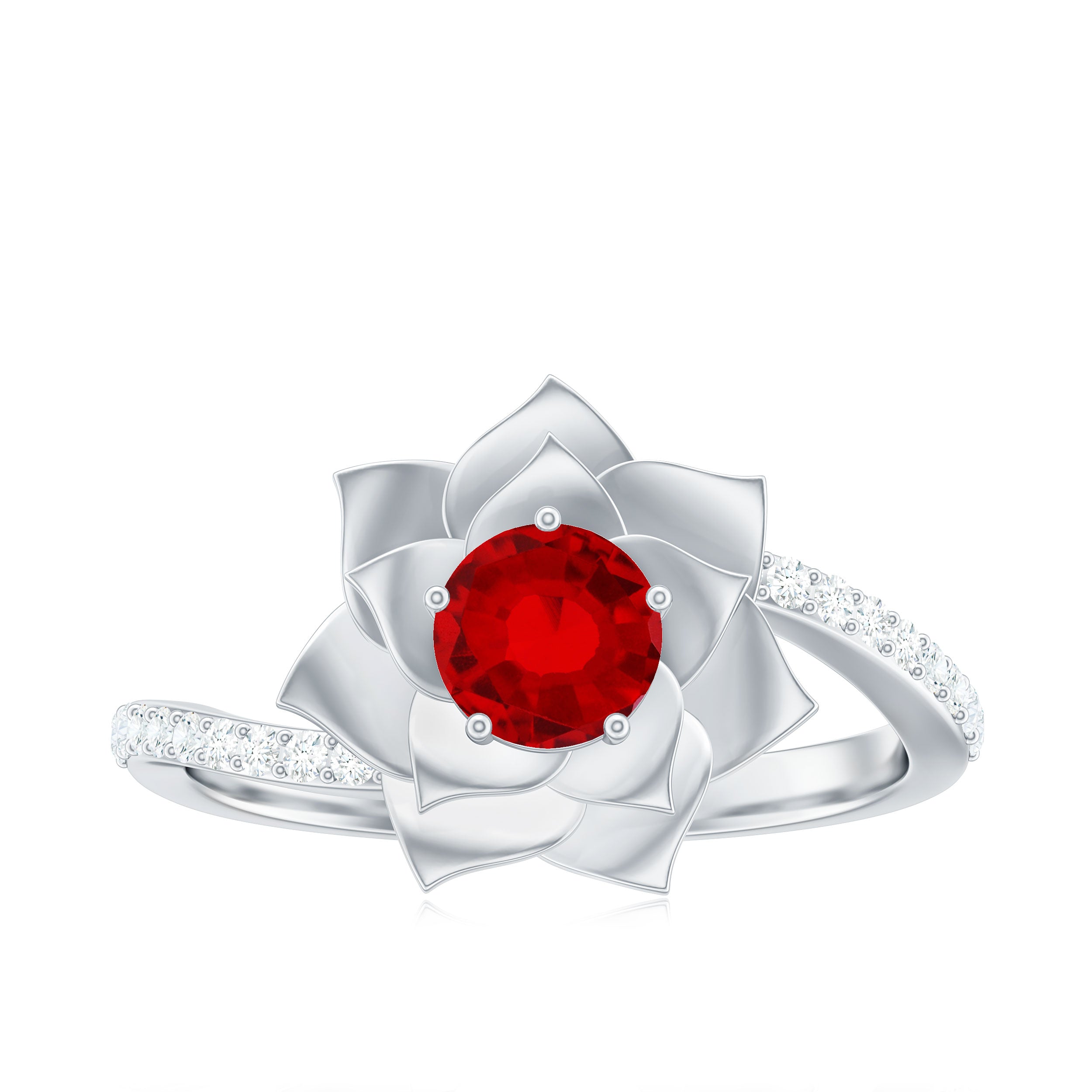 Celebrate love and elegance with this beautifully designed Rose Flower Engagement Ring, a piece that combines artistry and timeless charm. It features a 5 MM round cut lab grown ruby, held securely in a prong setting and surrounded by delicate metal petals that form a blooming rose. The bypass shank gracefully curves around the central flower, creating a flowing look that mirrors the beauty of nature. Along the curves of the band, sparkling round diamonds add subtle brilliance, enhancing the ruby’s vibrant color. The combination of the fiery ruby and glimmering diamonds achieves a perfect harmony of boldness and delicacy. Inspired by the elegance of nature, this Ruby and Diamond Engagement Ring is ideal for someone who loves jewelry with artistic details and a meaningful design. The Floral Engagement Ring is designed for comfort and crafted to fit beautifully, available in US sizes 3 to 13, making it suitable for everyday wear while still standing out as a statement piece. Presented in a beautifully packaged box, this Lab Created Ruby Ring is ready to gift or keep as a cherished keepsake.