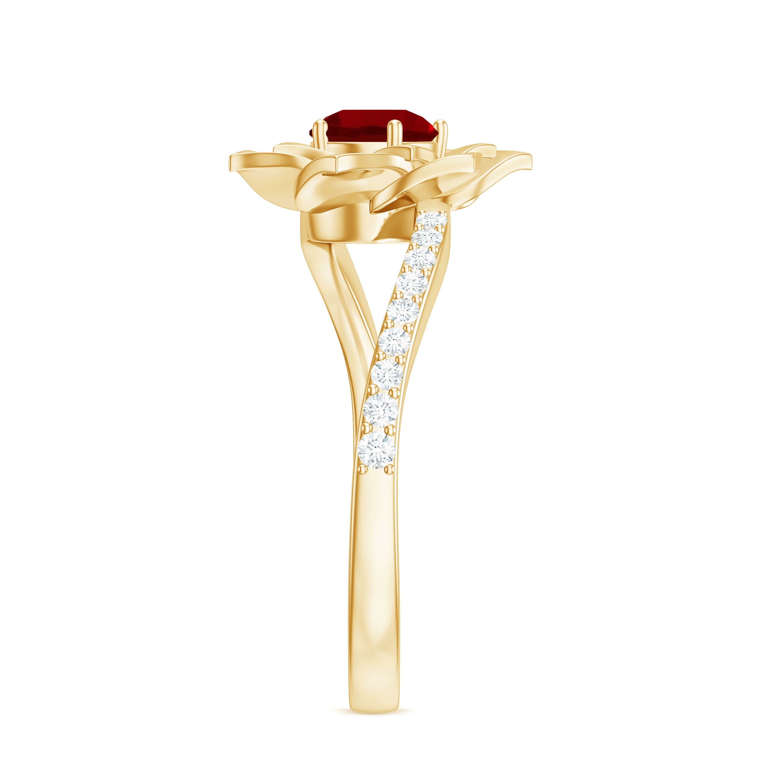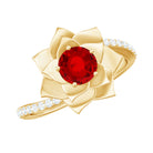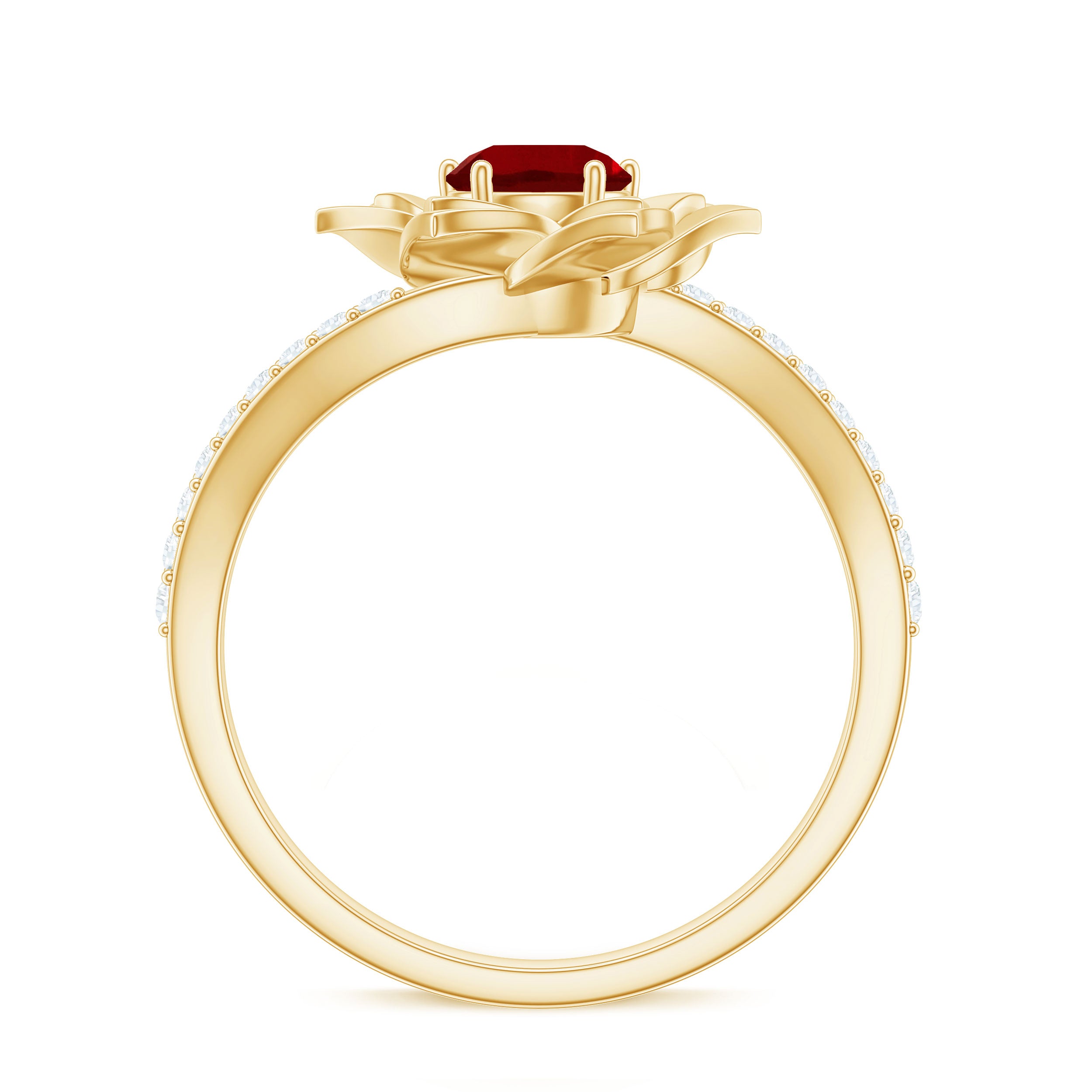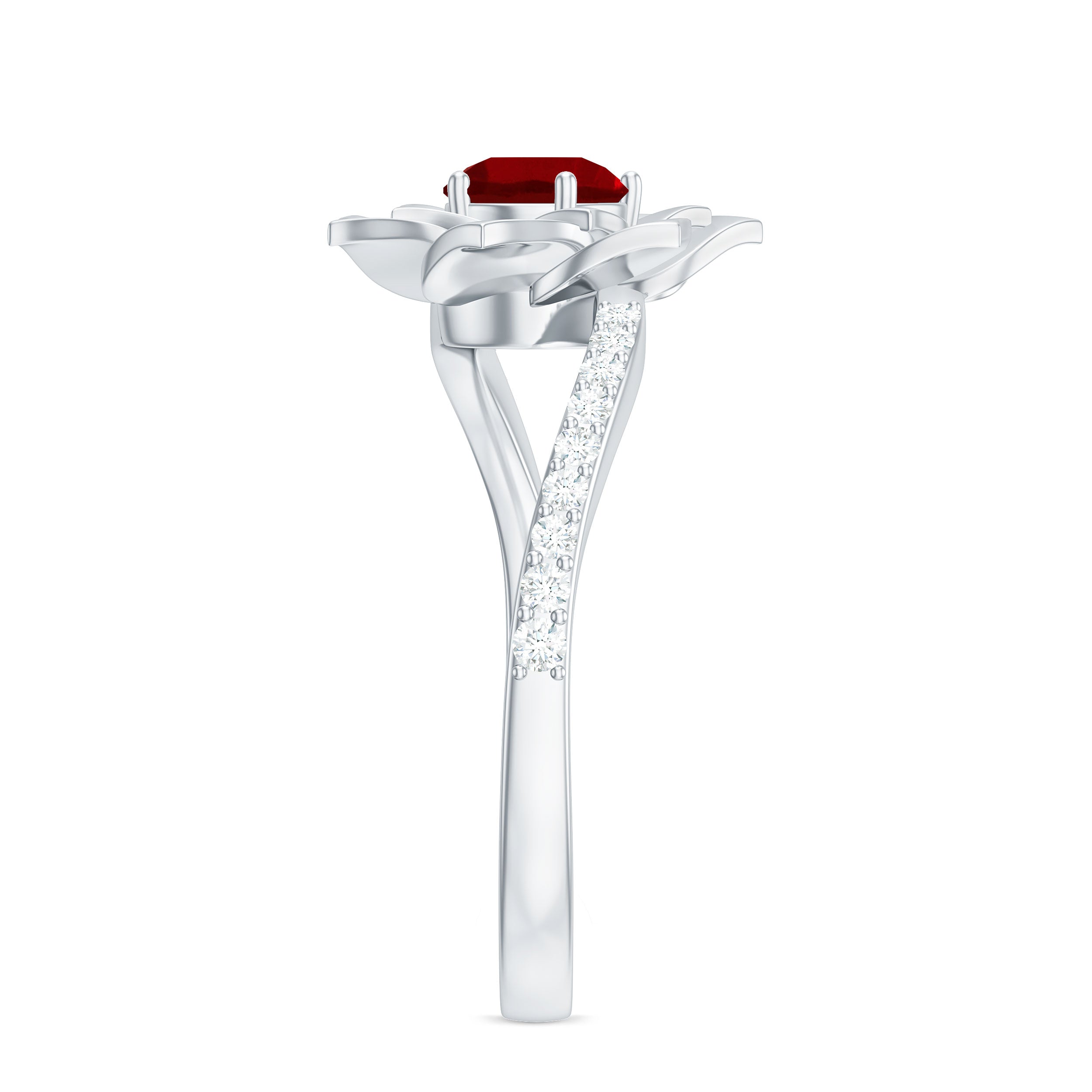 Celebrate love and elegance with this beautifully designed Rose Flower Engagement Ring, a piece that combines artistry and timeless charm. It features a 5 MM round cut lab grown ruby, held securely in a prong setting and surrounded by delicate metal petals that form a blooming rose. The bypass shank gracefully curves around the central flower, creating a flowing look that mirrors the beauty of nature. Along the curves of the band, sparkling round diamonds add subtle brilliance, enhancing the ruby’s vibrant color. The combination of the fiery ruby and glimmering diamonds achieves a perfect harmony of boldness and delicacy. Inspired by the elegance of nature, this Ruby and Diamond Engagement Ring is ideal for someone who loves jewelry with artistic details and a meaningful design. The Floral Engagement Ring is designed for comfort and crafted to fit beautifully, available in US sizes 3 to 13, making it suitable for everyday wear while still standing out as a statement piece. Presented in a beautifully packaged box, this Lab Created Ruby Ring is ready to gift or keep as a cherished keepsake.