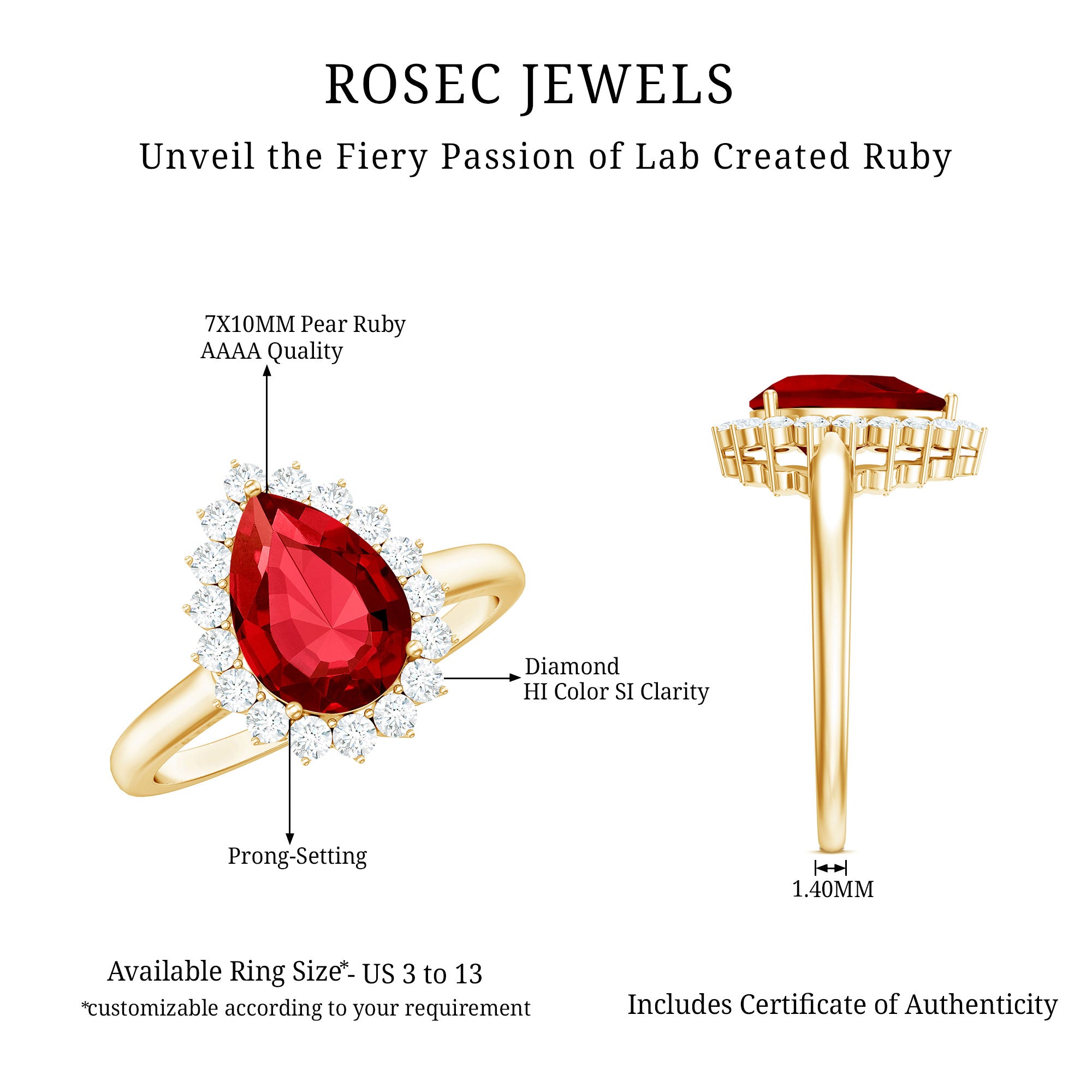 Shine and steal the show with this dazzling Teardrop Ring. Featuring a pear-cut created ruby and round Diamond in a Halo, this halo ring exudes glamour.