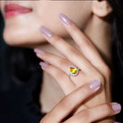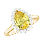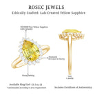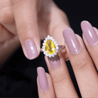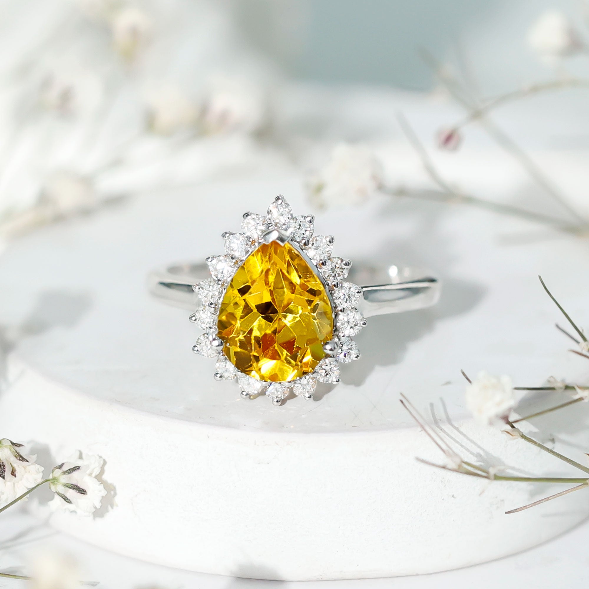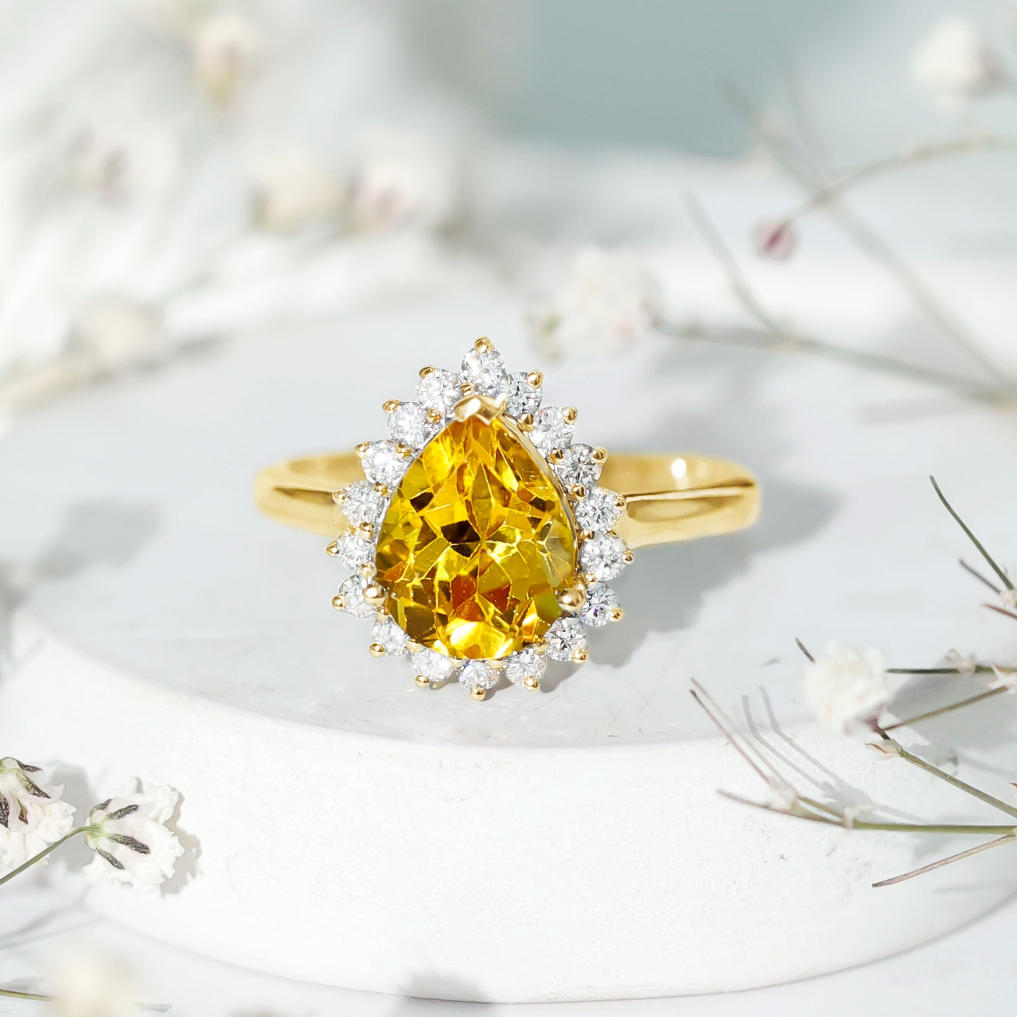 This exquisite Teardrop Ring is destined to steal the spotlight. Its centerpiece boasts a pear-cut created yellow sapphire, encircled by shimmering round Diamond stones in a halo, emanating pure glamour and brilliance.