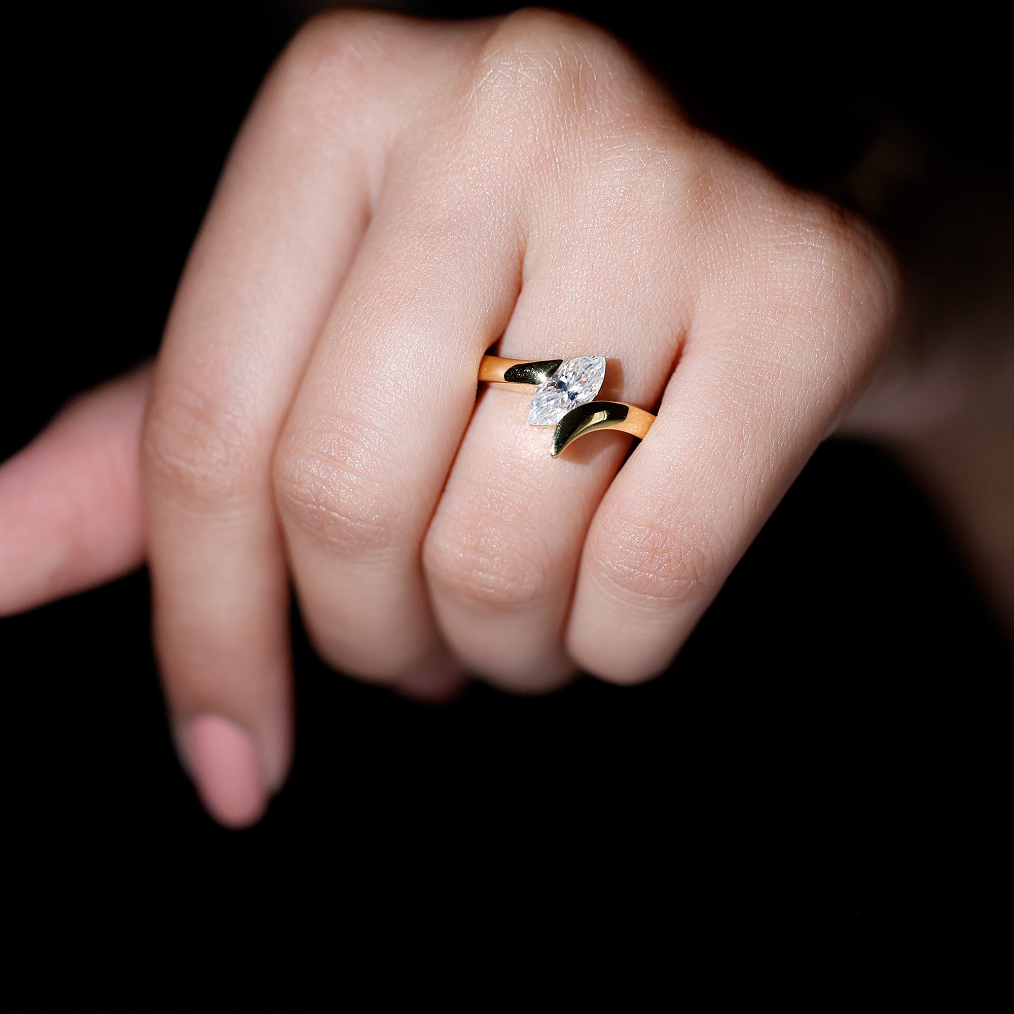 Handcrafted with perfection and care, this Solitaire Engagement Ring is a beautiful mix of elegance and modern style. The center features a sparkling 5X10 MM Marquise Shape Lab Grown Diamond set in Tension Mount Setting, known for its eye-catching, elongated shape that makes the finger look graceful and slender. The Lab Diamond is set in a Bypass Band, where the two ends of the ring curve gently around the stone, symbolizing two lives coming together. It is a simple yet meaningful design that feels special from every angle. Made with EF-VS Quality Lab Grown Diamond, this Marquise Engagement Ring offers brilliant shine. The Bypass Band adds a modern twist to the classic look, making it perfect for someone who loves a little something different. Whether it is for an engagement, a promise, or just to celebrate yourself, this Lab Diamond Engagement Ring is a lovely choice. This 1 Carat Lab Grown Diamond Ring is available in US sizes 3 to 13, so you will find the perfect fit, and it comes packed in a beautiful jewelry box, ready to gift or keep safe. Elegant, comfortable, and full of meaning, this Ethical Diamond Ring is made for someone who loves timeless beauty with a modern edge.