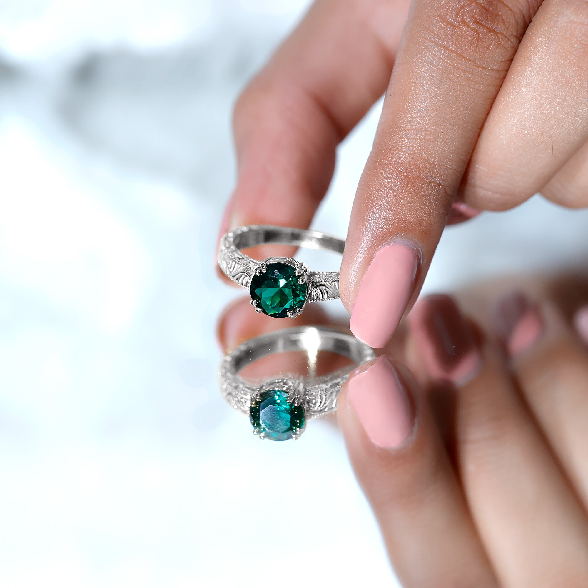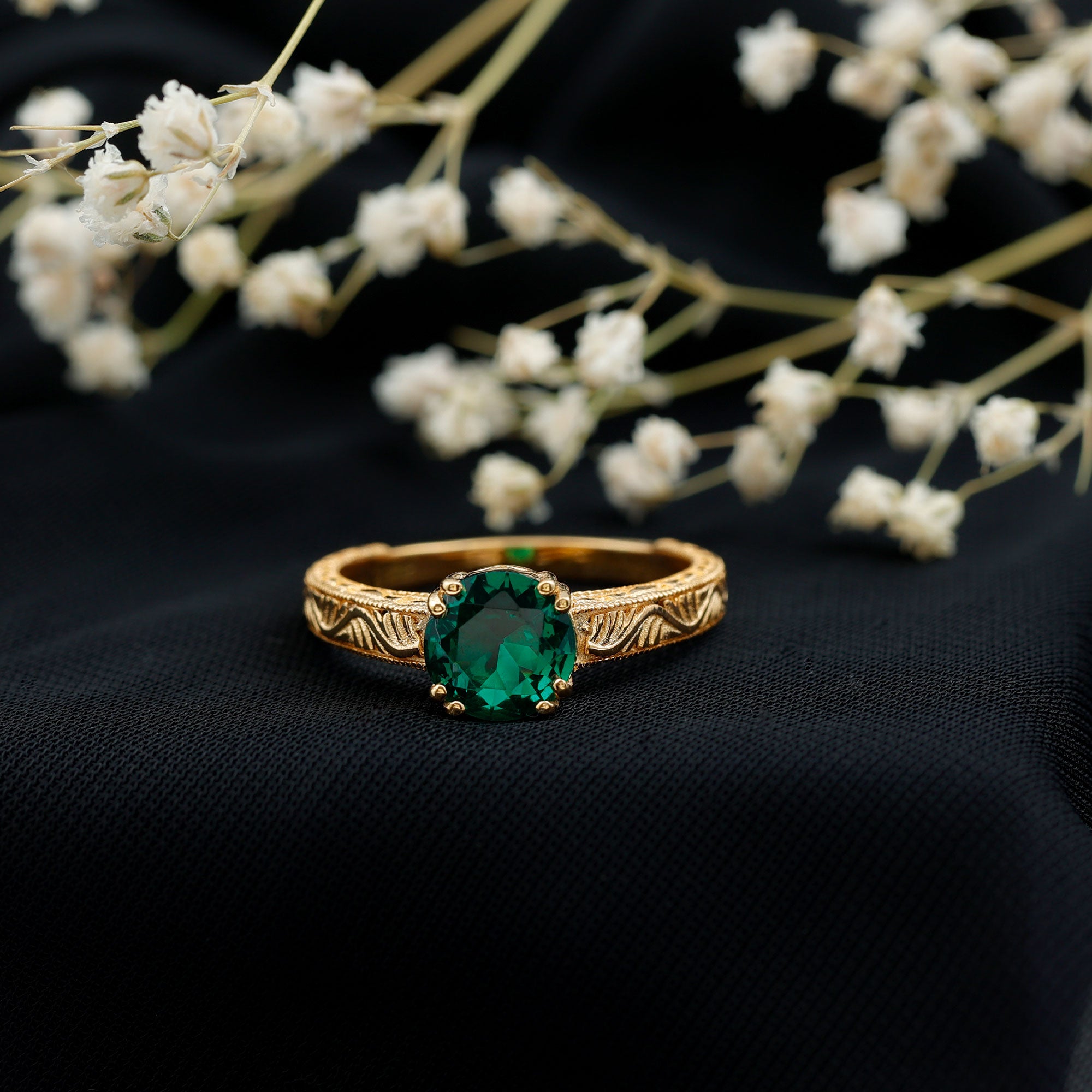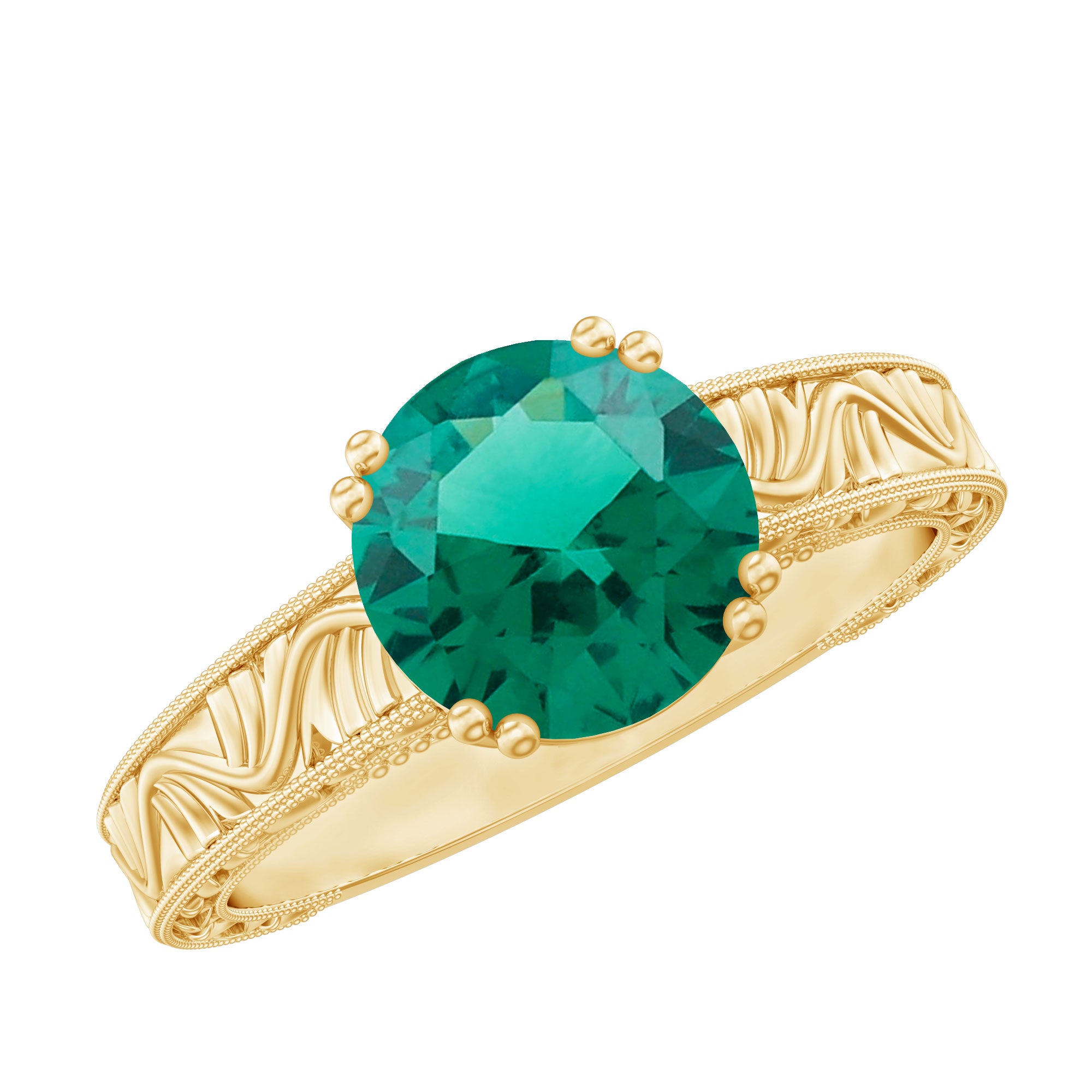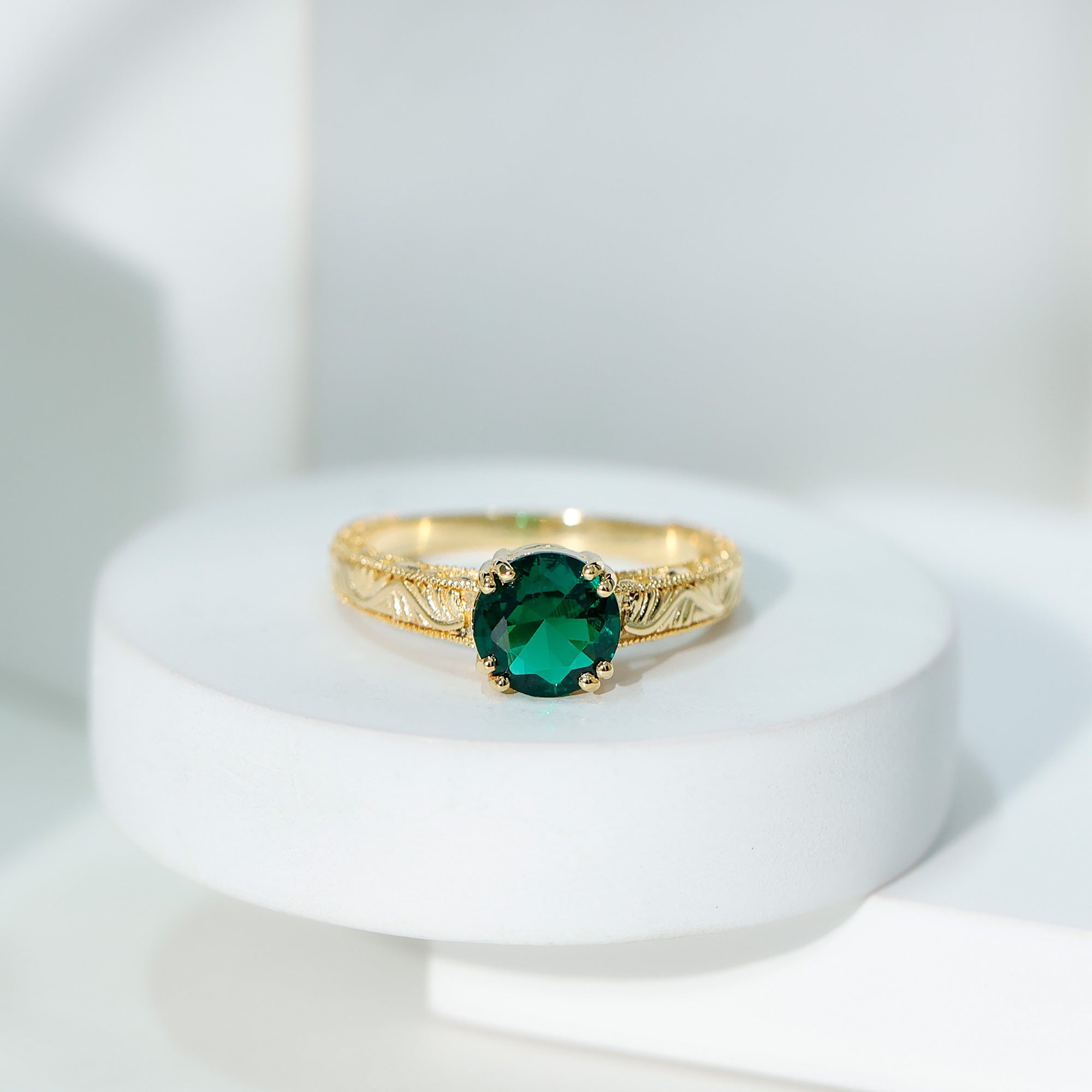 Elevate your style with this stunning Lab Created Emerald Ring, featuring an 8 MM round-cut lab created emerald in a double prong setting on a classic solitaire ring. This enchanting ring is made for a perfect timeless jewelry piece and an excellent gift for your loved one. This Emerald Engagement Ring reflects the brilliance with its vintage inspired design. The shank of this Vintage Emerald Ring has a milgrain design at the edges with engraved details. Your lady will be astonished by the unmatchable shine of AAAA Quality Lab Grown Emerald. Your purchase will include a signature jewelry box with a certificate of gemstone authentication.