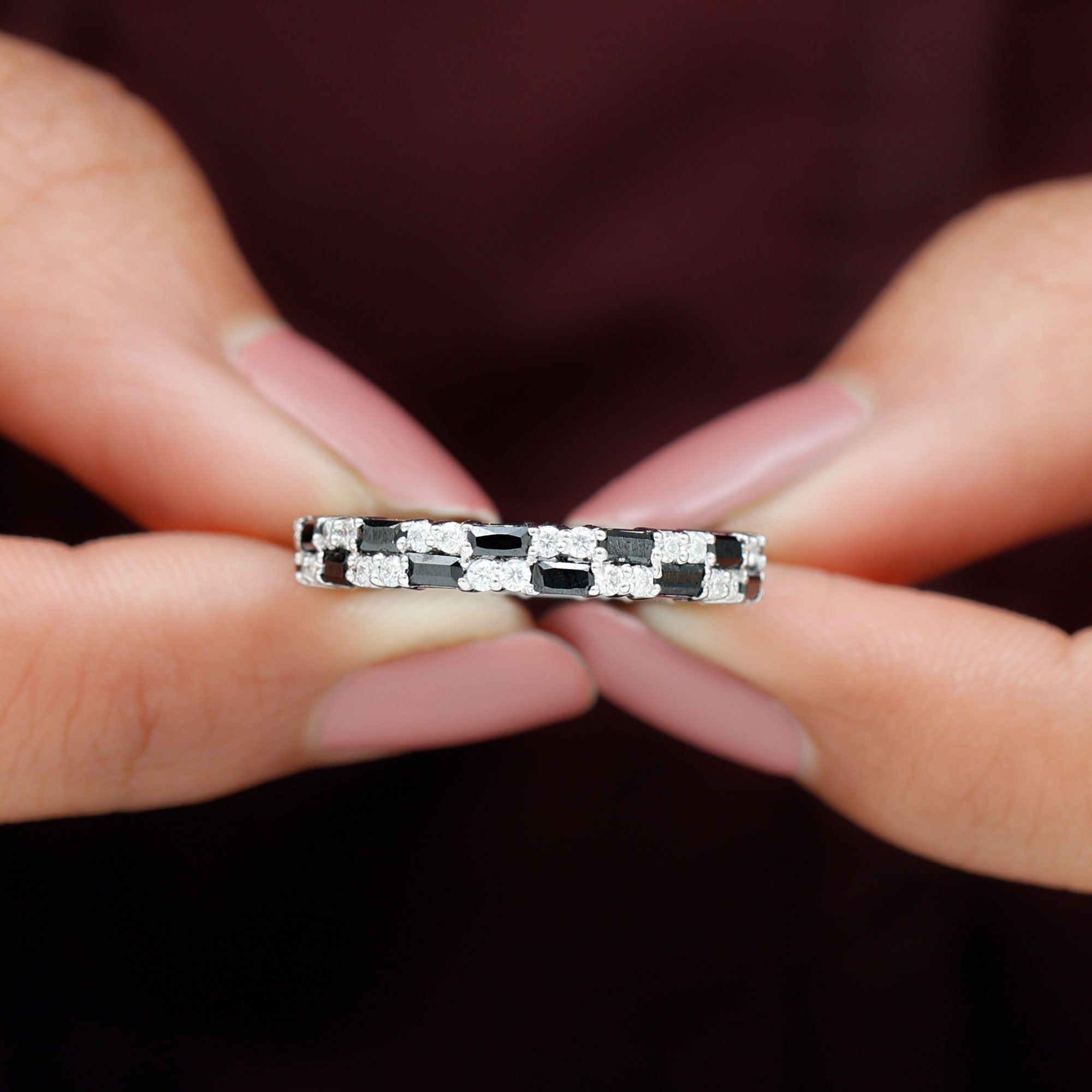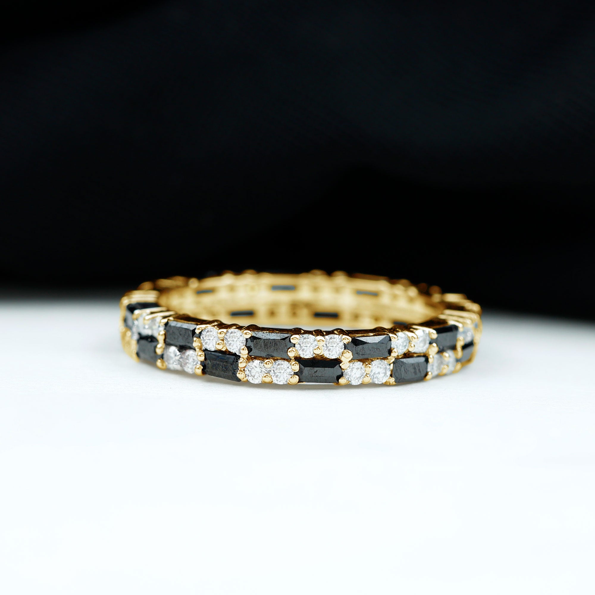 Experience the pinnacle of love with this exquisitely elegant Eternity Ring, adorned with mesmerizing Baguette Shape Lab Created Black Diamond and scintillating Round Shape Diamond stones, all delicately set in a prong setting. This Full Eternity Ring symbolizes everlasting affection and showcases a timeless beauty that will leave a lasting impression. Let your love shine brilliantly with this enchanting piece of jewelry, a true testament to your enduring devotion.