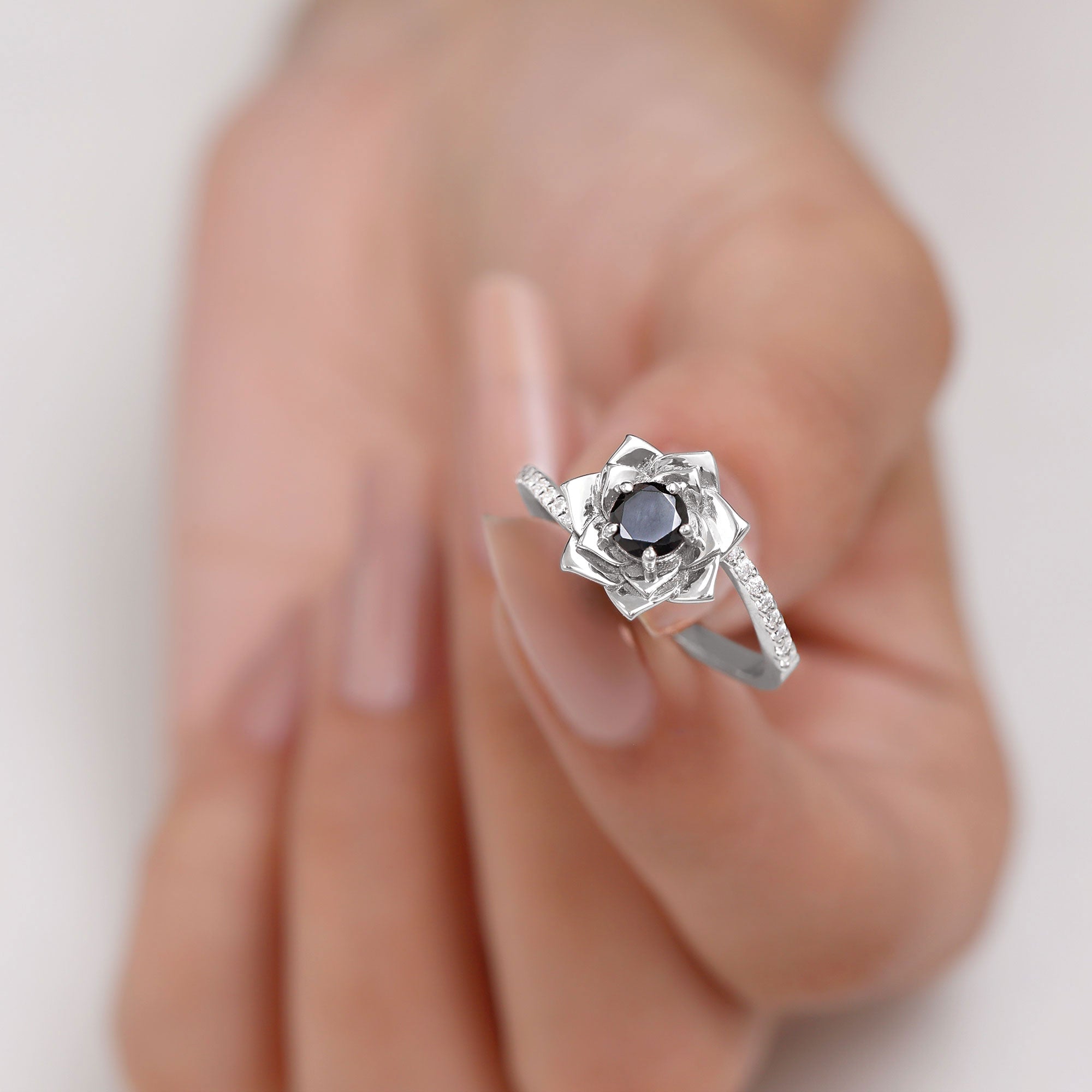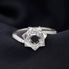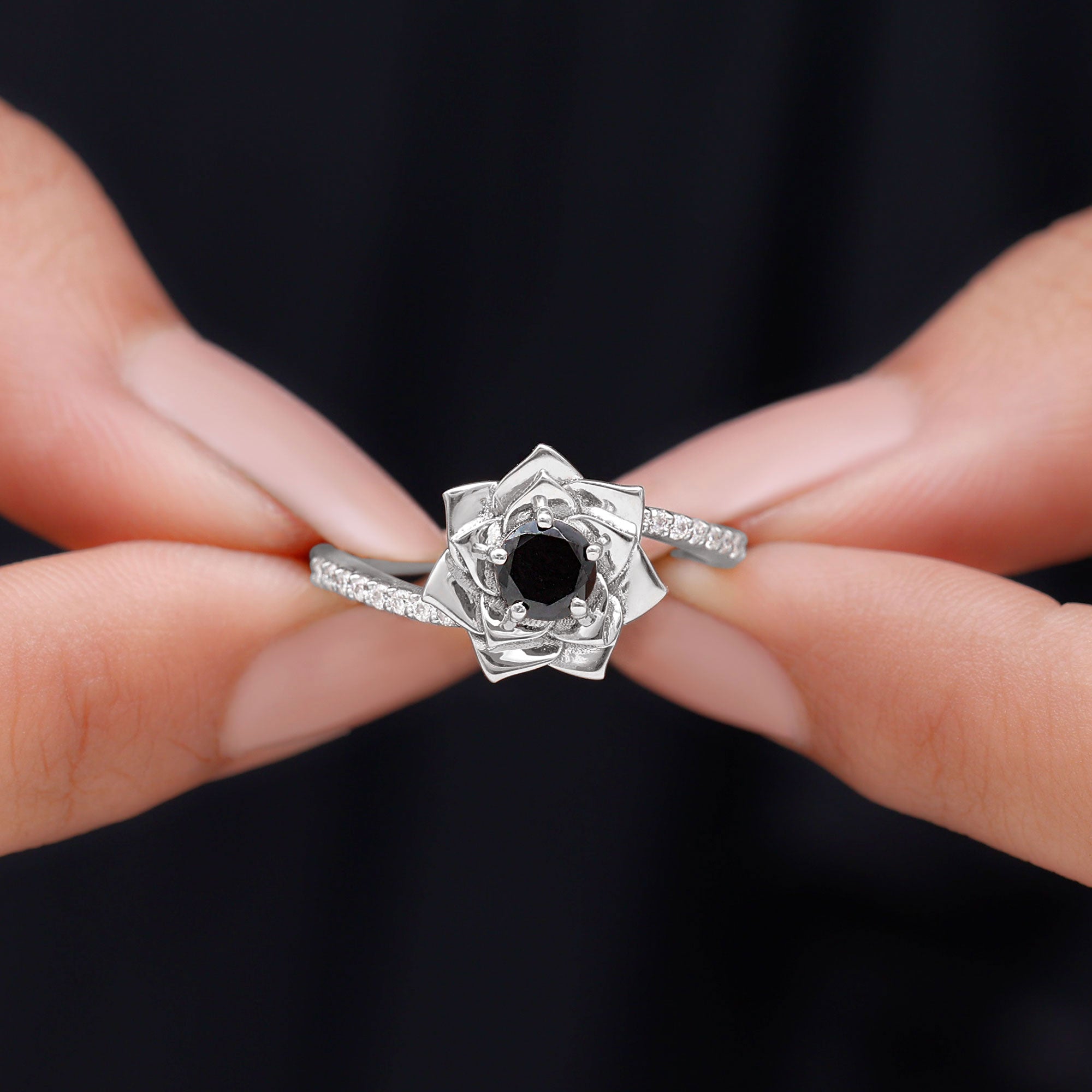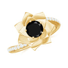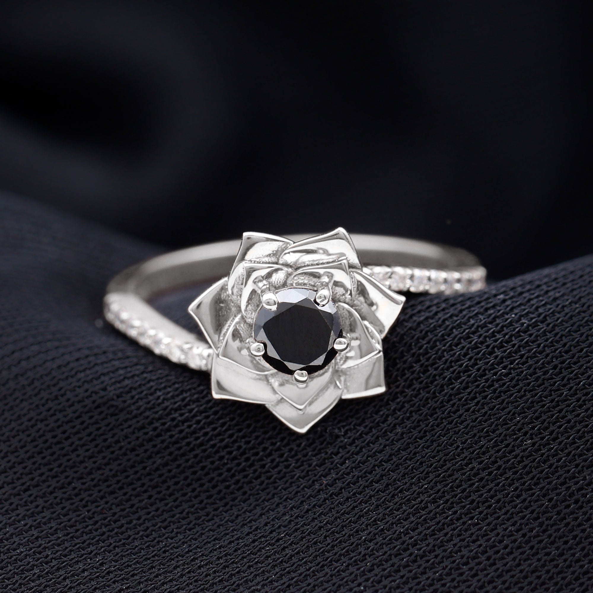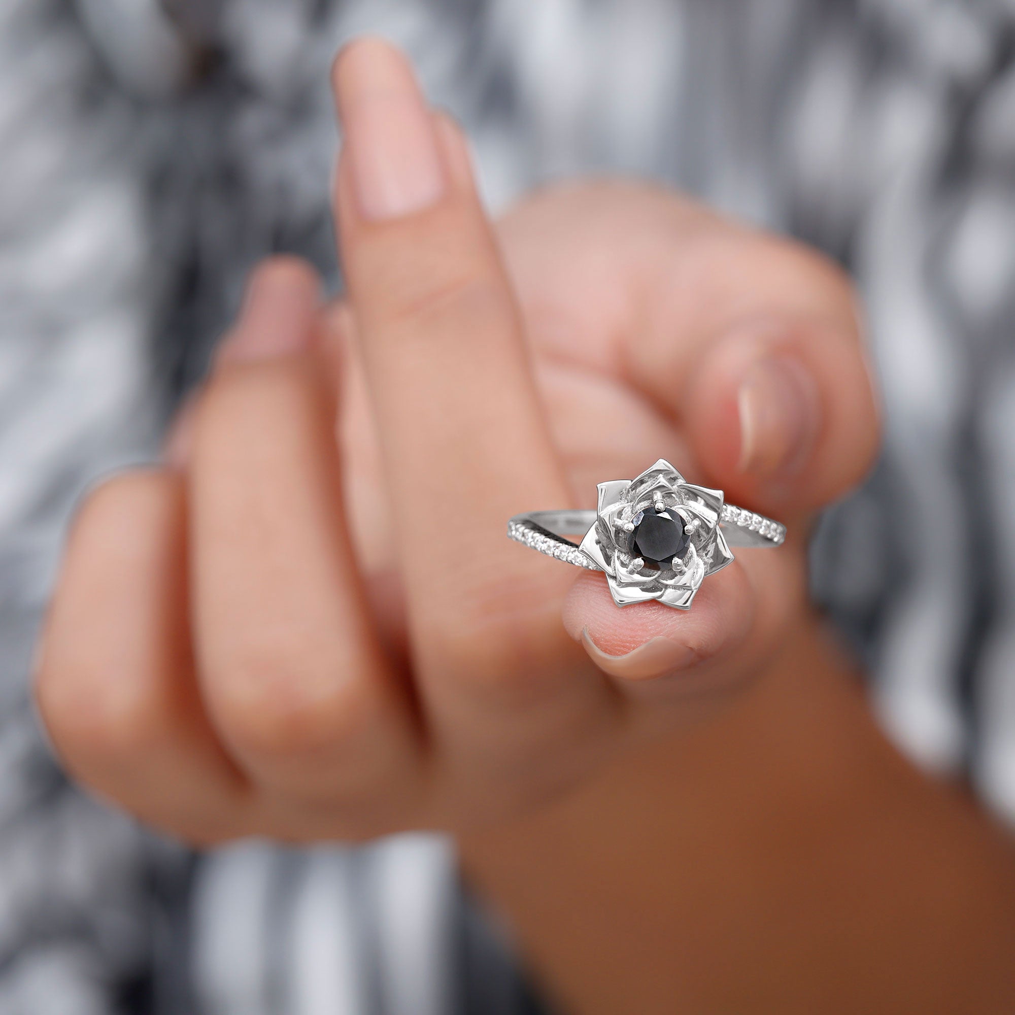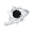 Make a bold statement with this exquisite Flower Engagement Ring adorned with a Round Shape Lab Created Black Diamond as the striking solitaire, surrounded by shimmering Diamond in a prong setting. The Bypass Shank design adds a touch of elegance to this captivating ring.