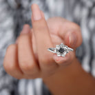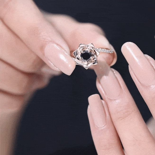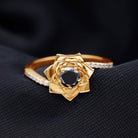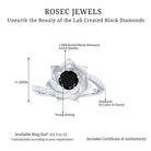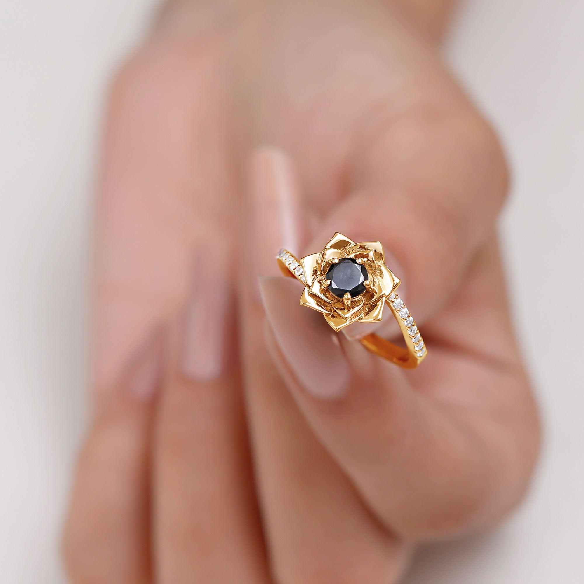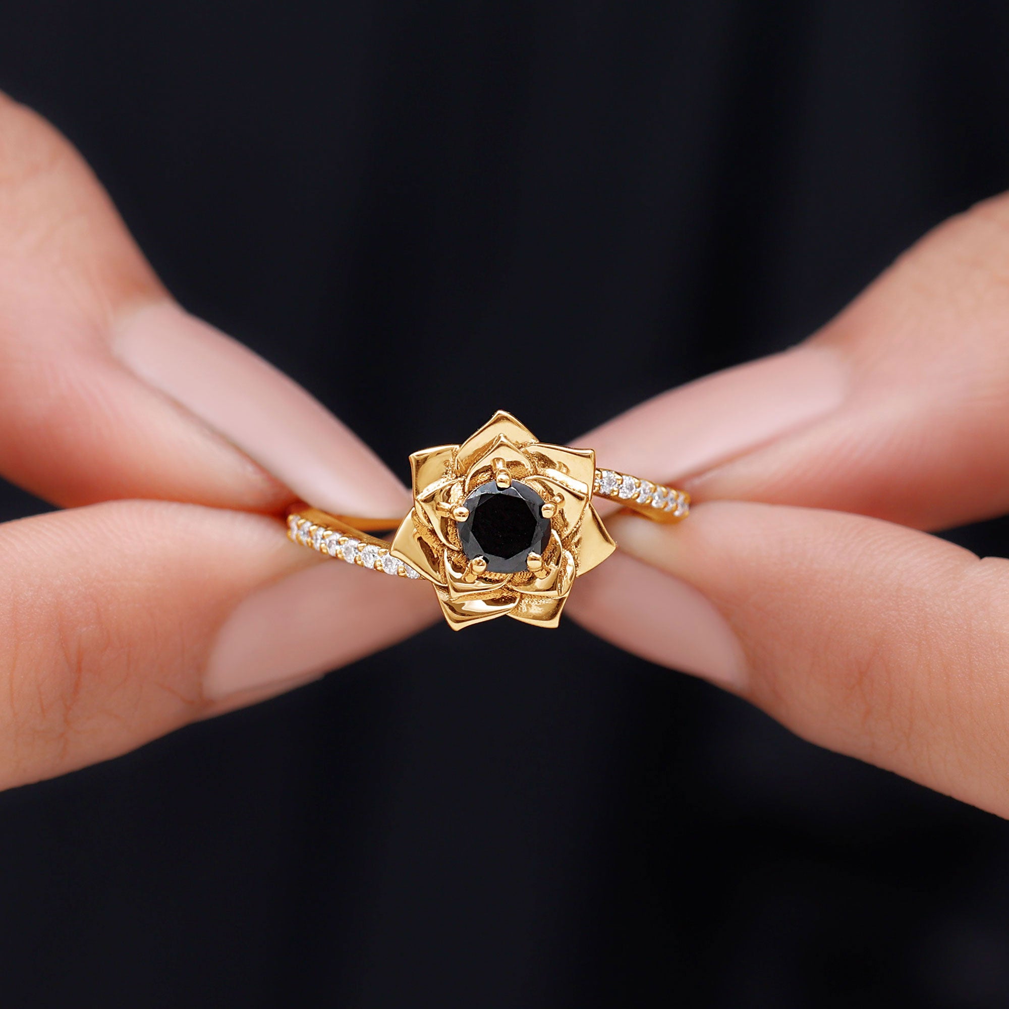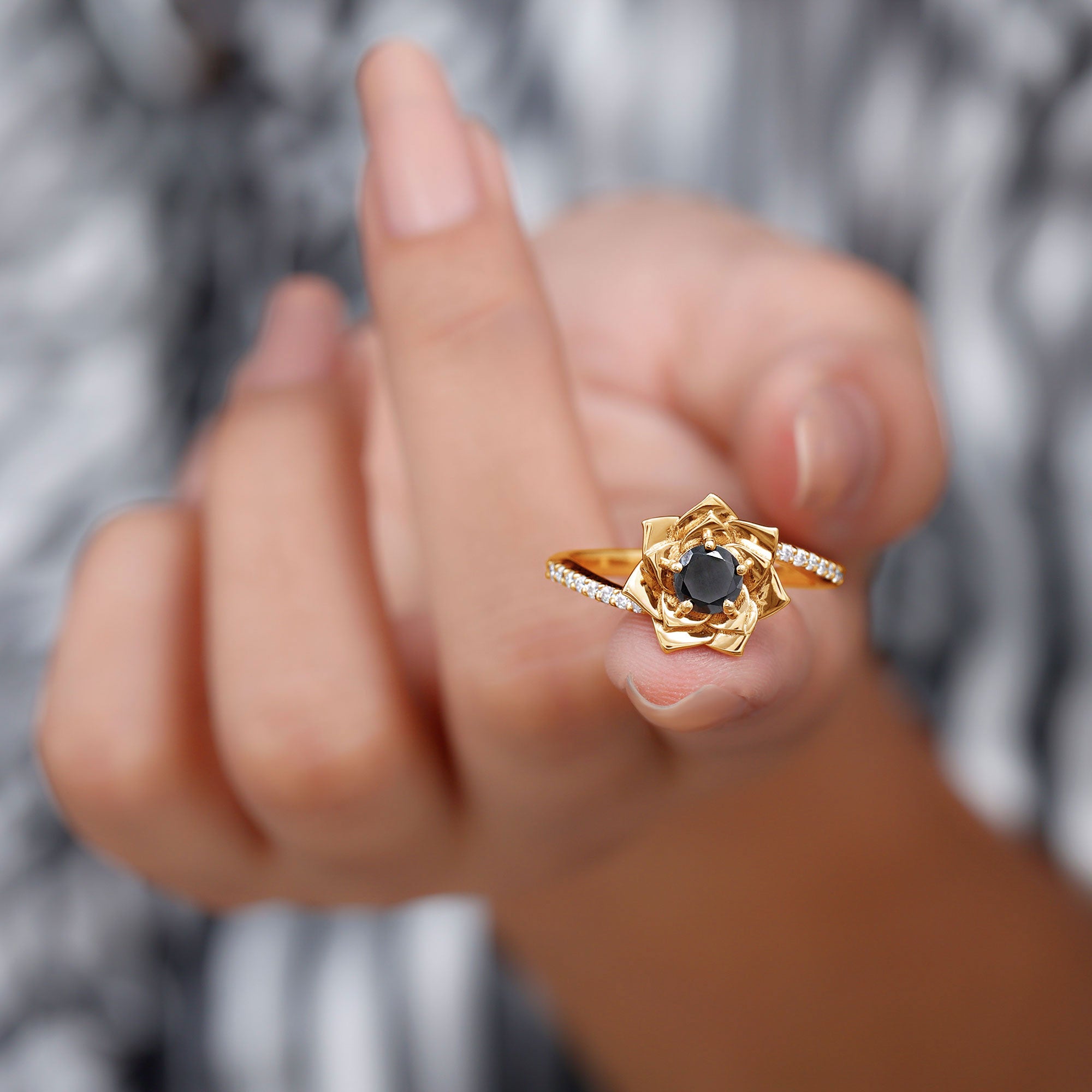 Make a bold statement with this exquisite Flower Engagement Ring adorned with a Round Shape Lab Created Black Diamond as the striking solitaire, surrounded by shimmering Diamond in a prong setting. The Bypass Shank design adds a touch of elegance to this captivating ring.